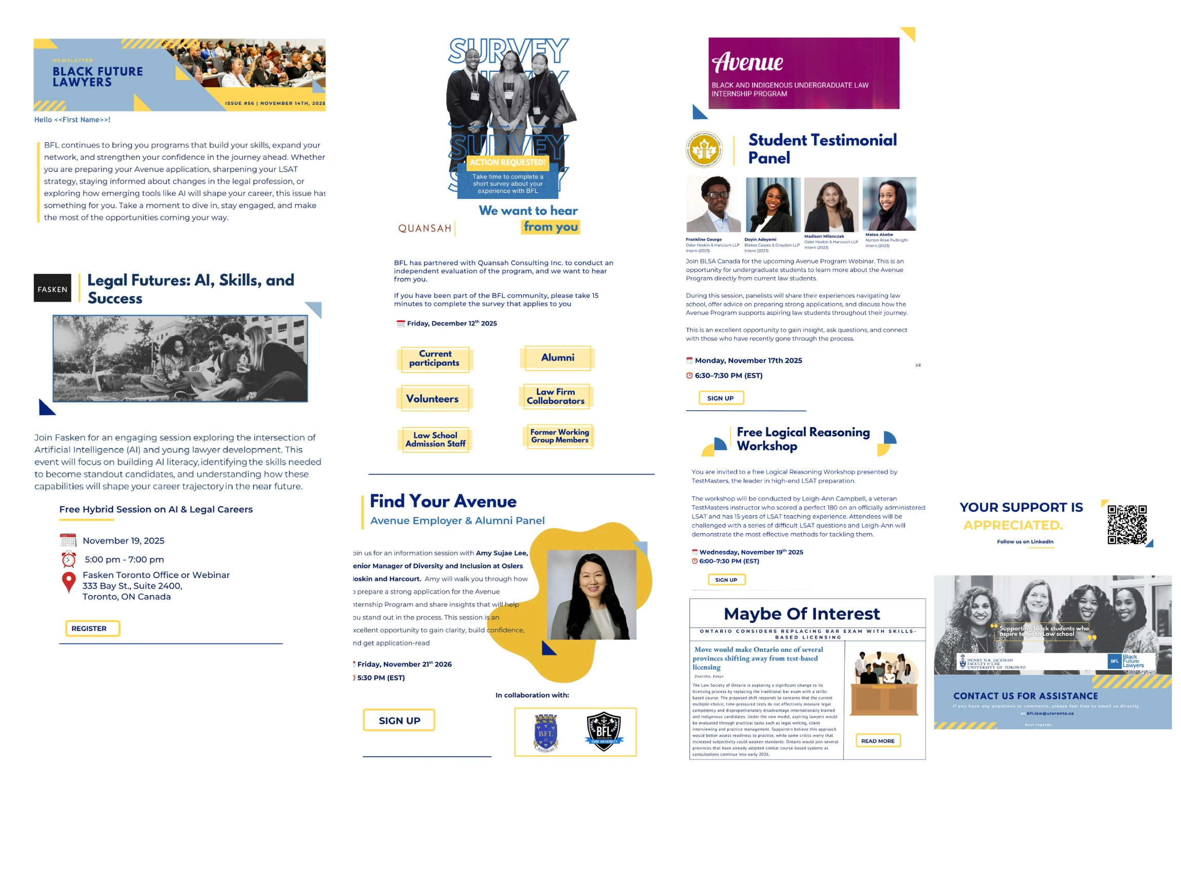 I reimagined BFL’s email communication by designing messages that read like stories instead of announcements. Each email uses a structured layout, intentional copy, and approachable design choices to highlight opportunities in a way that feels relevant and engaging. The result is communication that students notice, understand, and act on.