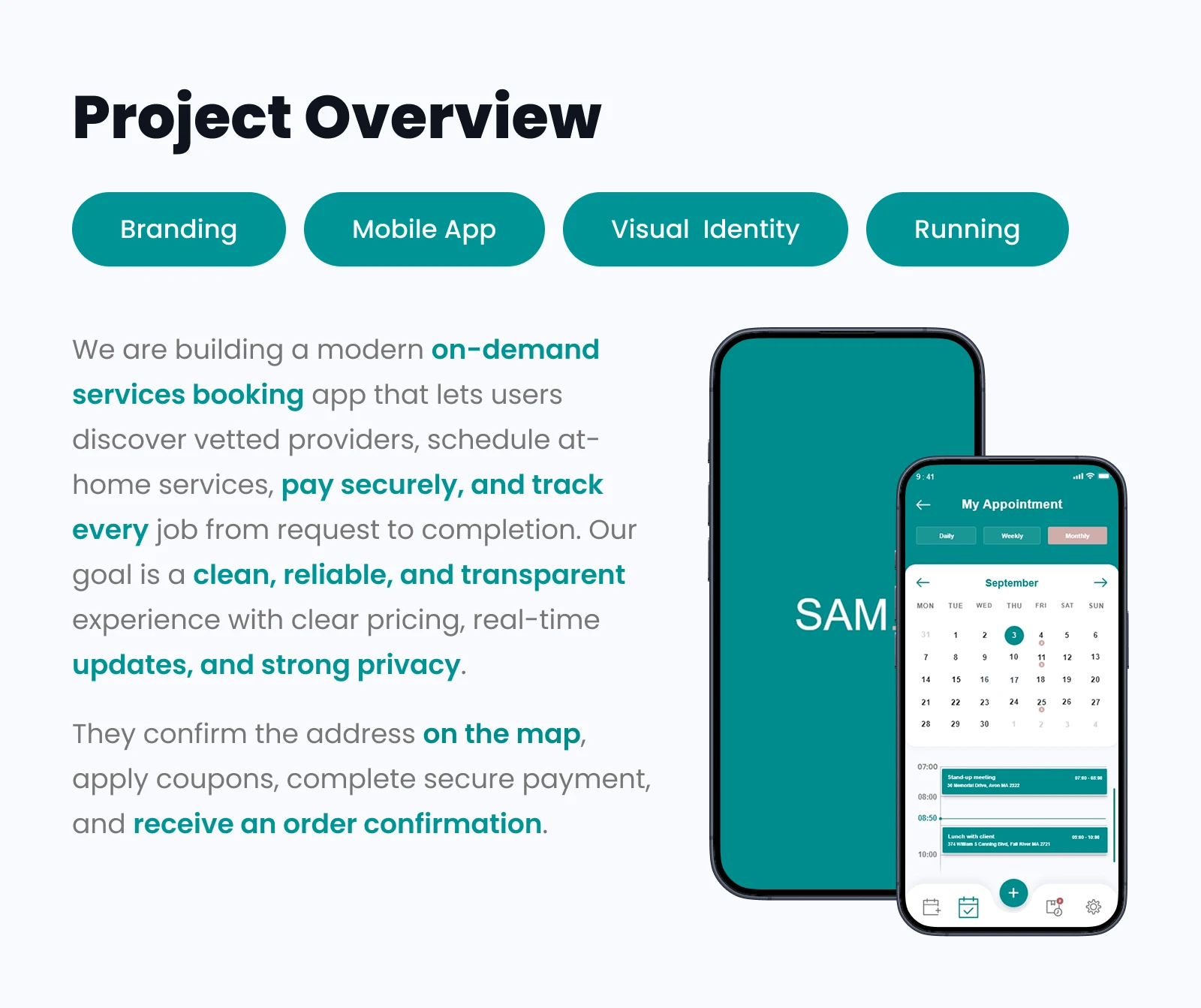 A modern on-demand services app where users can find vetted providers, schedule at-home services, pay securely, and track every job from start to finish.