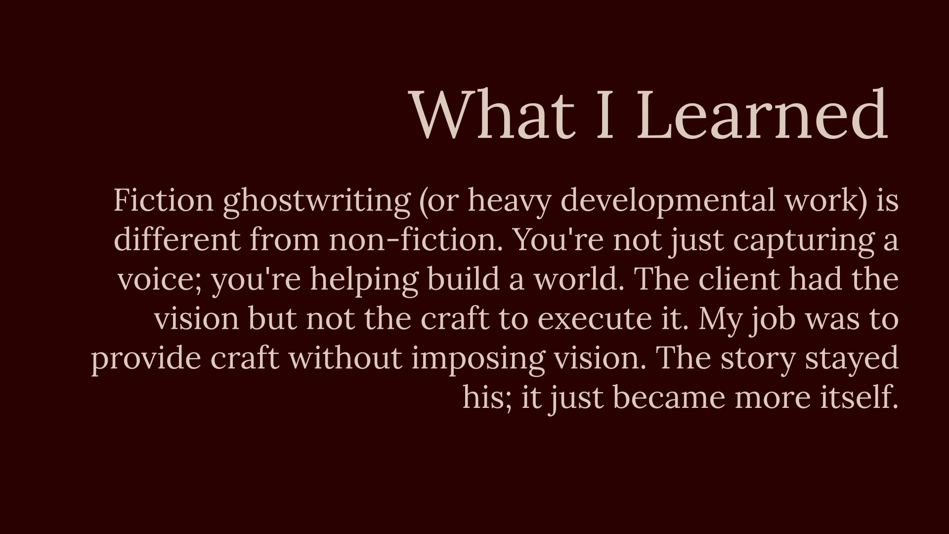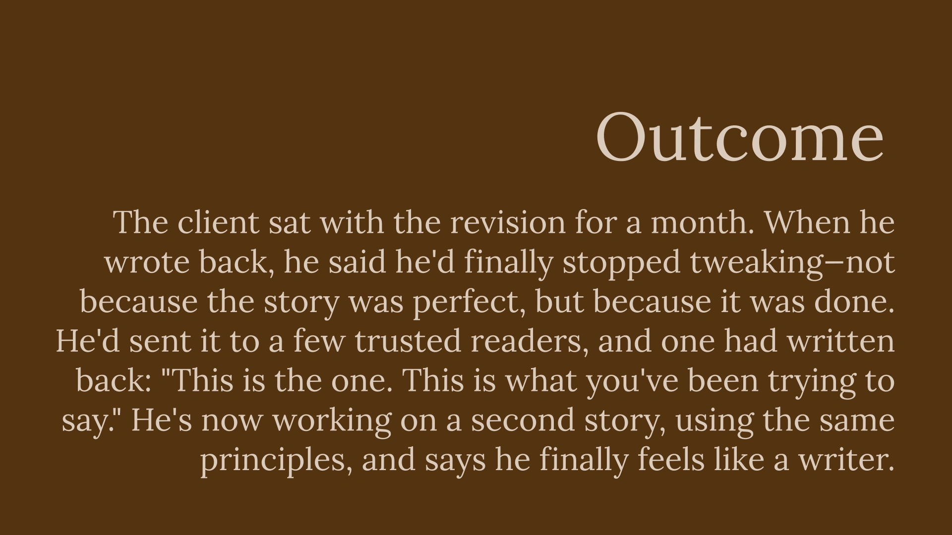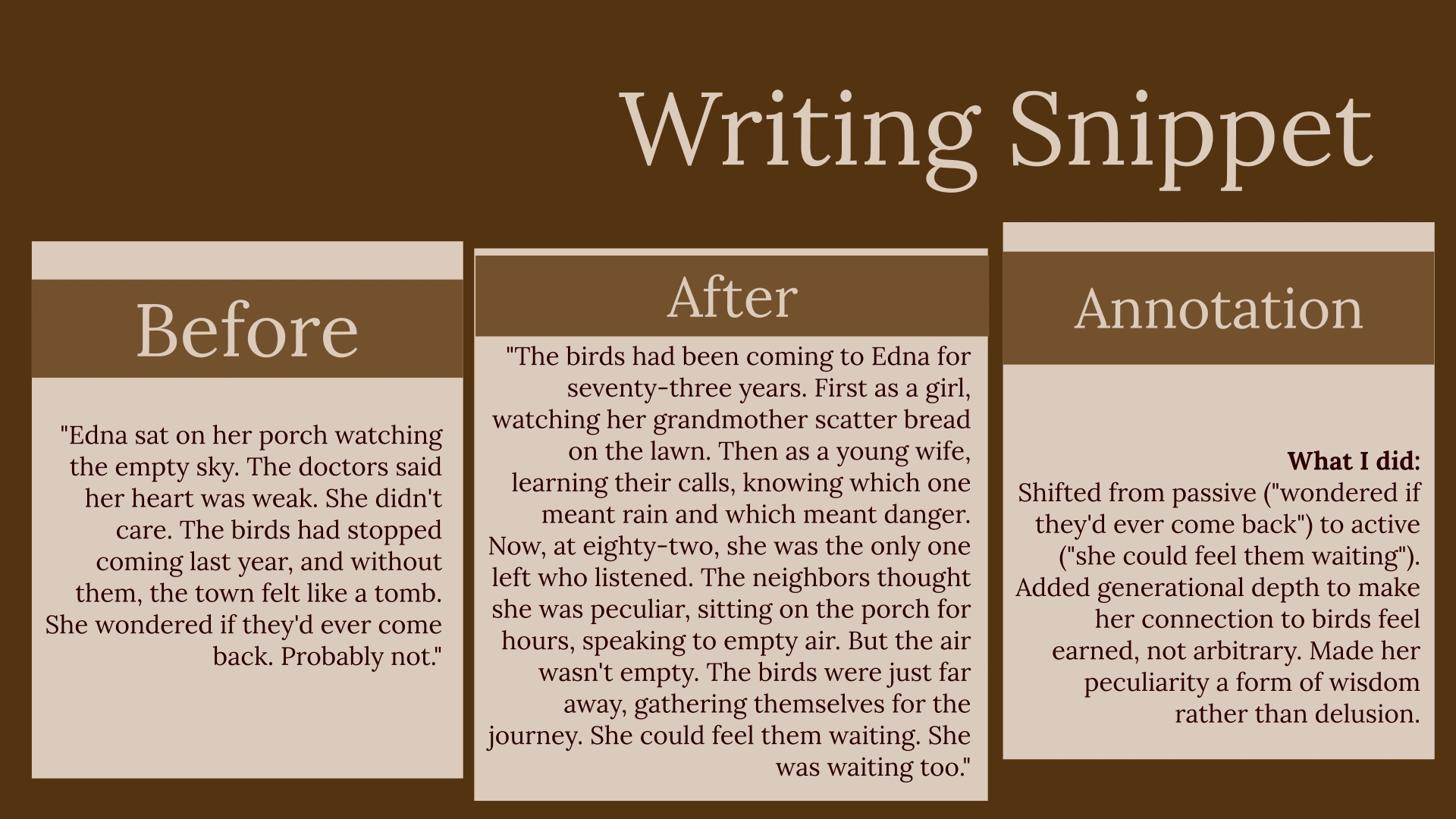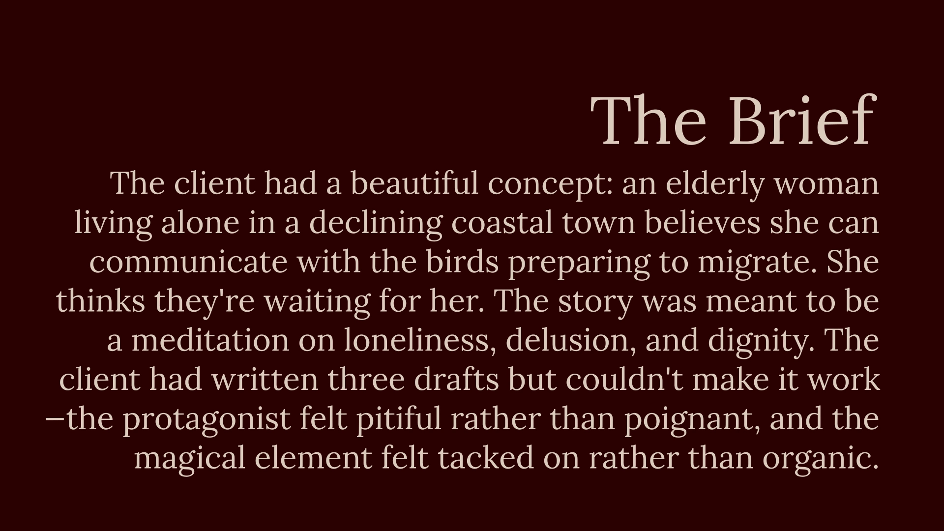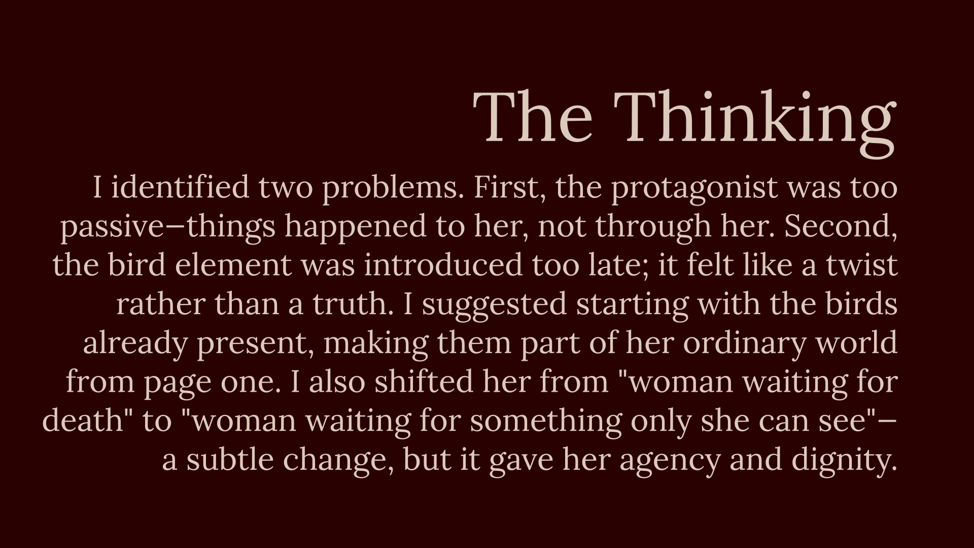 A struggling story found its protagonist's dignity through structural shifts, helping the writer believe in their own work.