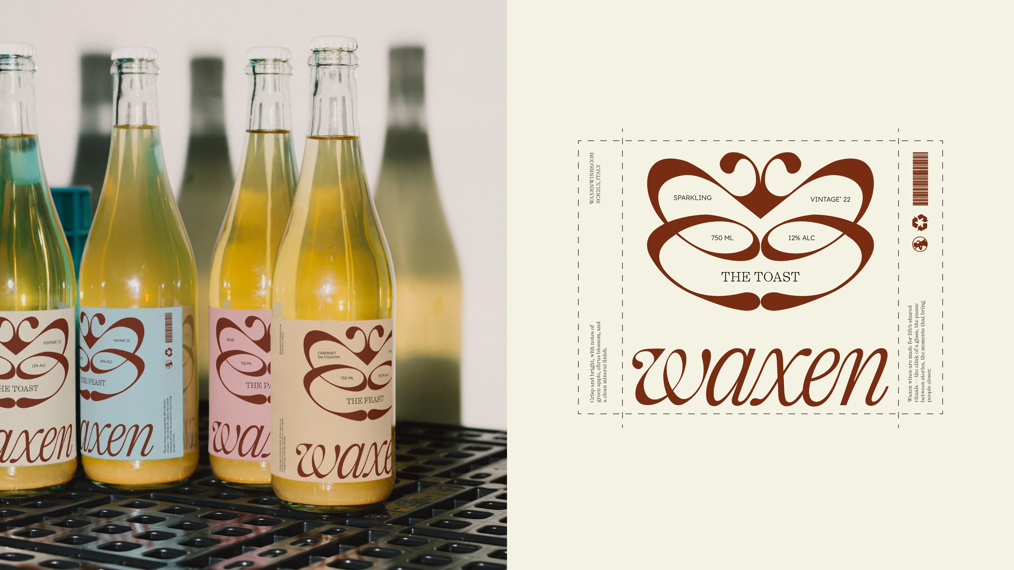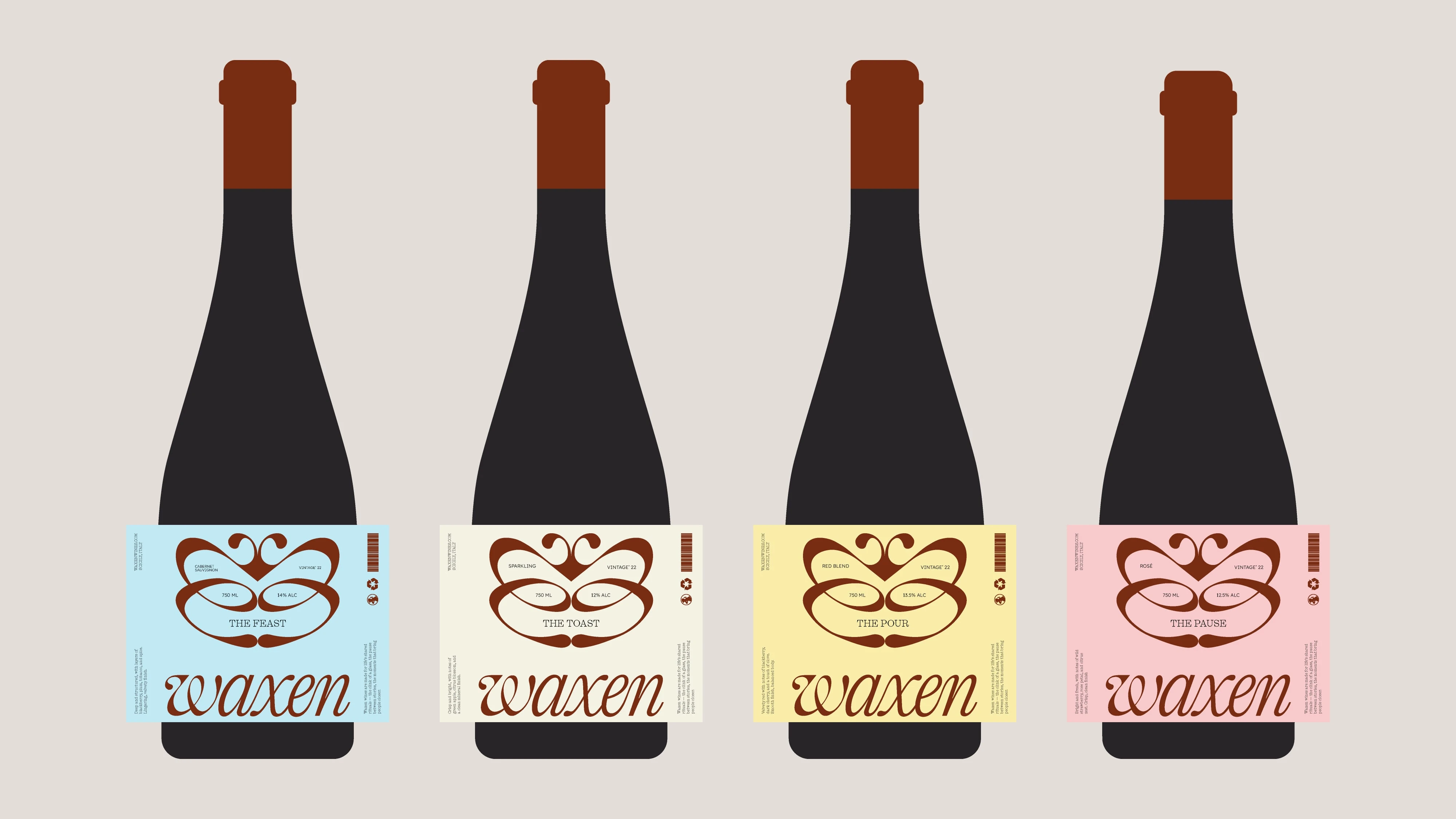 Waxen’s labels use a bold, unconventional layout designed to feel modern and distinct from traditional wine cues. Instead of ornate crests and crowded information, the design is stripped back: a large emblem wrapping the label, the wordmark anchoring the composition, and details set with clarity and restraint.