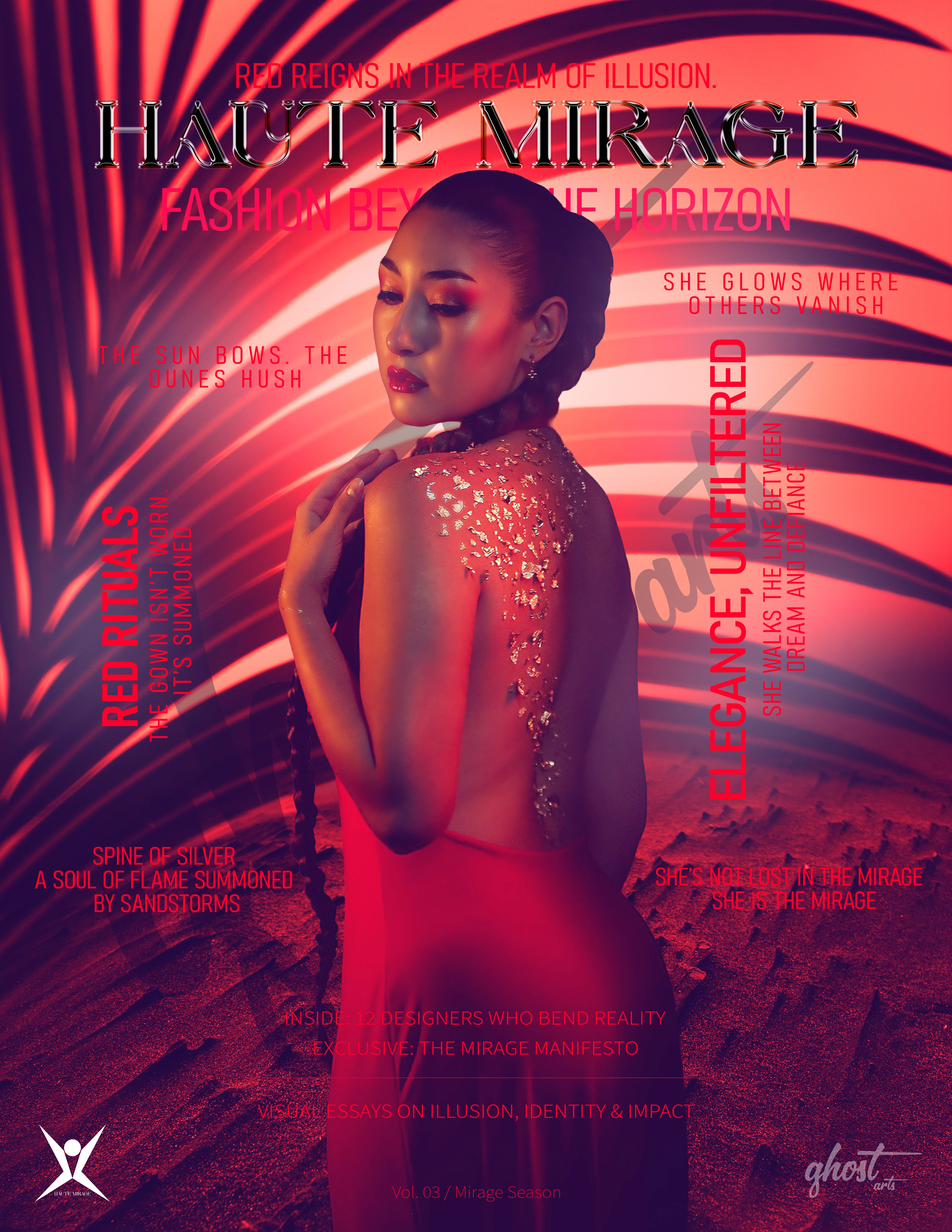A surreal editorial cover exploring fashion as ritual, illusion, and elemental force. Set against a desert of optical distortion, the composition summons a woman in red—part apparition, part sovereign. Her silver-spined gown glows with mythic intensity, blurring the line between dream and distance. This piece anchors the Mirage trilogy as its most theatrical chapter, merging haute couture with visual poetry. Designed for Ghost Arts’ Mirage Season Vol. 03, it embodies the studio’s philosophy of limited, non-repetitive editorial identities.