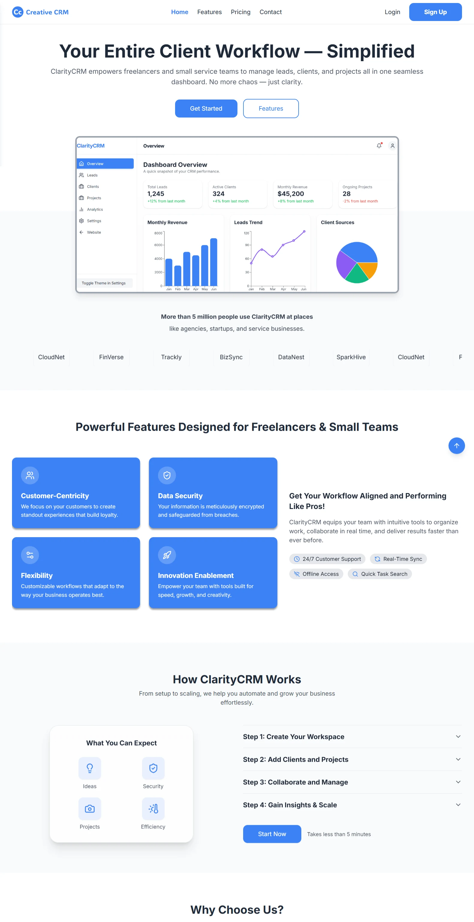 ClarityCRM is a modern CRM dashboard designed for freelancers and small businesses to manage clients, leads, projects, and analytics in a single interface.