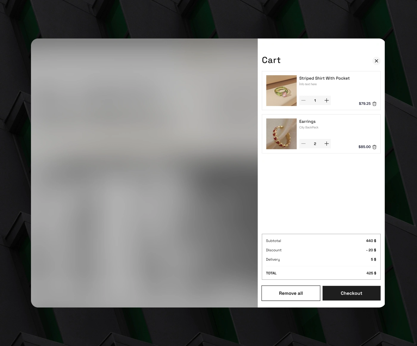 The cart drawer provides a fast, non-disruptive way to review selected items without leaving the current page. The blurred background keeps user focus on the cart while preserving context, enabling quick quantity adjustments and clear cost visibility.