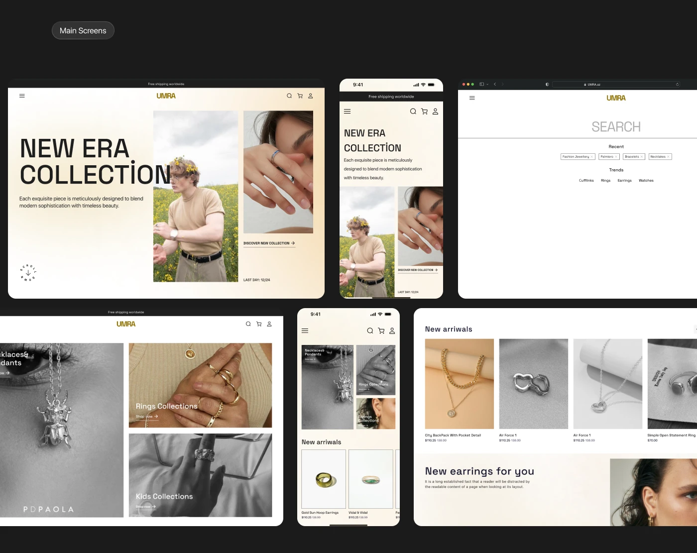 The main screens showcase a cohesive jewelry e-commerce experience across desktop and mobile. The layouts emphasize editorial composition, clear product hierarchy, and smooth navigation, allowing users to explore collections, new arrivals, and product categories effortlessly.