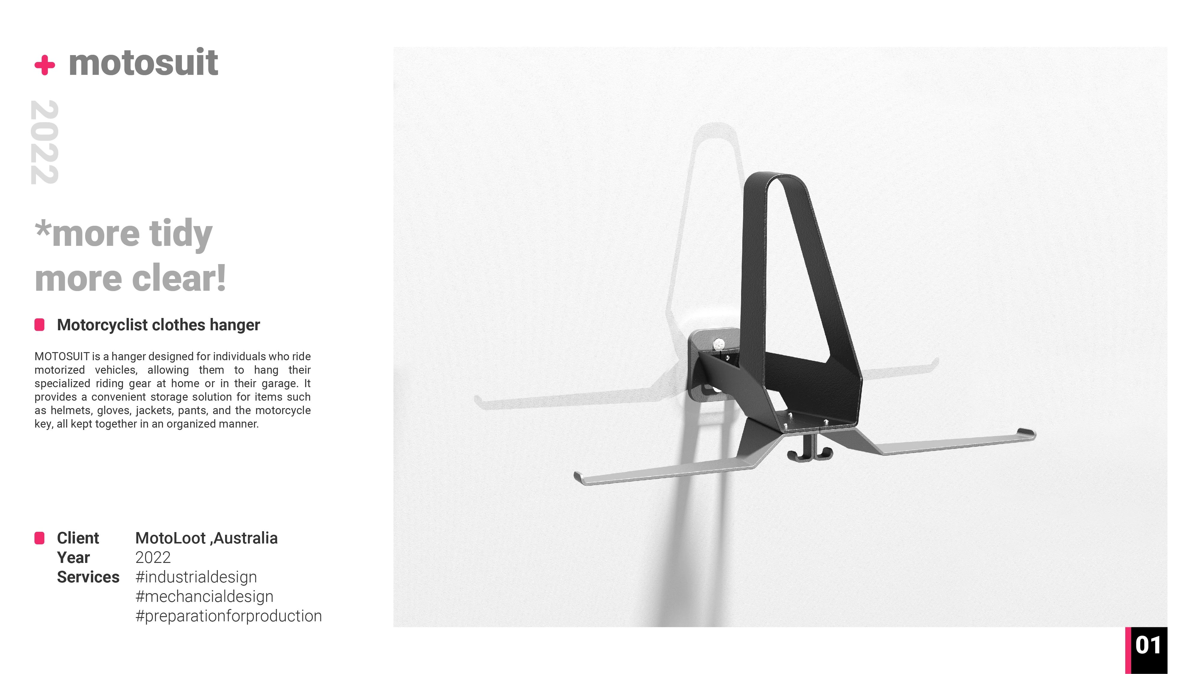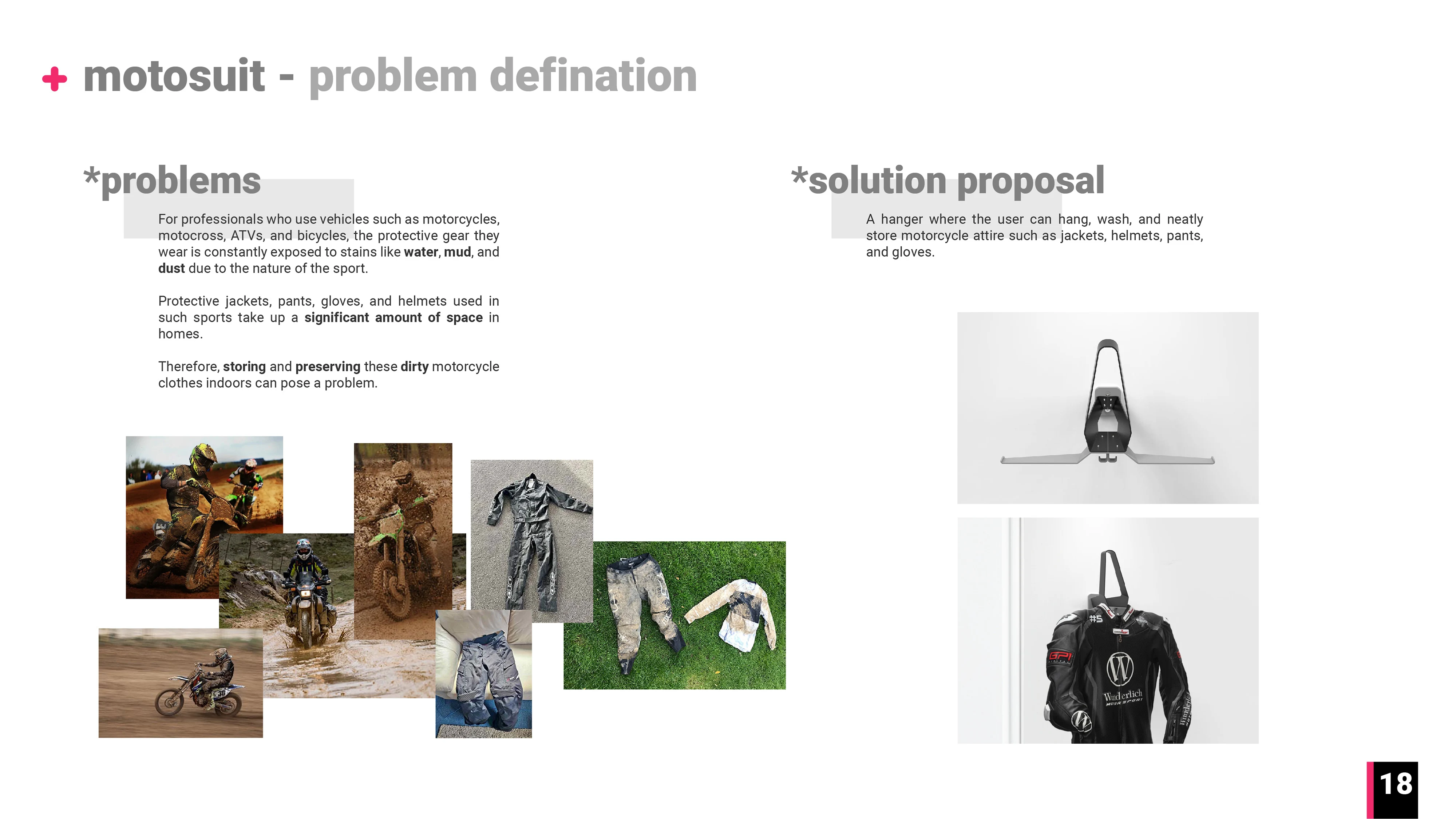 MOTOSUIT is a wall-mounted hanger designed for individuals and allowing them to hang their specialized riding gear at home or in their garage.