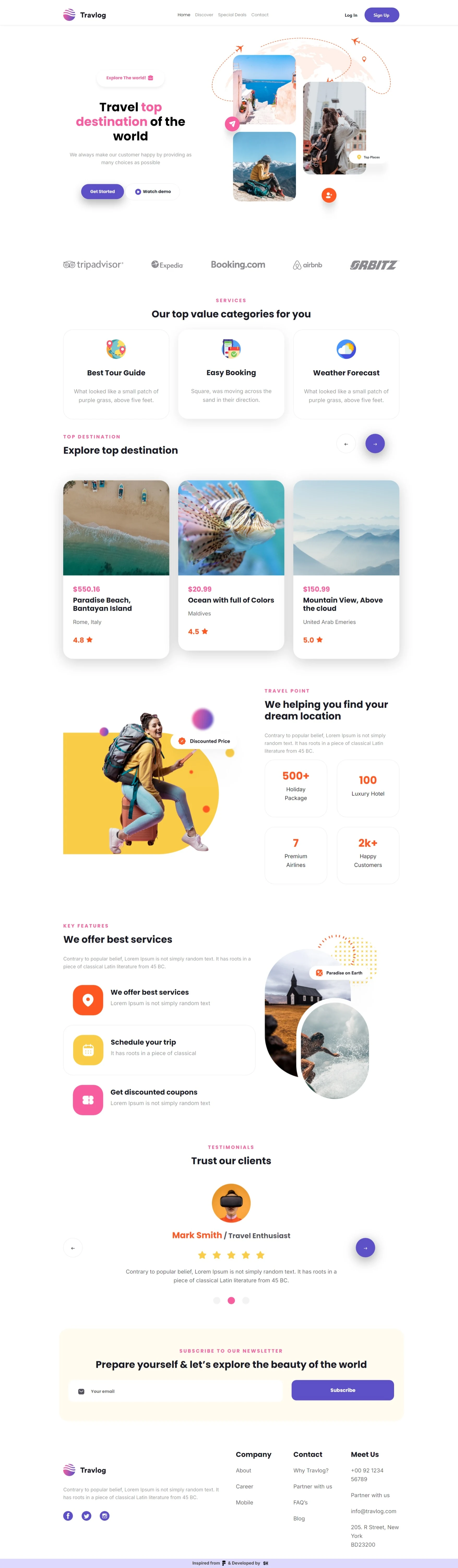 Travlog is a modern, responsive travel agency landing page built using HTML, CSS, and Bootstrap. This project was developed as part of the #30DaysOfCoding challenge by NxtWave. The design was inspired by a Figma template, which was translated into code to enhance front-end development skills and responsiveness.
