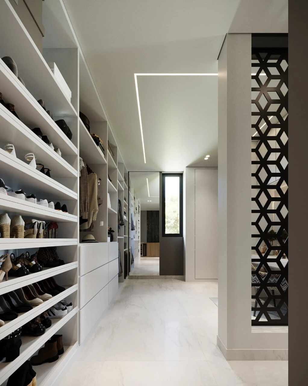 Designed and visualised a luxury walk-in closet with a vanity and hallway, featuring minimalist style, custom shelves, soft lighting, and decorative partitions.