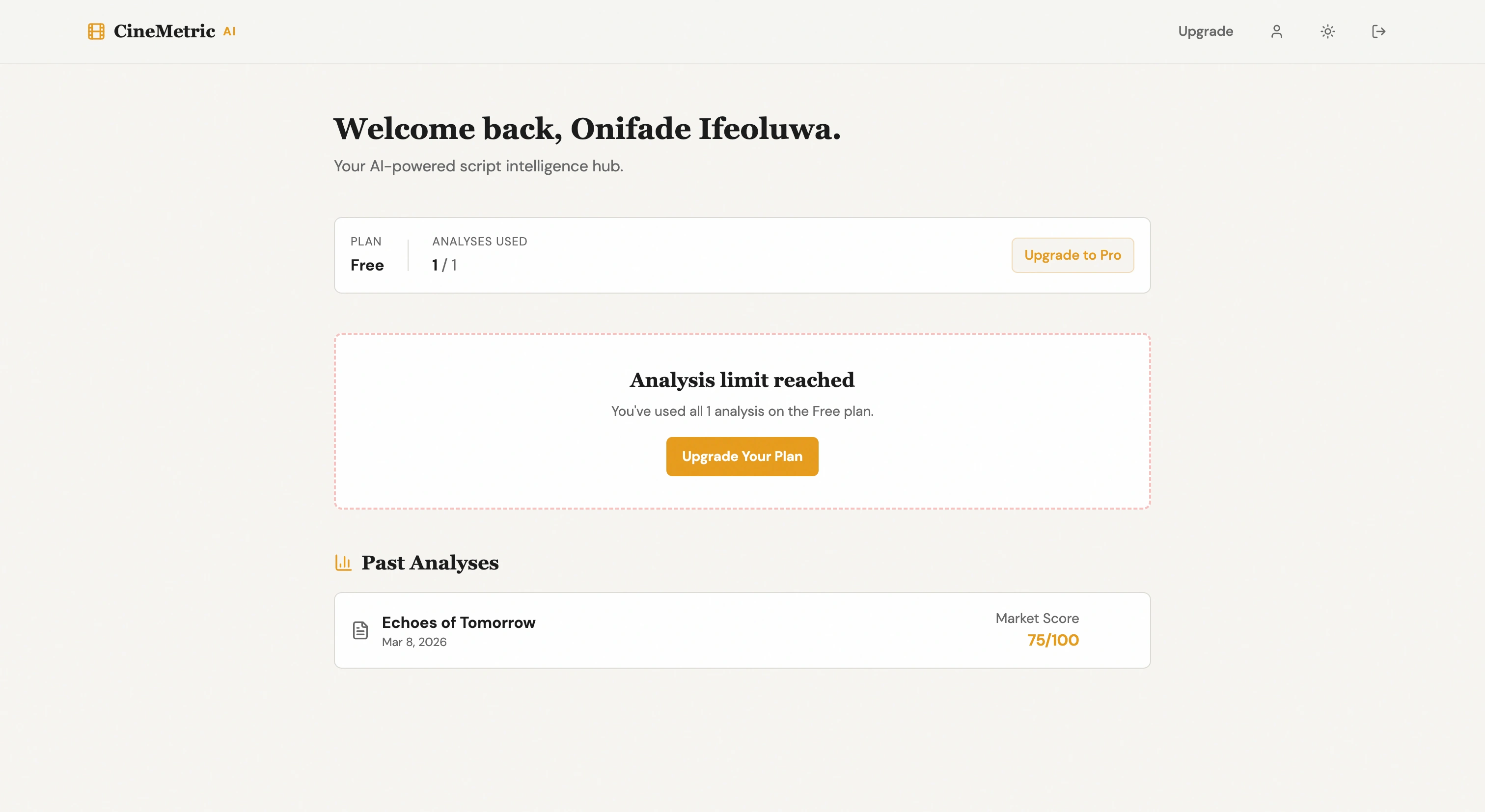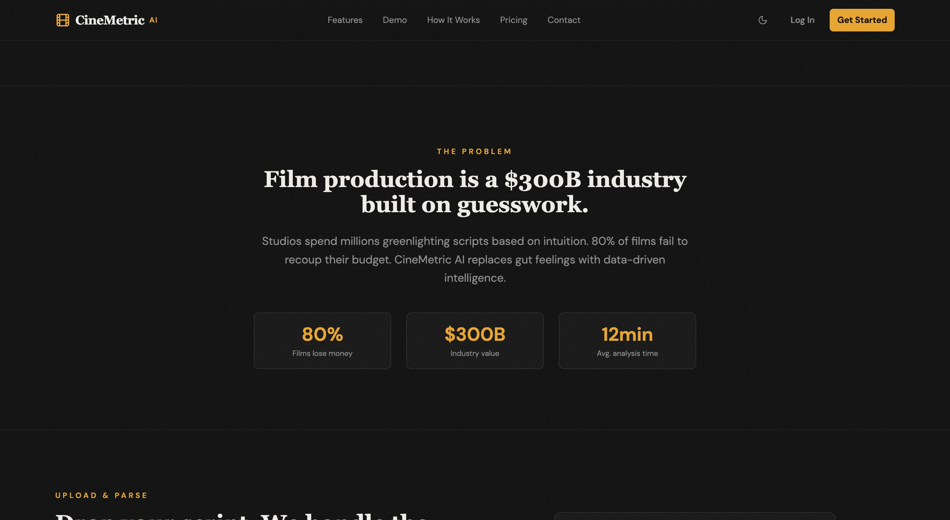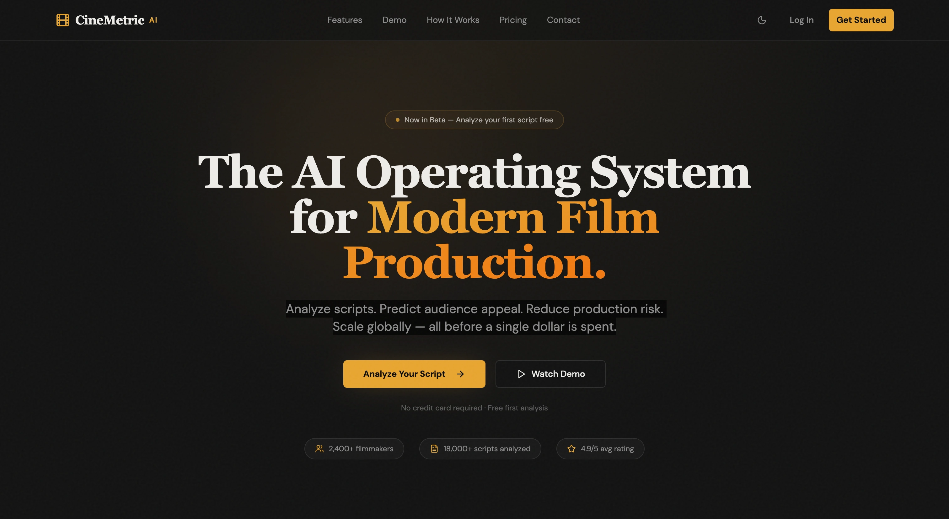 Cinemetric AI is an AI-powered platform that helps filmmakers, studios, and producers analyze movie scripts, predict audience appeal, and reduce production risk before any budget is committed.