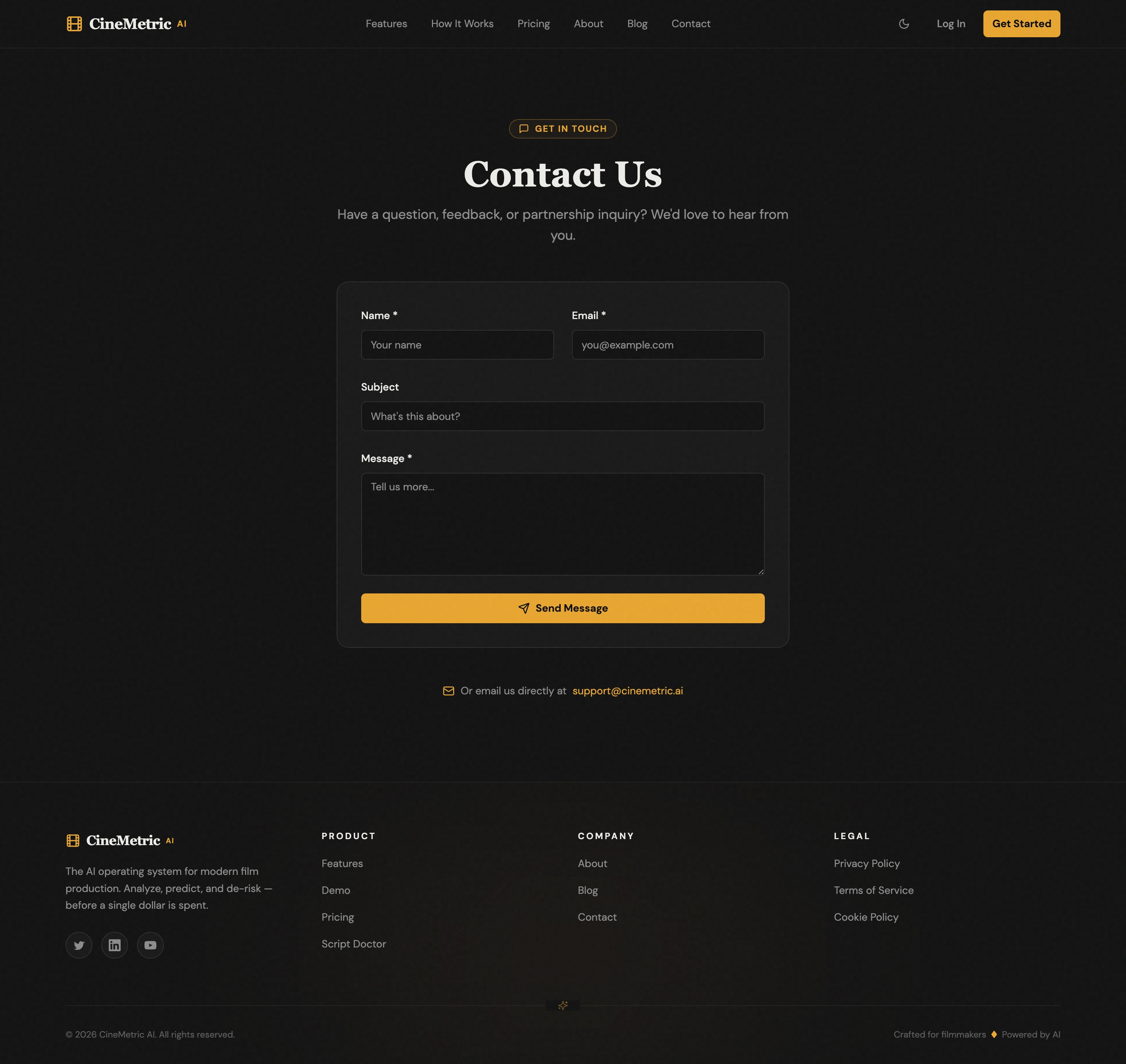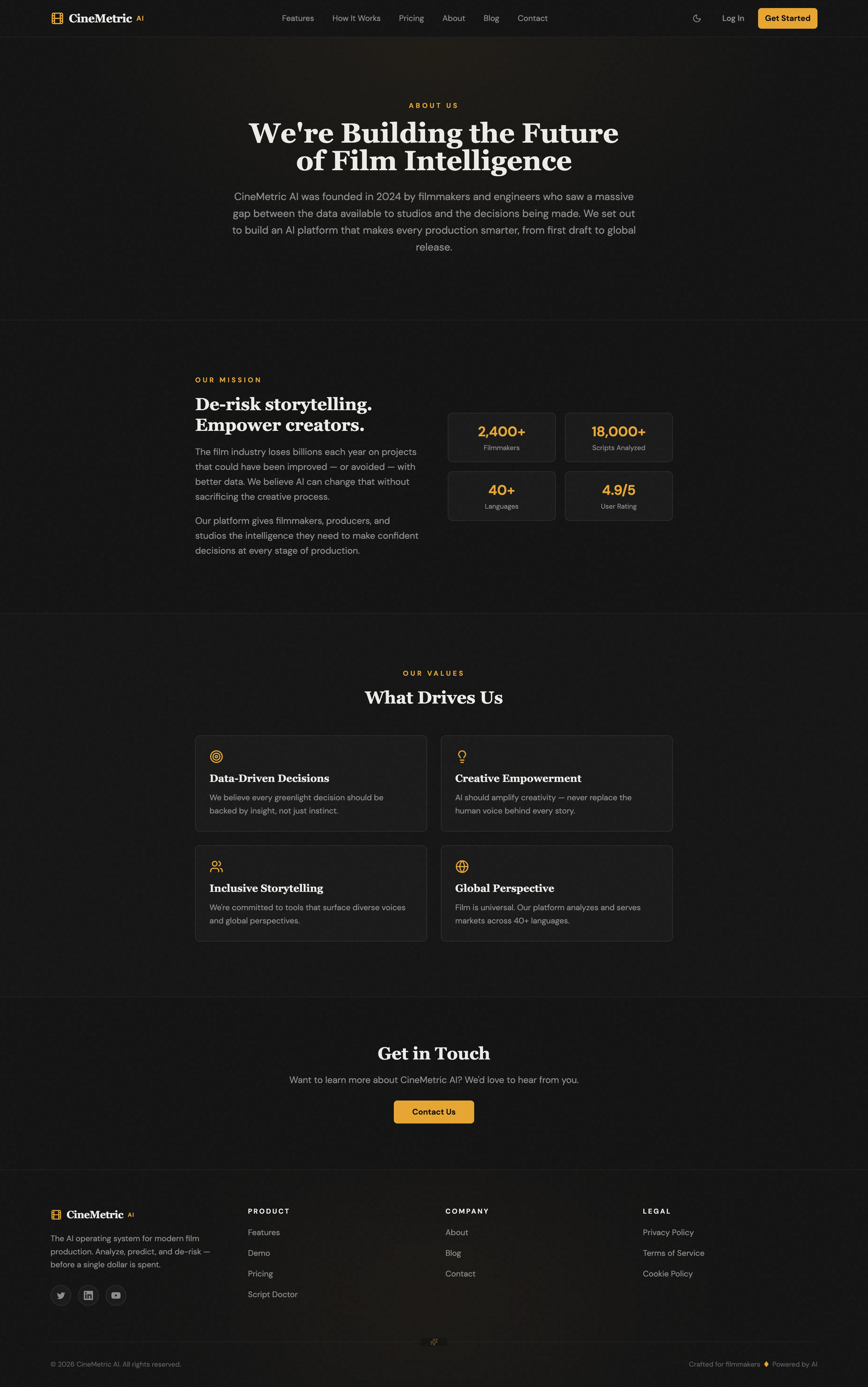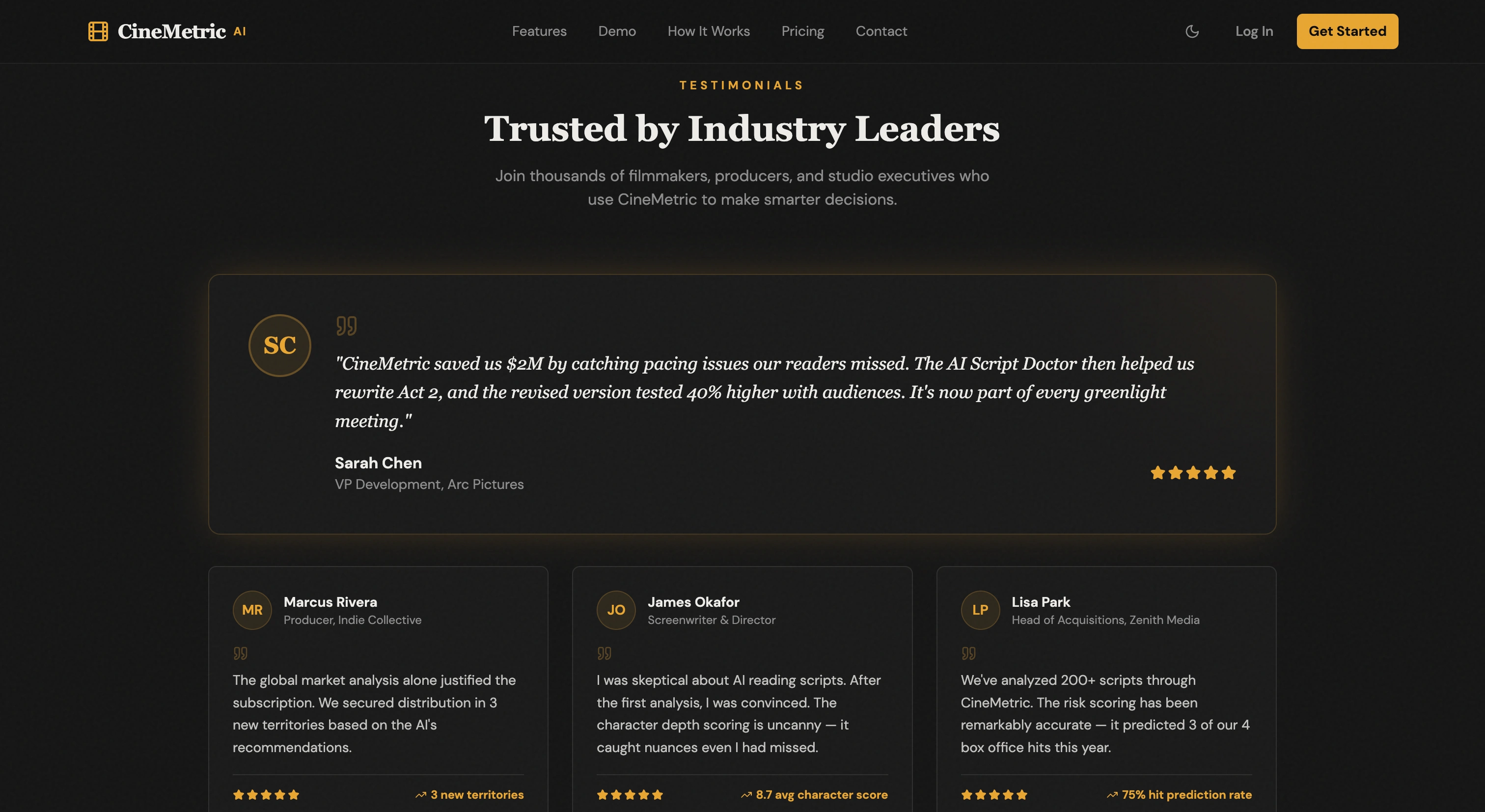 Cinemetric AI is an AI-powered platform that helps filmmakers, studios, and producers analyze movie scripts, predict audience appeal, and reduce production risk before any budget is committed.