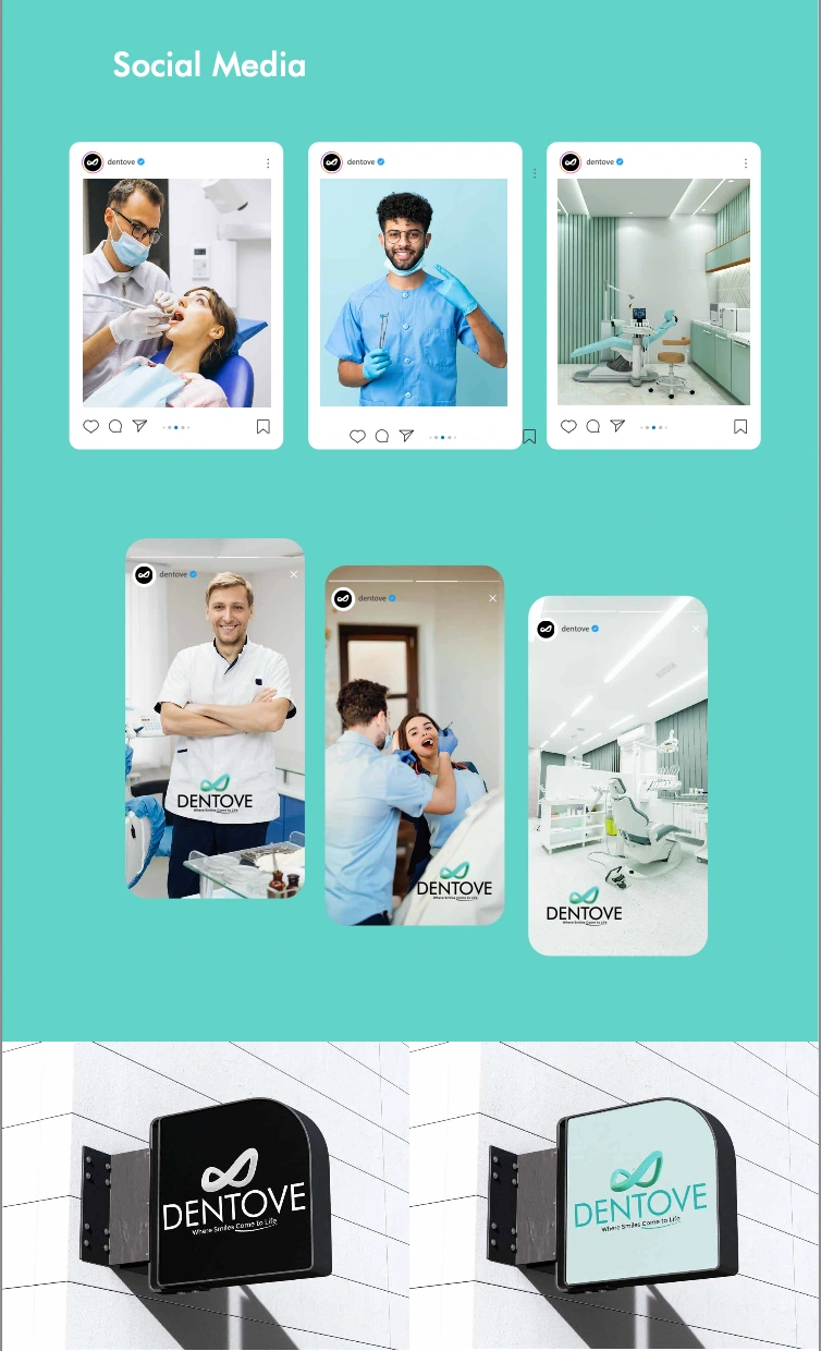 I partnered with Dentove to lead the creation of a full branding system—including logo design, visual identity, and brand guidelines. The design centered around a unique infinity-shaped mark—symbolizing continuous care, holistic wellness, and lifelong confidence. The typography (Futura Bk BT) and color palette (Cool Cyan, Mint Serenity, Midnight Depth) were selected to evoke a balance of professionalism and approachability.