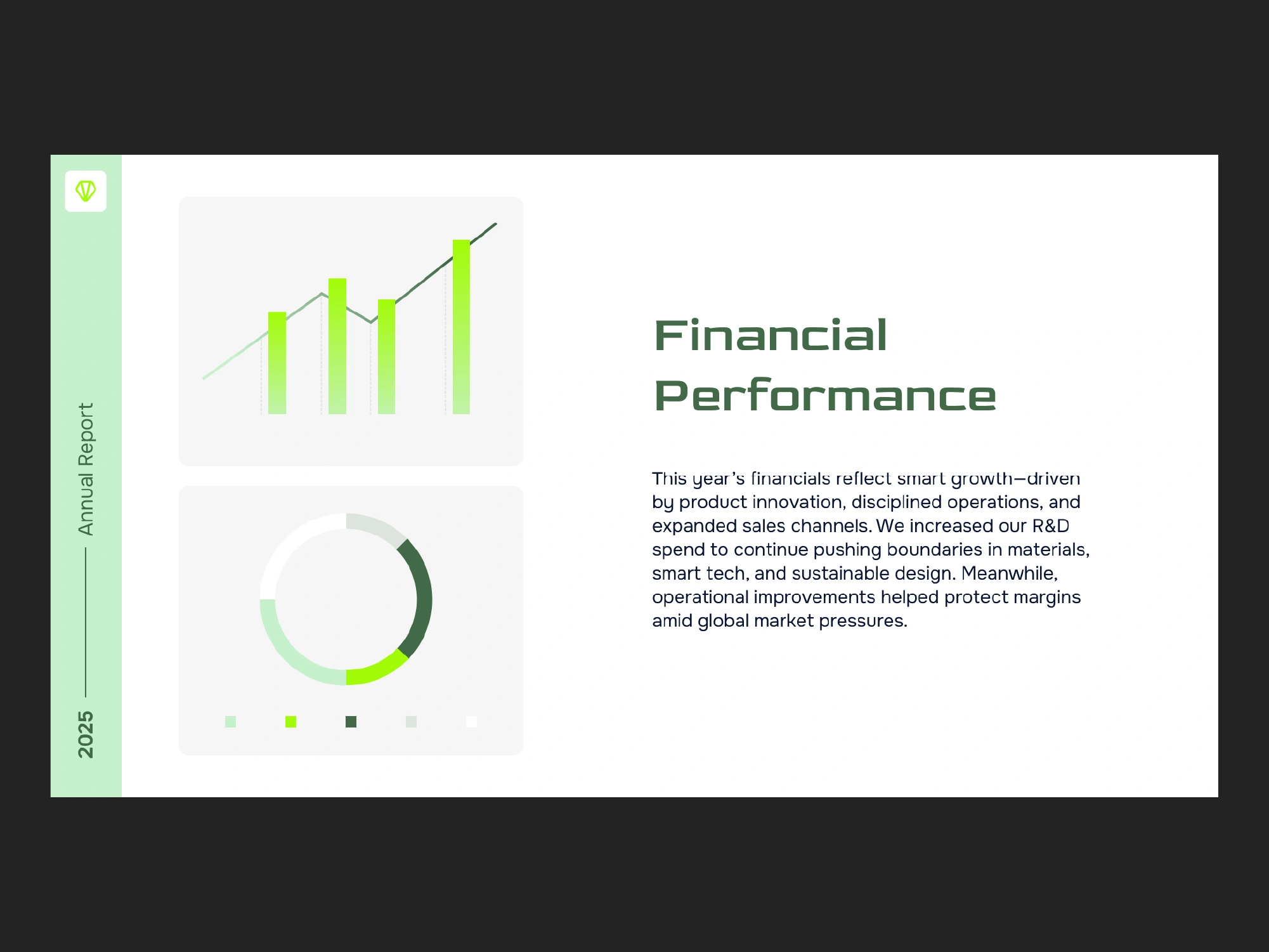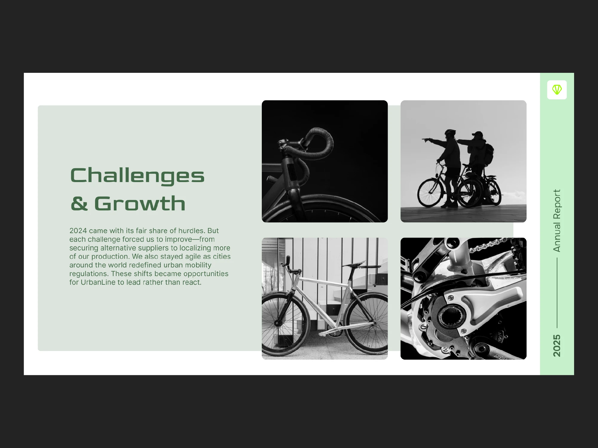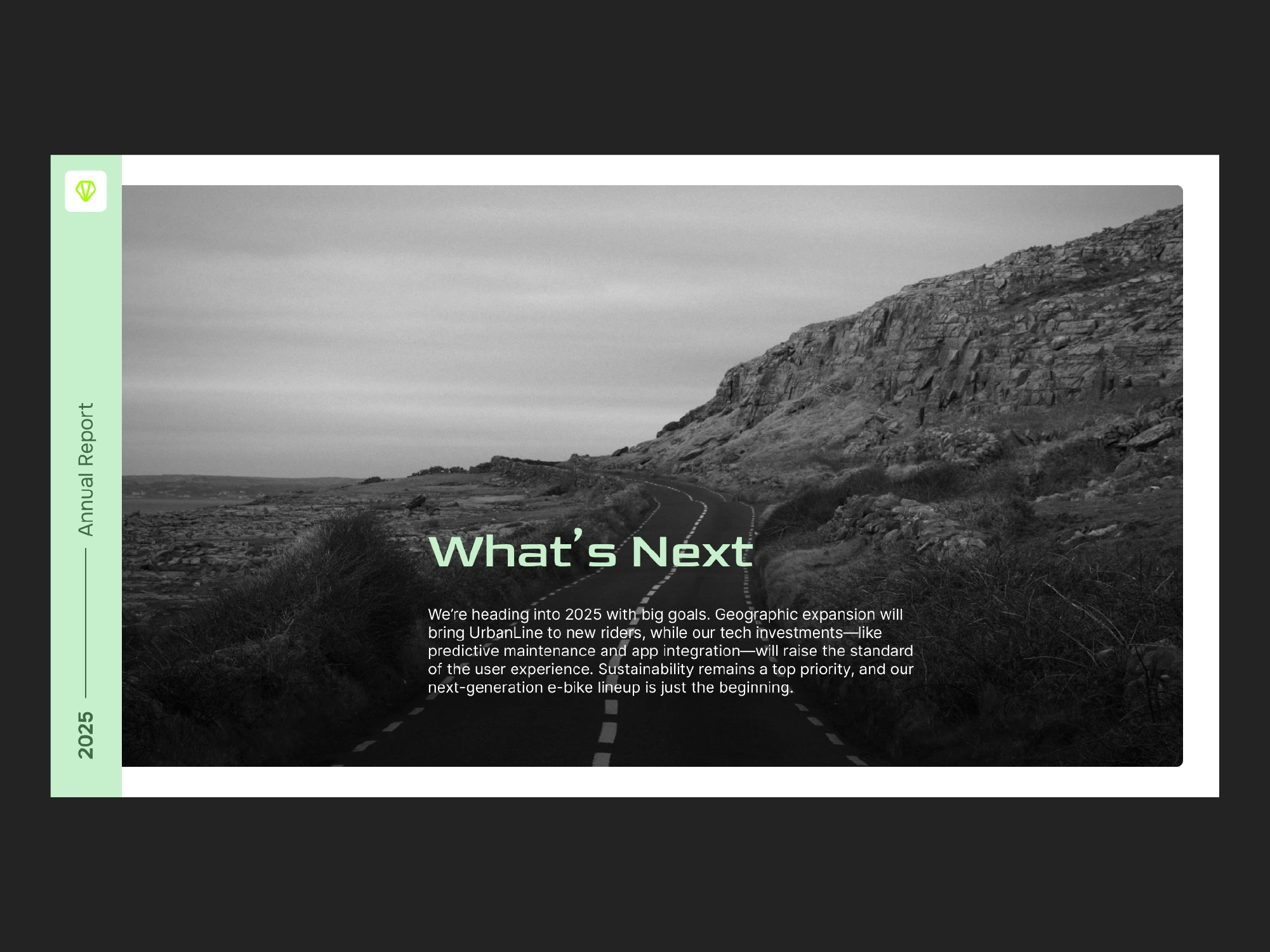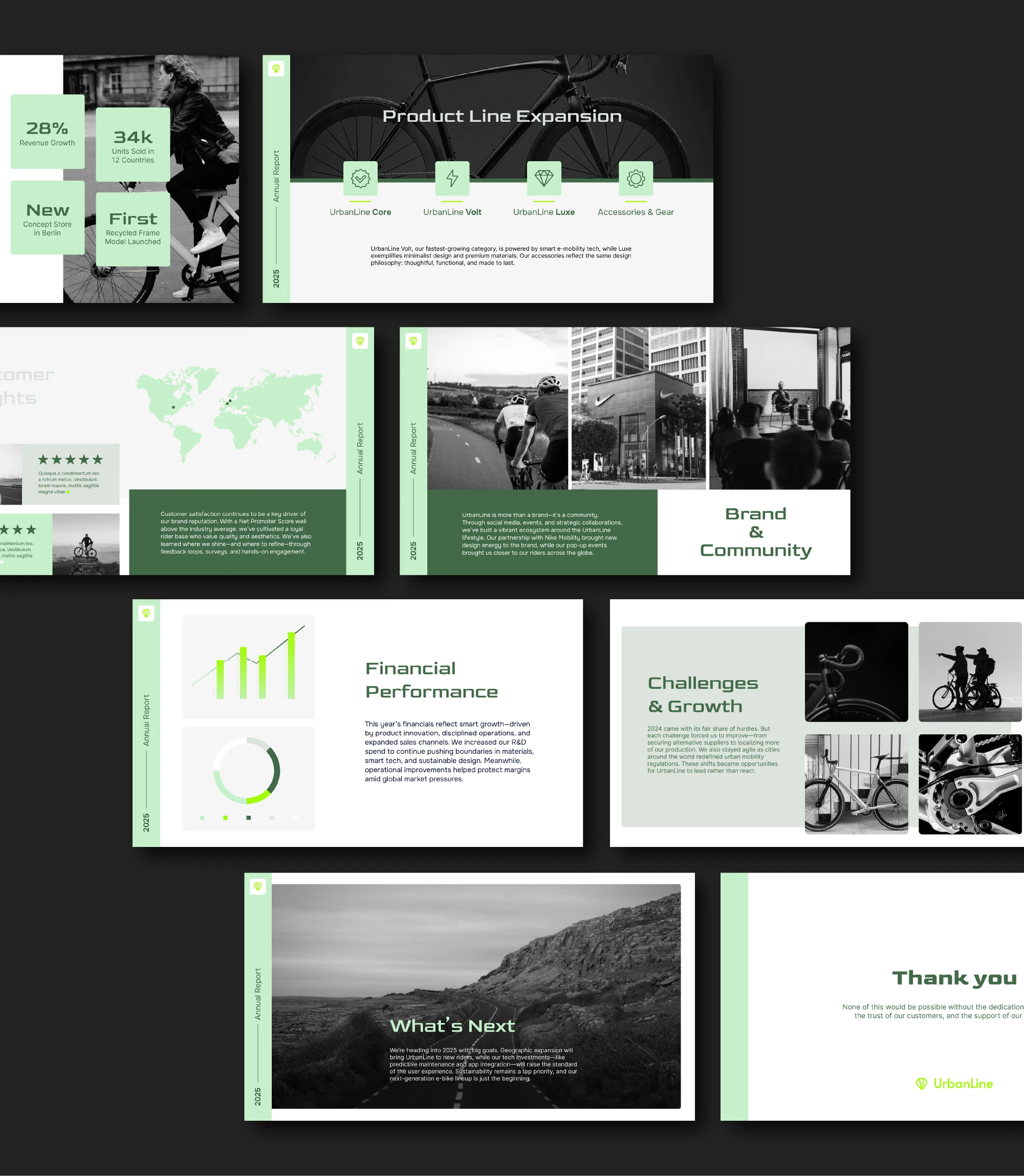 I designed this annual business report presentation in Figma to communicate company performance, vision, and strategy in a clear and engaging way.