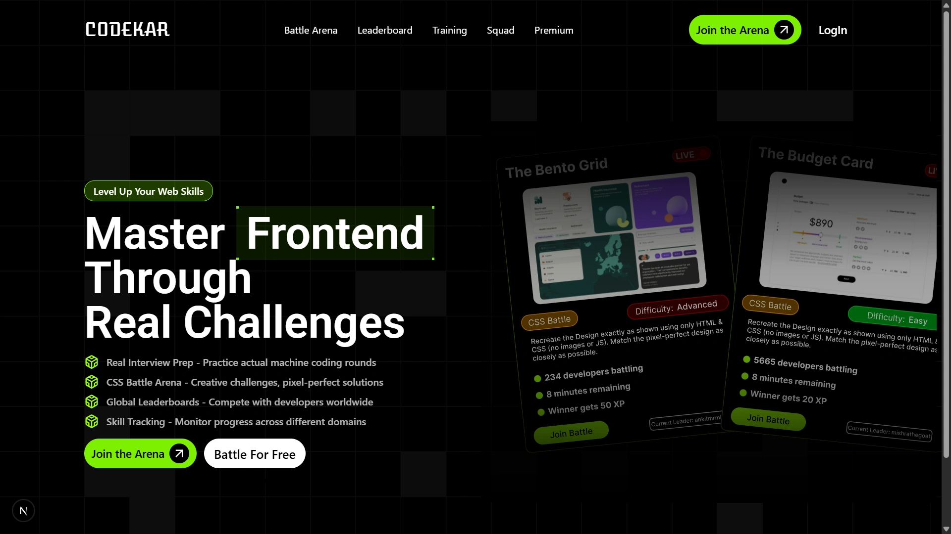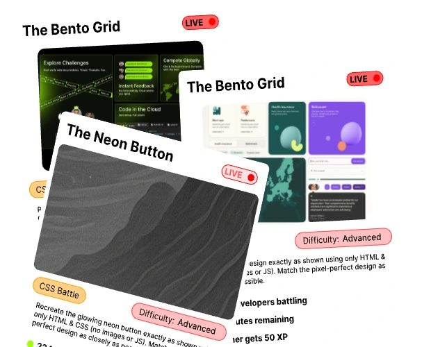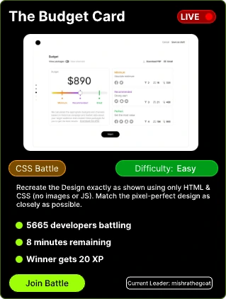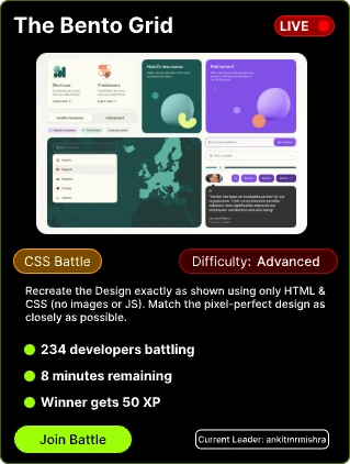 Real Interview Prep - Practice actual machine coding rounds CSS Battle Arena - Creative challenges, pixel-perfect solutions Global Leaderboards - Compete with developers worldwide Skill Tracking - Monitor progress across different domains