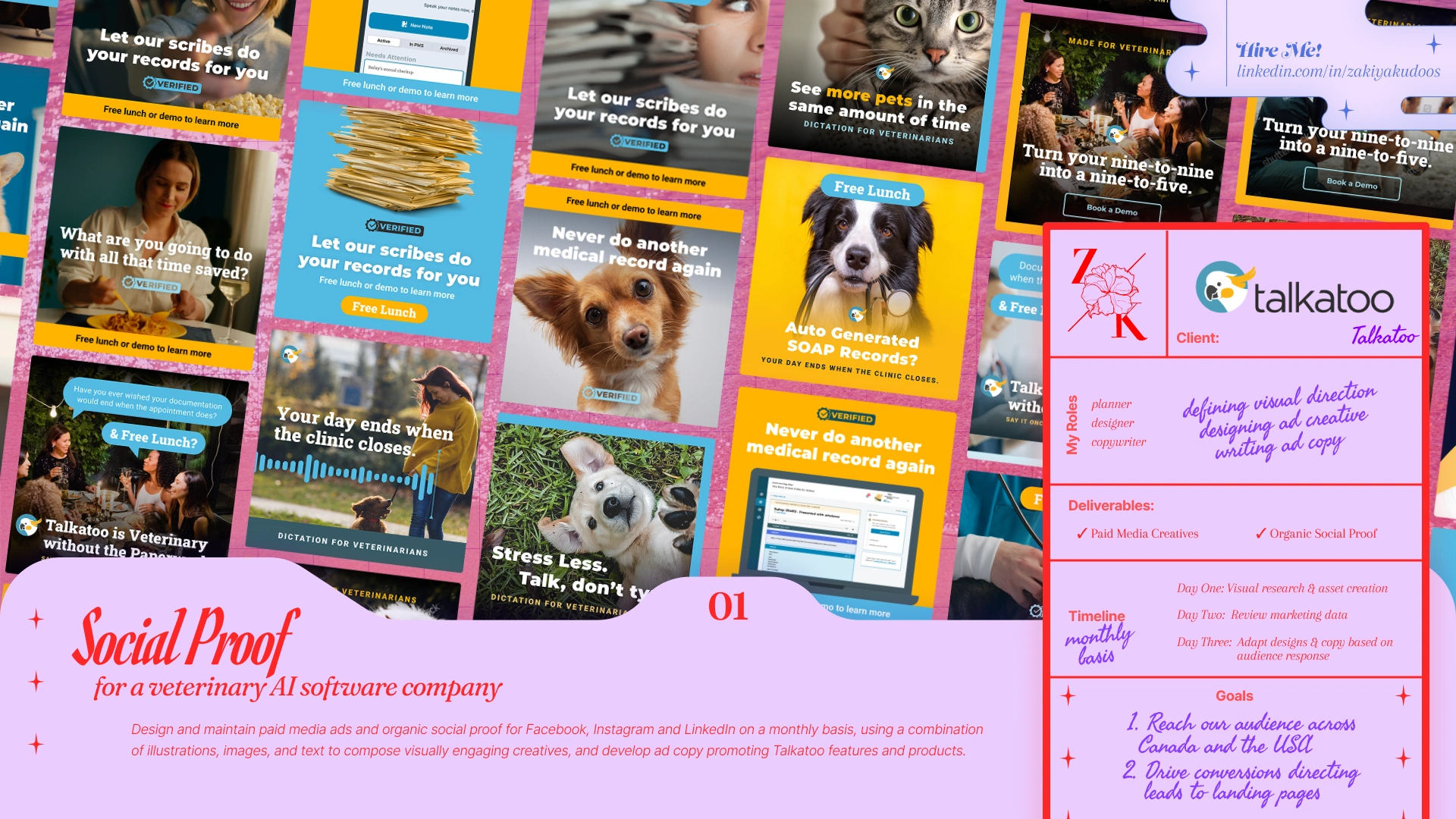 Design and maintain paid media ads and organic social proof for Facebook, Instagram and LinkedIn on a monthly basis, using a combination of illustrations, images, and text to design visually engaging designs, and write ad copy to promote Talkatoo features and products.