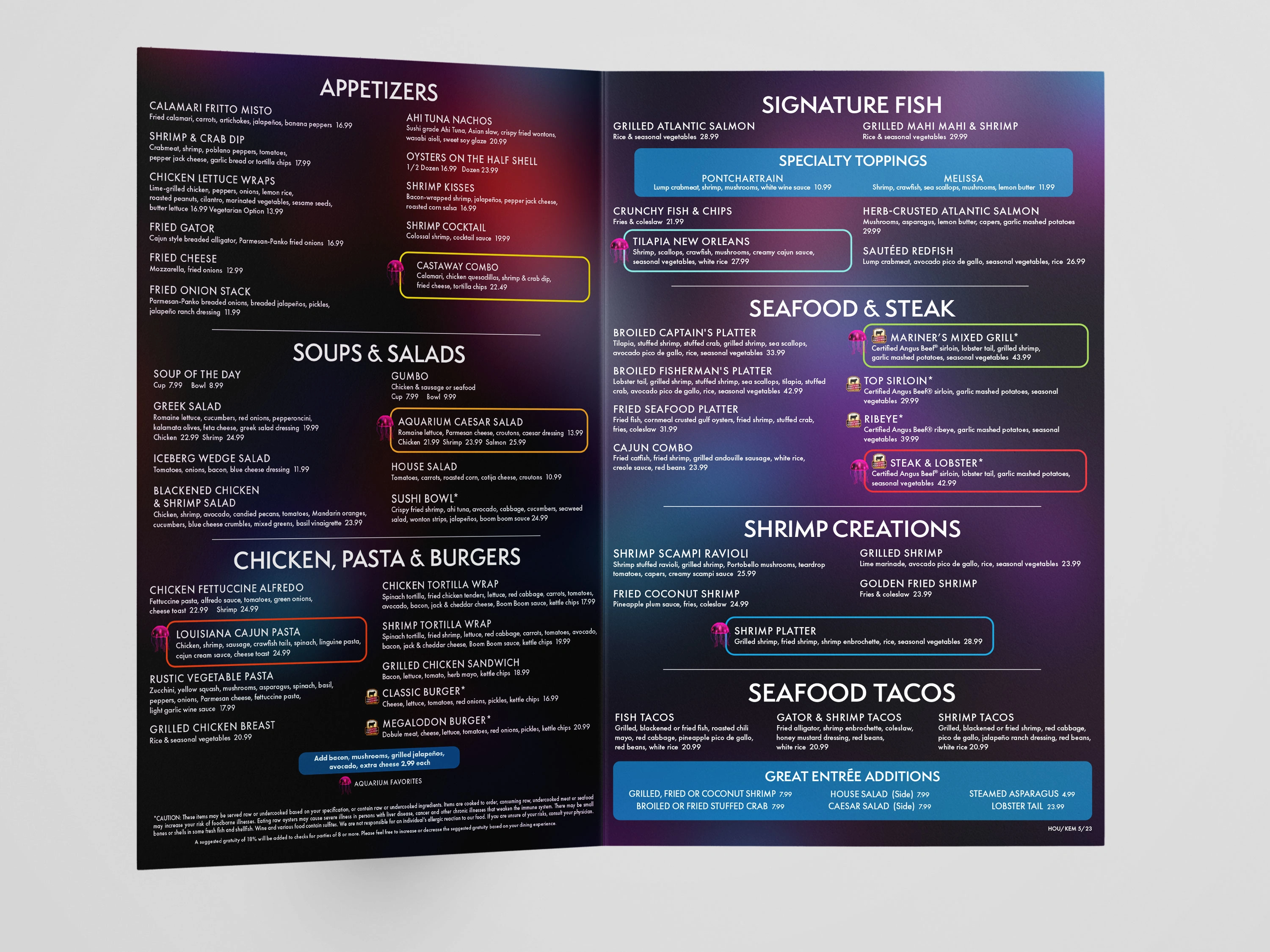 Rebrand the main menu of an aquarium. Cover art created to reflect the new direction of the aquarium & to appeal to new customers. Menu typeset for legibility