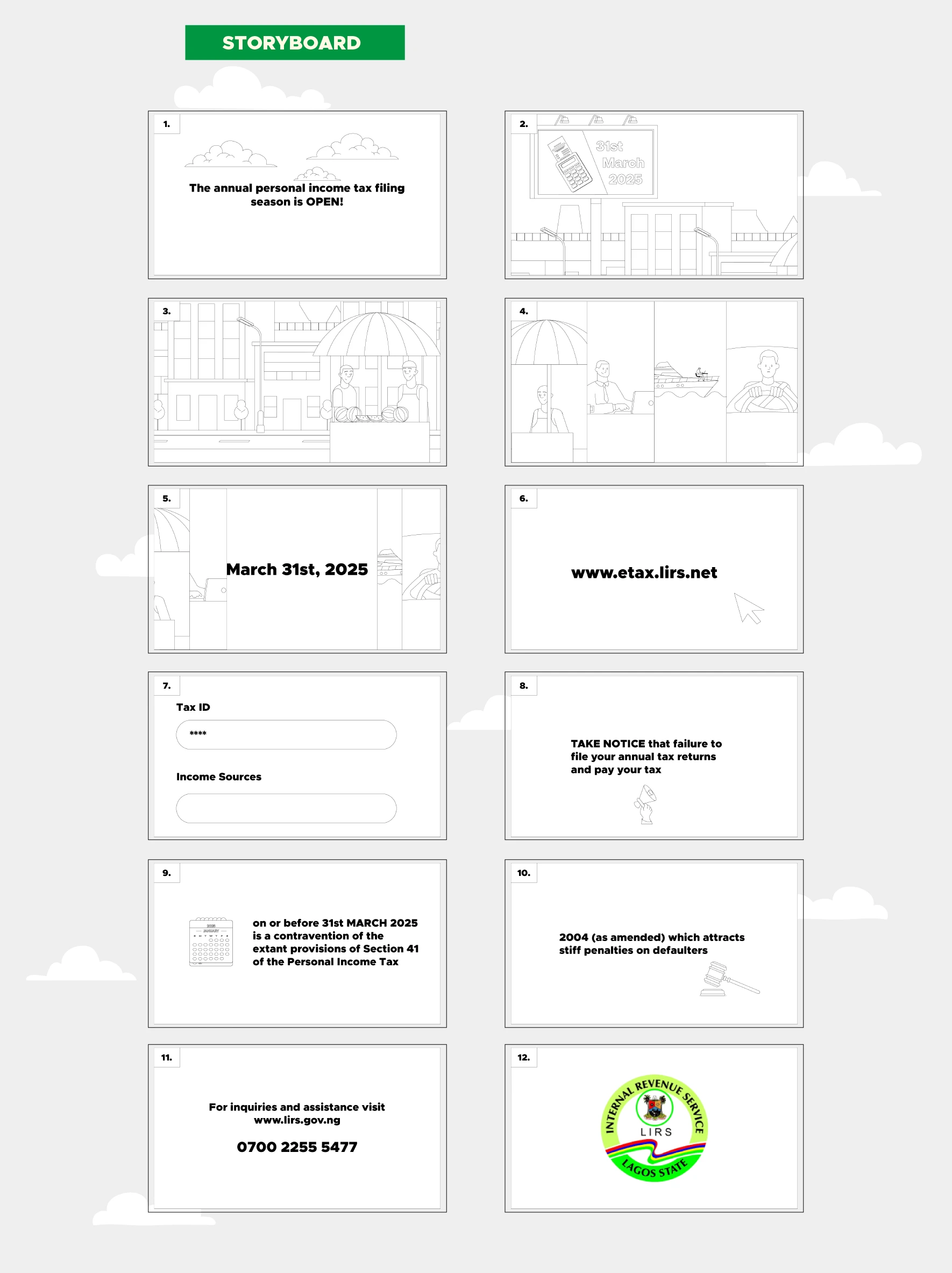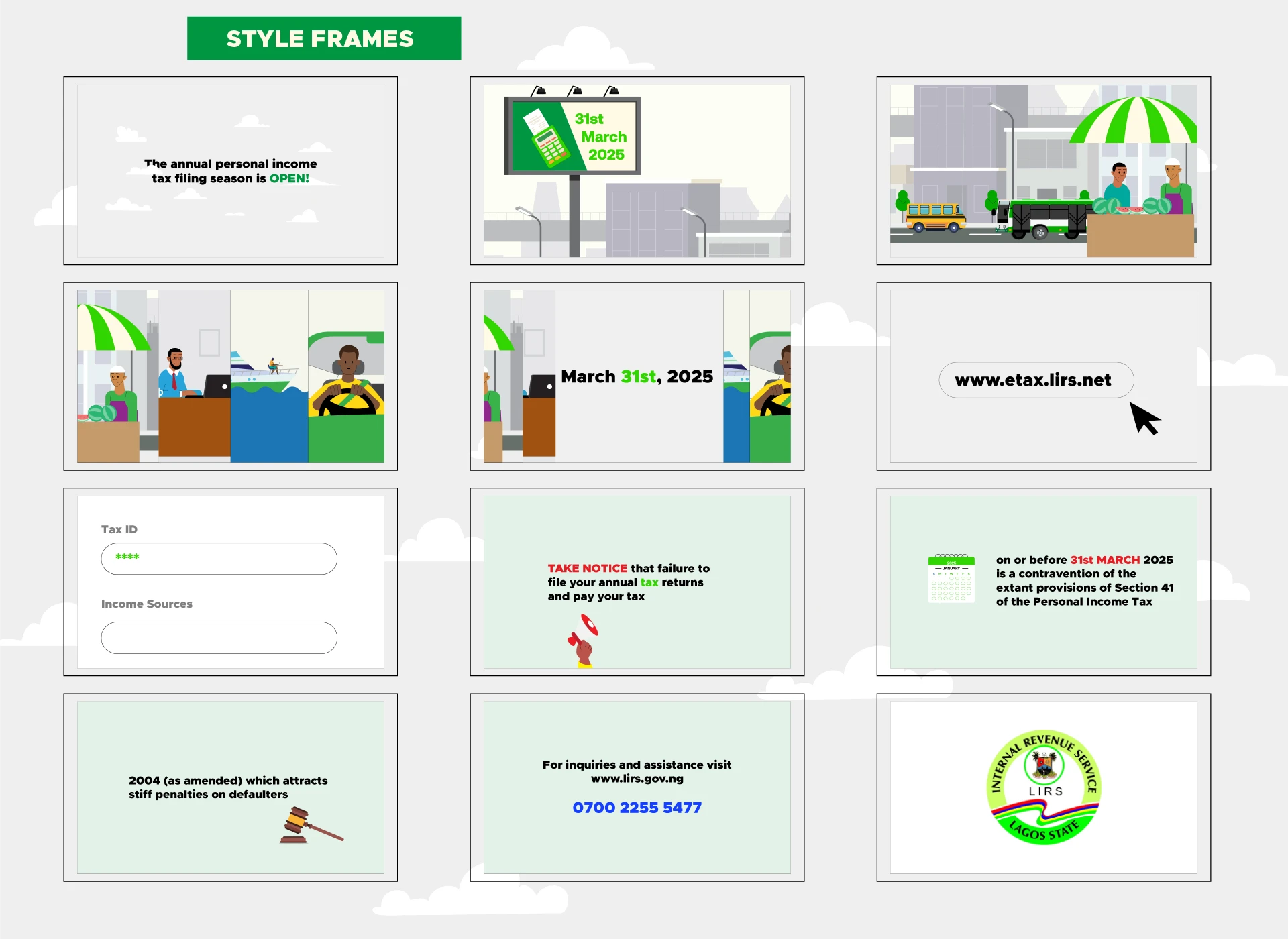 The Lagos State Internal Revenue Service (LIRS) needed a clear and engaging way to inform the public about the annual individual tax return deadline. Using 2D animation, we crafted a smooth, visually appealing video featuring typography animation, seamless transitions, and character-driven storytelling.