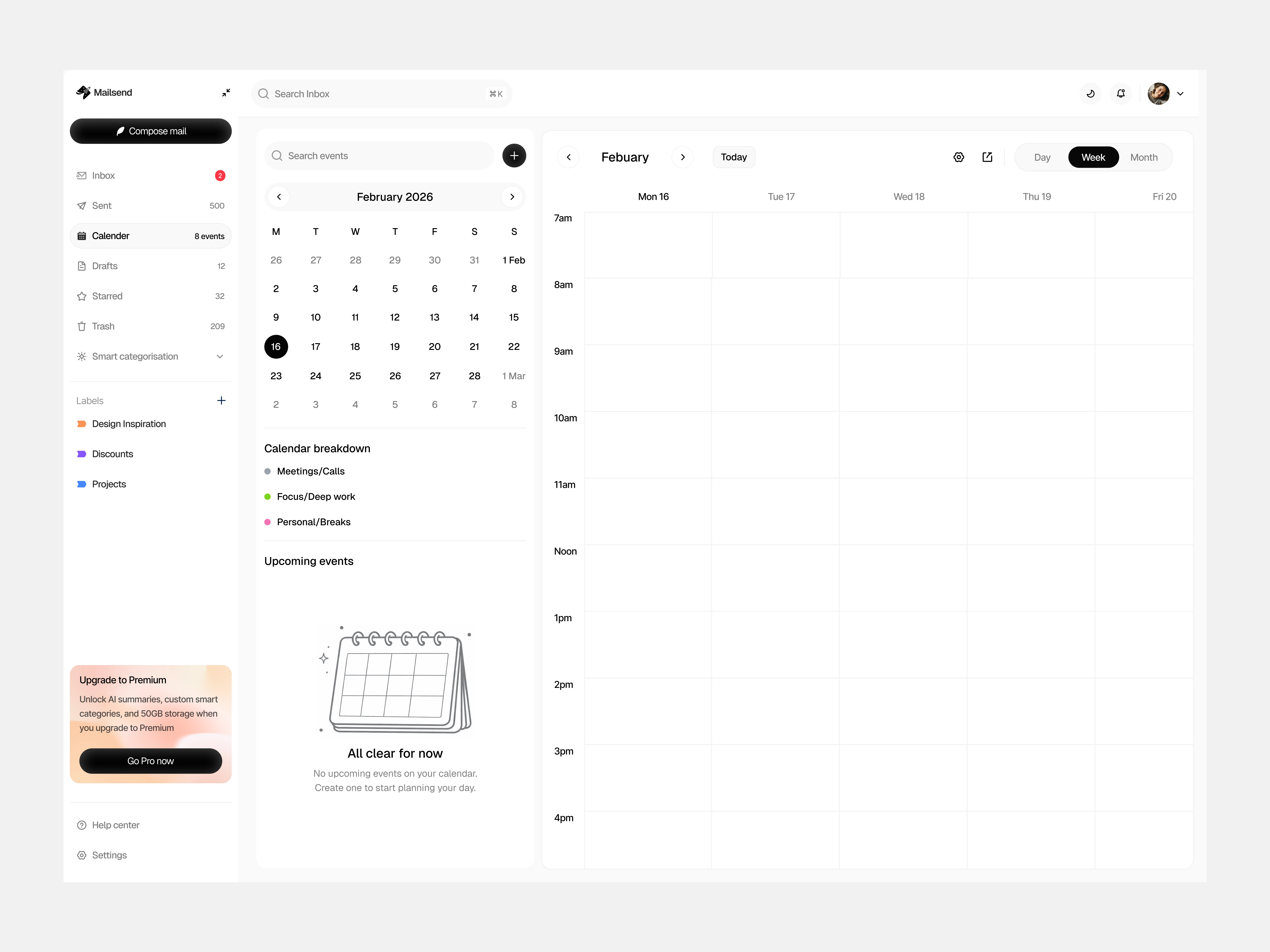 Empty states guide users naturally ("Ready when you are" for email, "No events scheduled" for calendar)