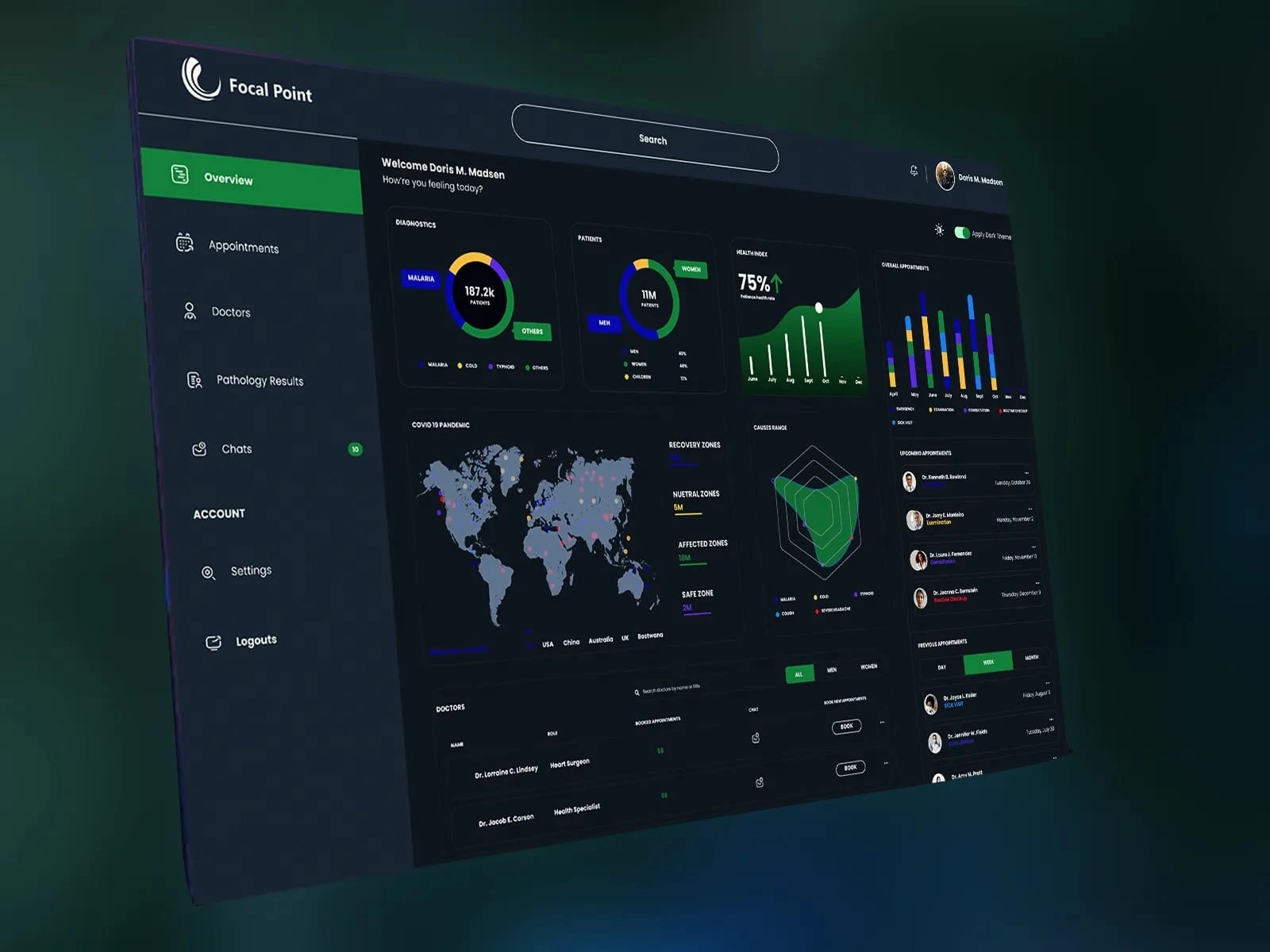 By focusing on clarity, interactivity, and data-driven insights, this design aims to provide healthcare professionals with a powerful tool for managing patient care, tracking health trends, and responding to global health challenges. The combination of vibrant visuals, intuitive navigation, and actionable data ensures a seamless and productive user experience.