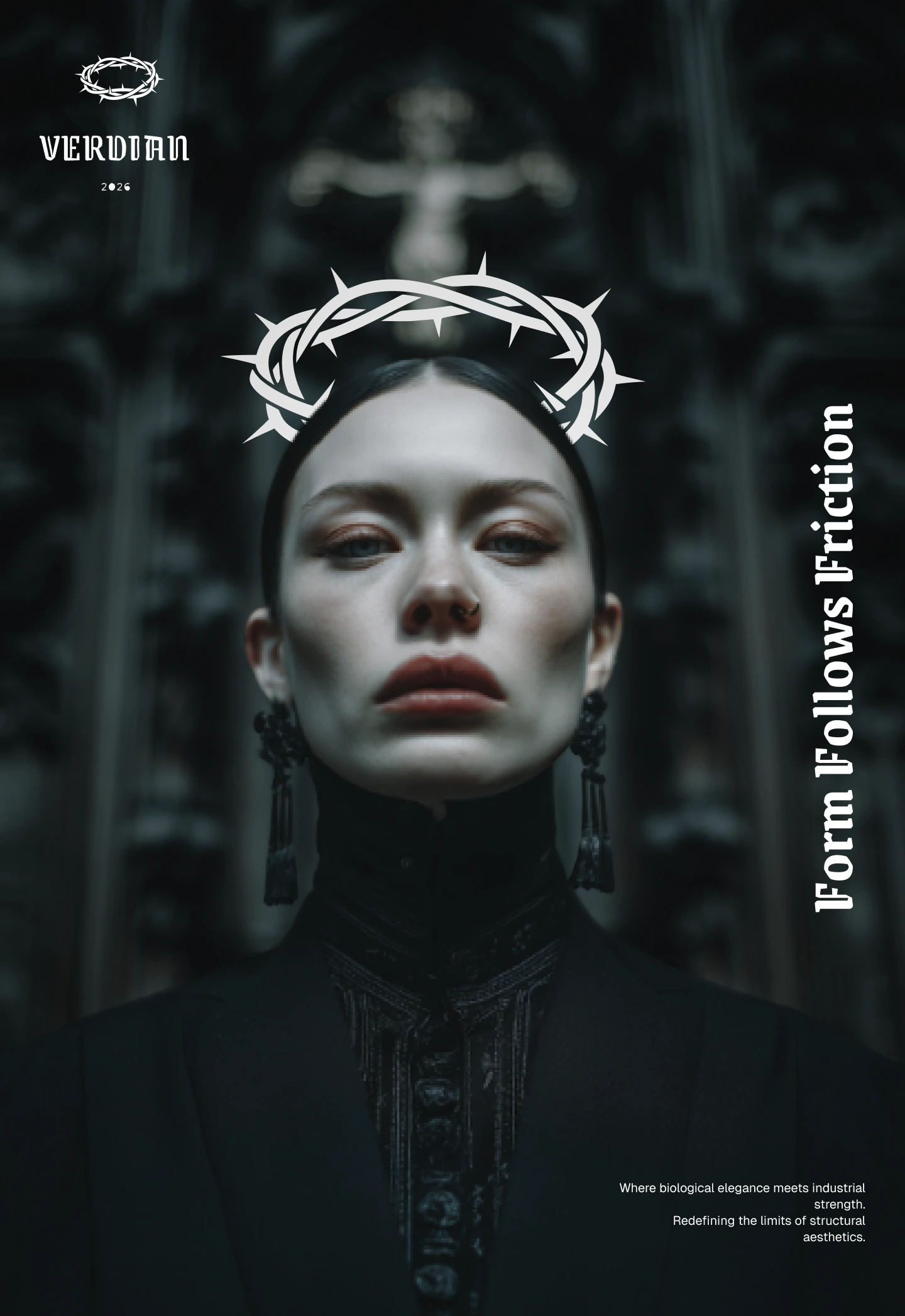 Veridian is a luxury design house that launched its seminal collection, "Liturgy of Iron," in early 2026. The brand bridges the gap between biological elegance and industrial strength, a philosophy defined as "Prophetic Structuralism." The campaign moves beyond traditional jewelry into "functional architecture," utilizing brutalist aesthetics and "digital occult" motifs to redefine underground luxury.