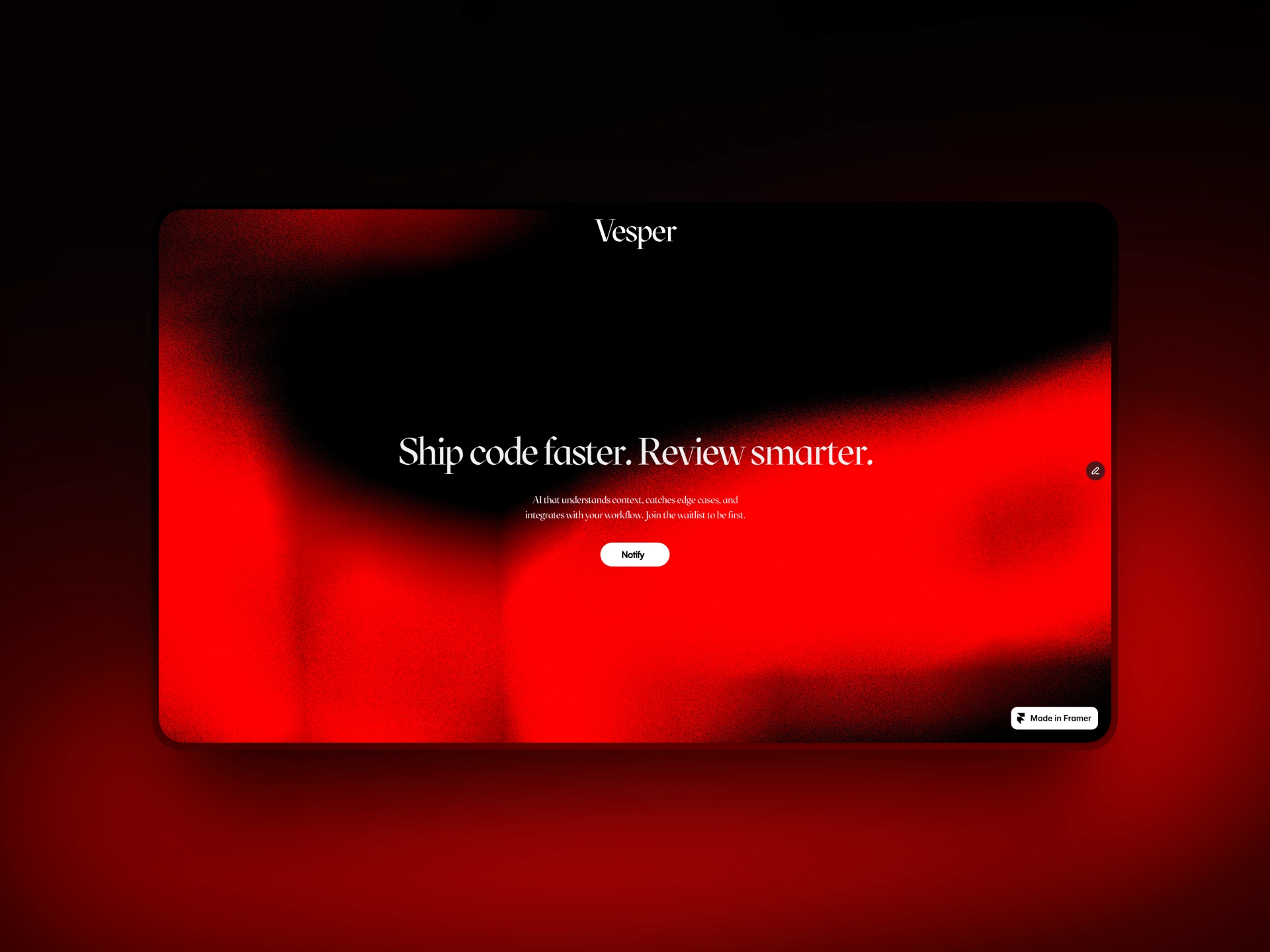 The page was built entirely in Framer with a single-section structure, eliminating unnecessary navigation and feature lists. All components were created in Framer Workshop, including the Notify component and the loading screen as well. The design prioritizes a clean composition, direct messaging, and one clear action—letting the visual do the heavy lifting instead of overexplaining the concept.