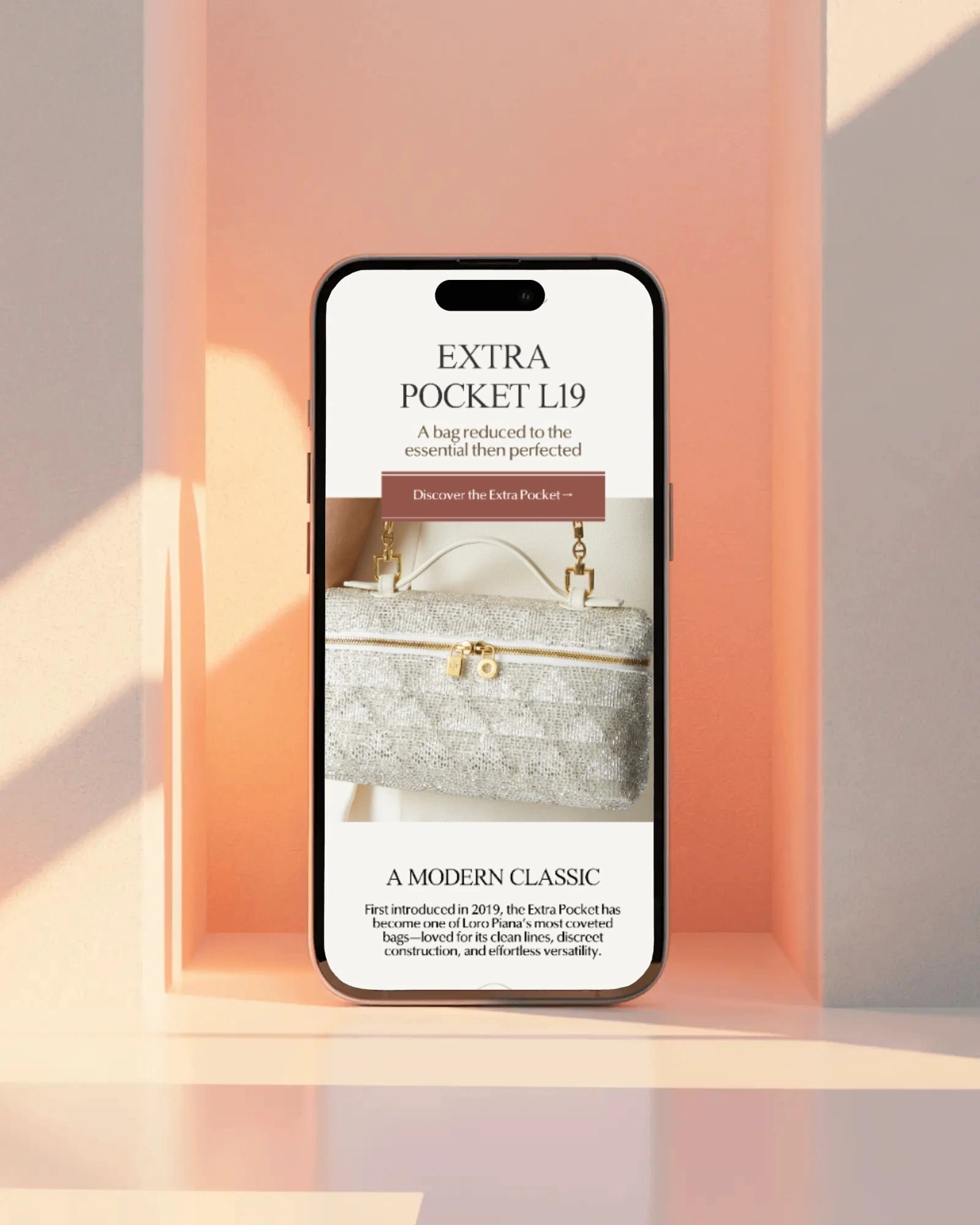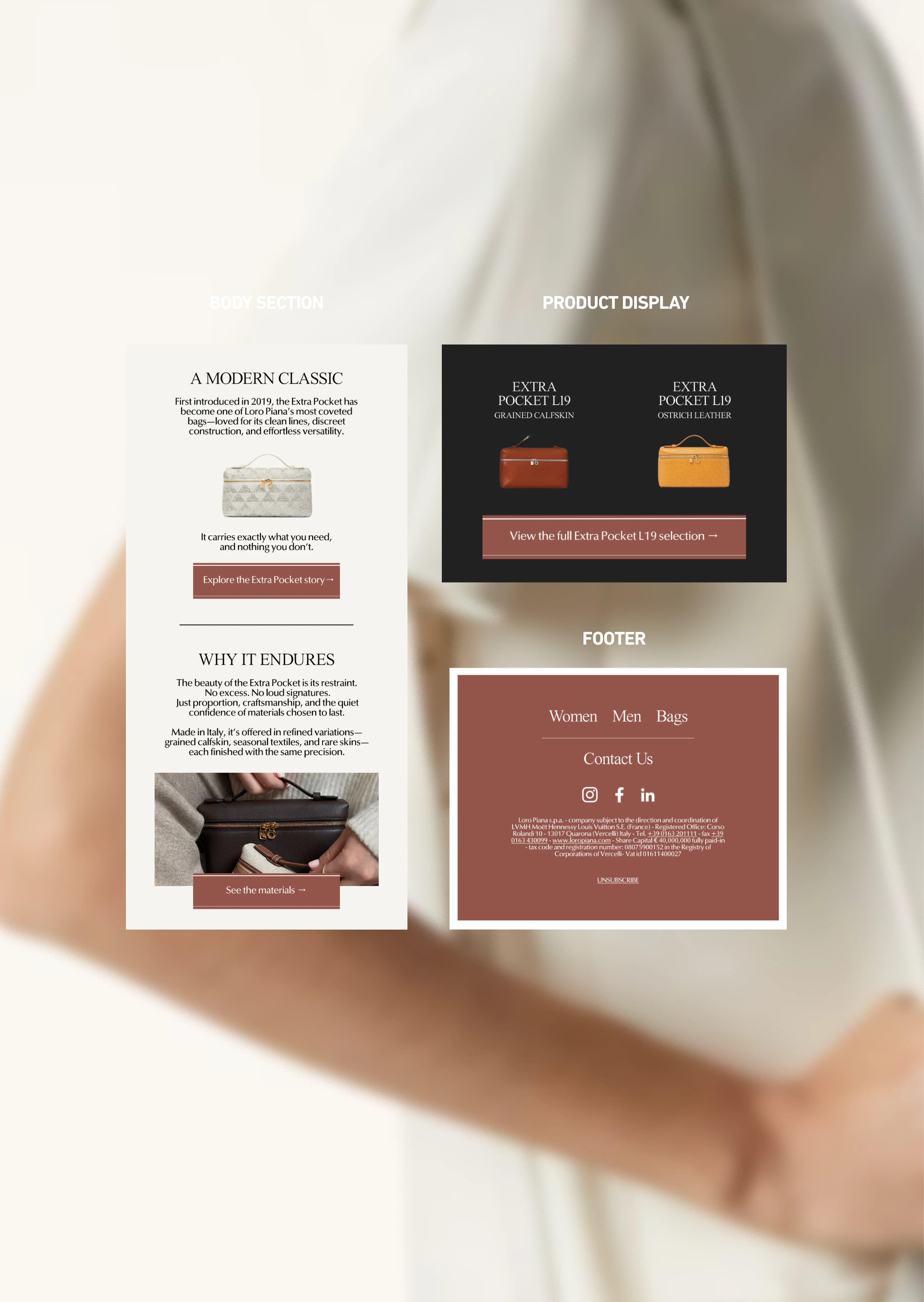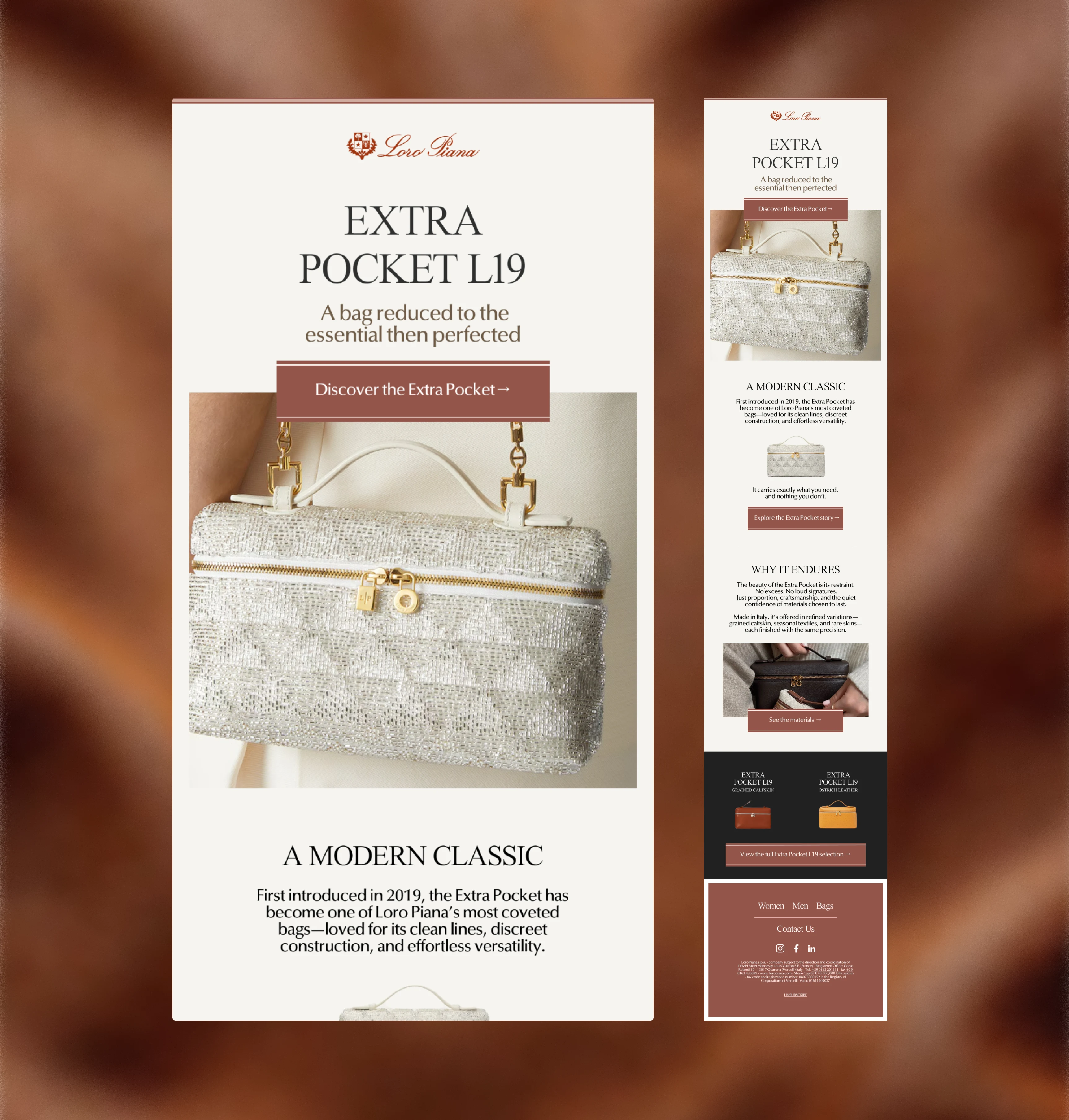 Designed a refined product campaign email for Loro Piana introducing the Extra Pocket L19 — positioning it not as a trend-driven accessory, but as a modern heirloom piece defined by restraint, craftsmanship, and material integrity.
