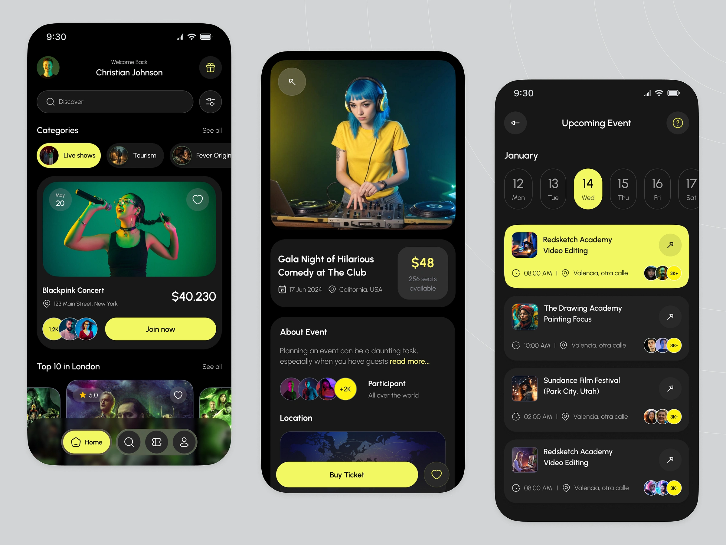 A modern event management app designed to help users discover, explore, and book live events effortlessly. From concerts and comedy shows to workshops and festivals, the app delivers a smooth browsing experience with clear event details, intuitive navigation, and a fast ticket booking flow—all wrapped in a bold dark UI with high-contrast highlights.
