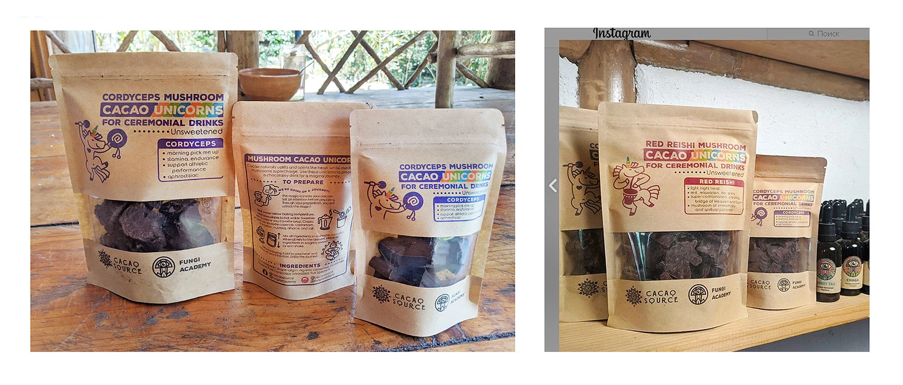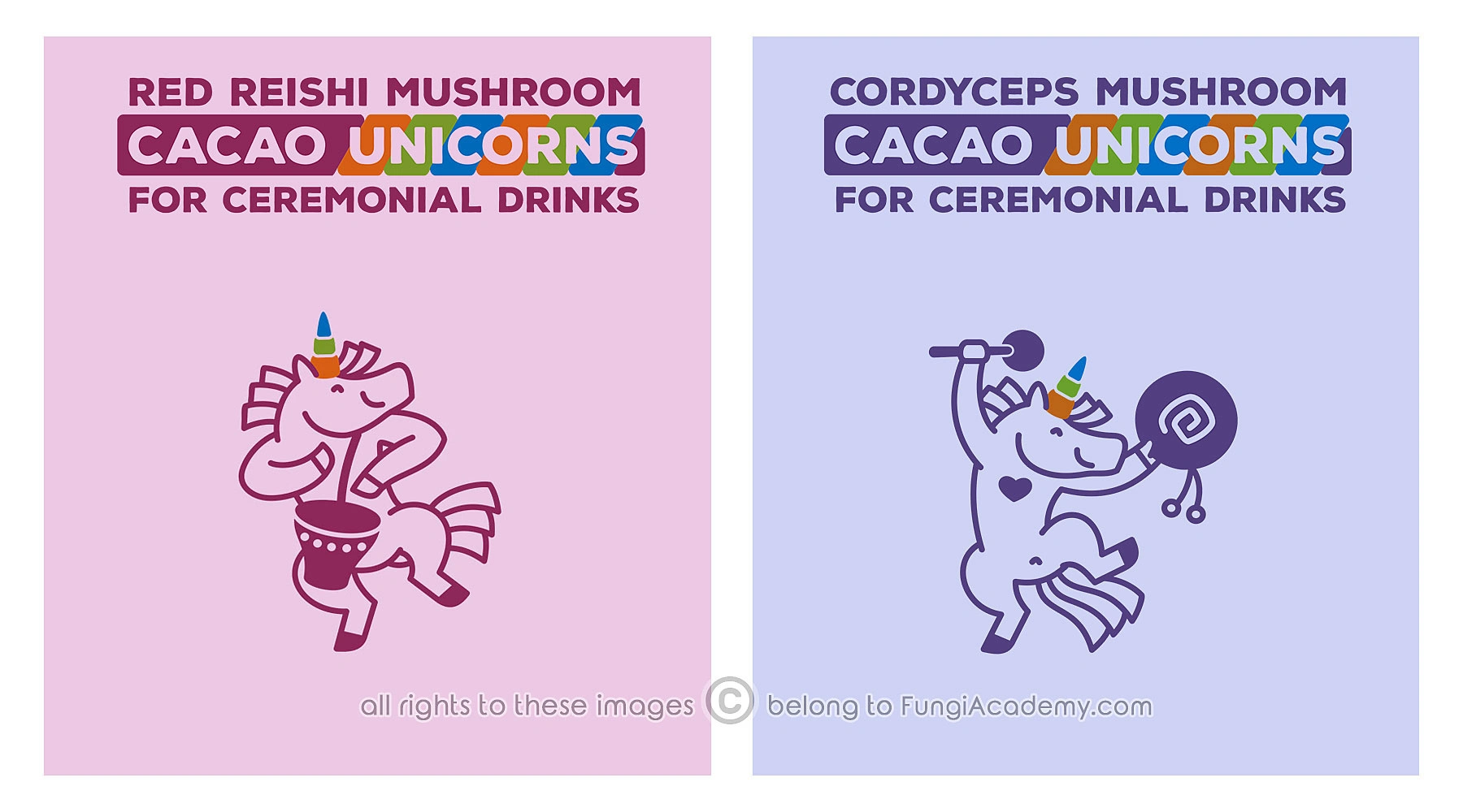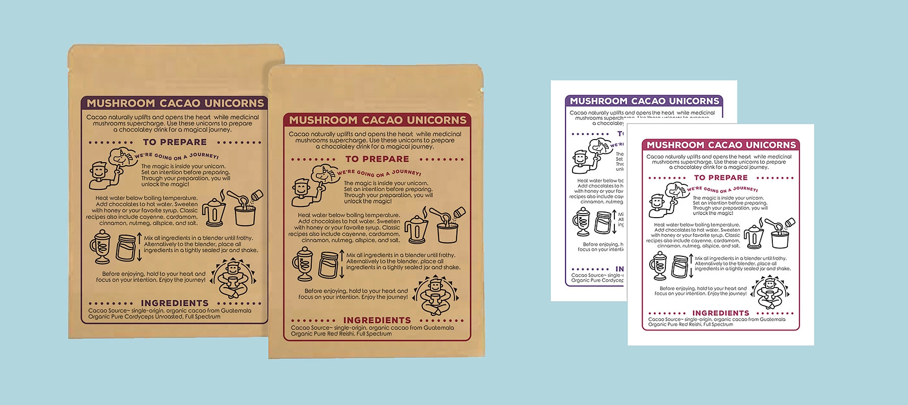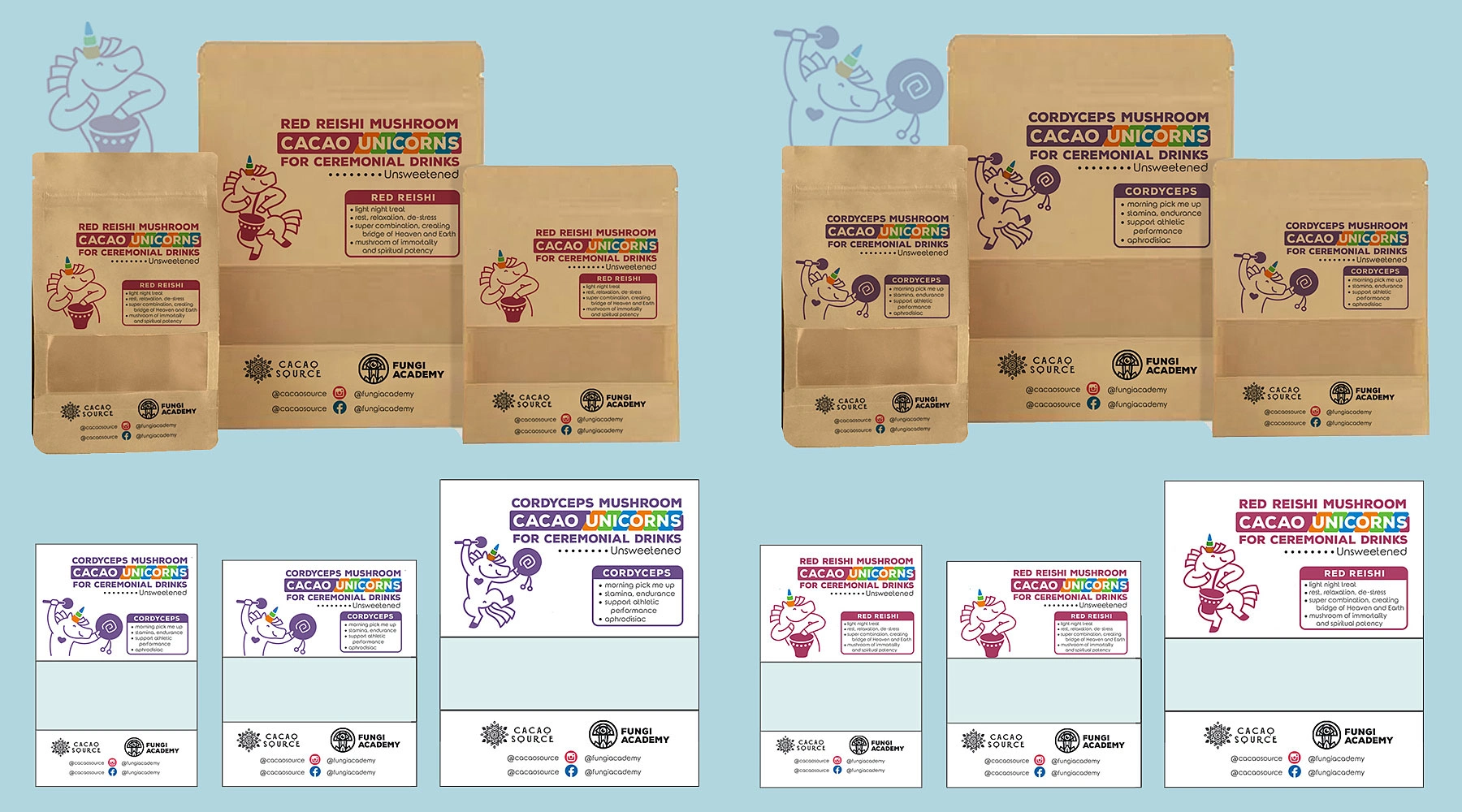 Cacao Source (sourcecacao.com) and Fungi Academy (fungiacademy.com) companies, for the result of their collaboration - portioned unicorns-shaped Ceremonial Cocoa with the addition of helaing Mushrooms, commissioned Julia Aliper to create the packaging design for this product. The task was to create engaging illustrations complementing the product, to design front and back (instruction) sides, for printing on eco-friendly paper bags.