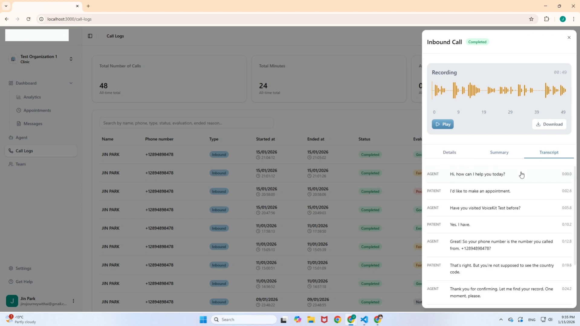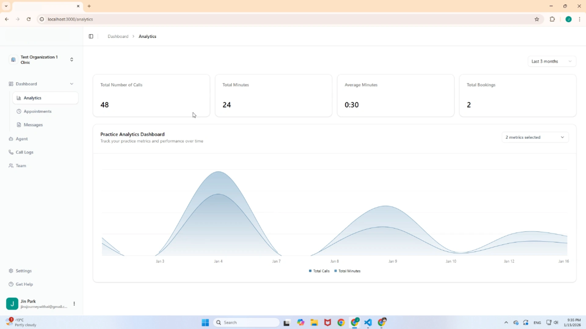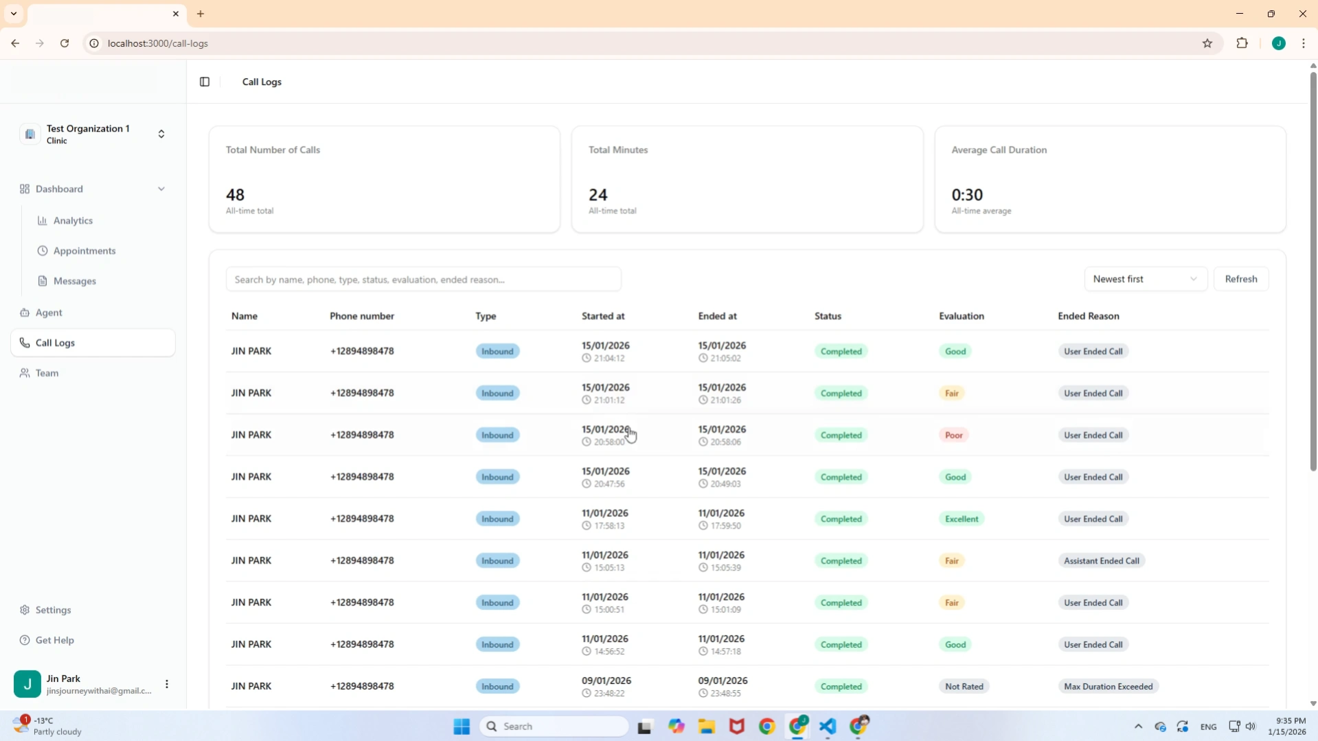 The central hub for monitoring clinic performance. This dashboard provides a high-level view of the AI agent's efficiency using real-time data.