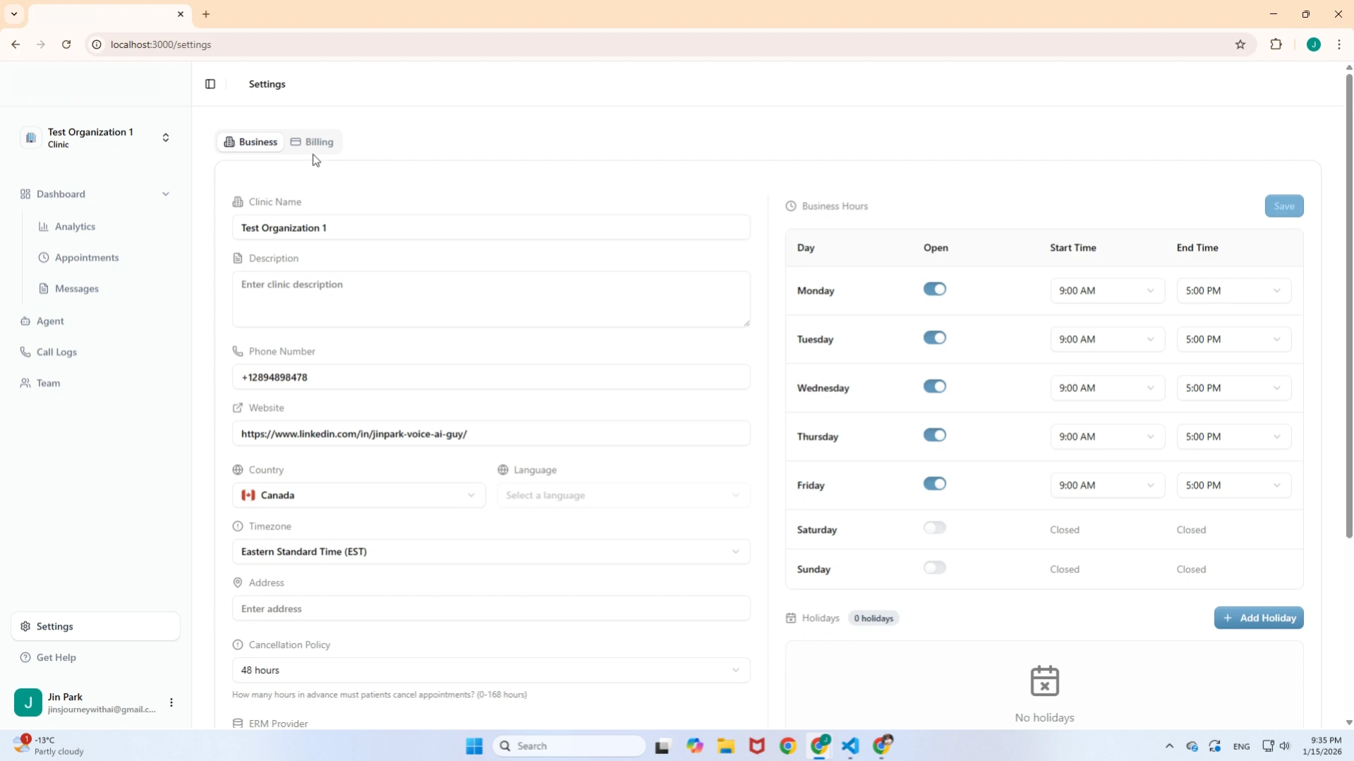 🏢 Business Profile: Manage essential clinic details including Name, Website, Timezone, and configurable Business Hours (to ensure the AI schedules appointments only when the clinic is open).