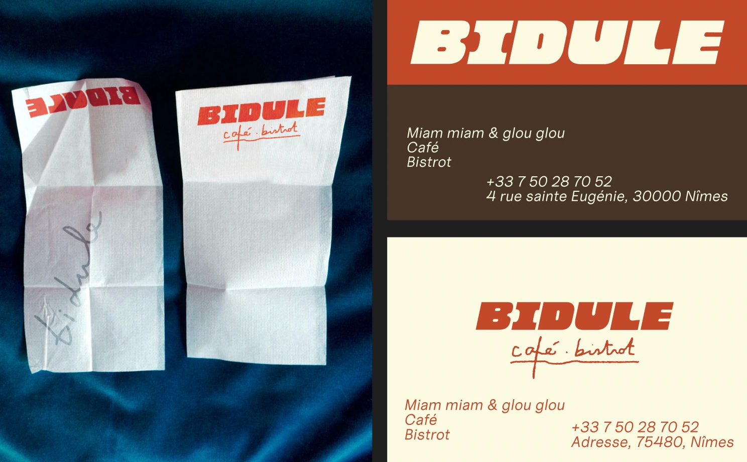 Branding for a neighborhood restaurant in Nîmes, France. Logo, menu, charter, storefront.