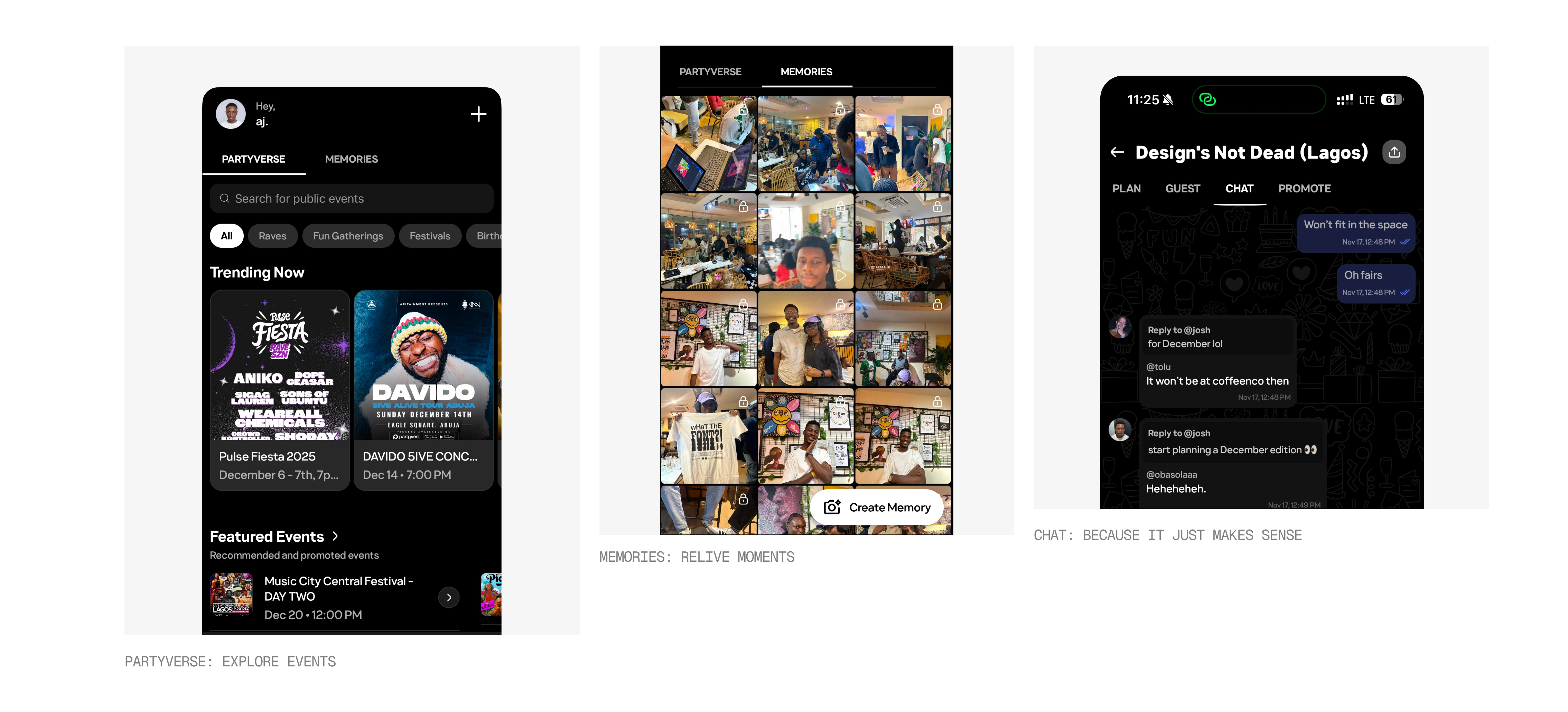 Around the same time, while planning Design Is Not Dead Lagos across iMessage, WhatsApp, and Partyverse, we noticed another gap. Groups needed a place to talk inside the app. That insight turned into Chat, so planning and coordination never have to leave Partyverse.