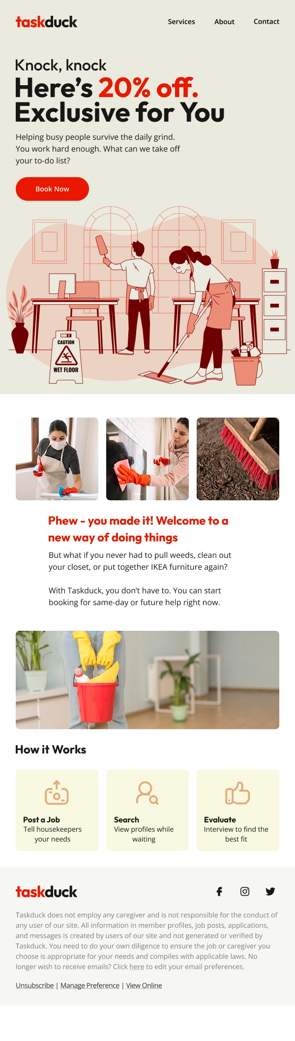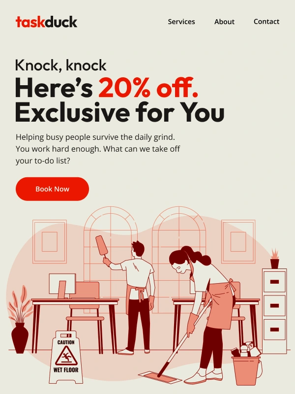 This project involved designing a promotional email newsletter for TaskDuck Cleaning Services, centered around a limited-time 20% discount offer. The goal was to capture attention quickly, communicate the value of the offer clearly, and drive immediate bookings while maintaining a professional and trustworthy brand image.