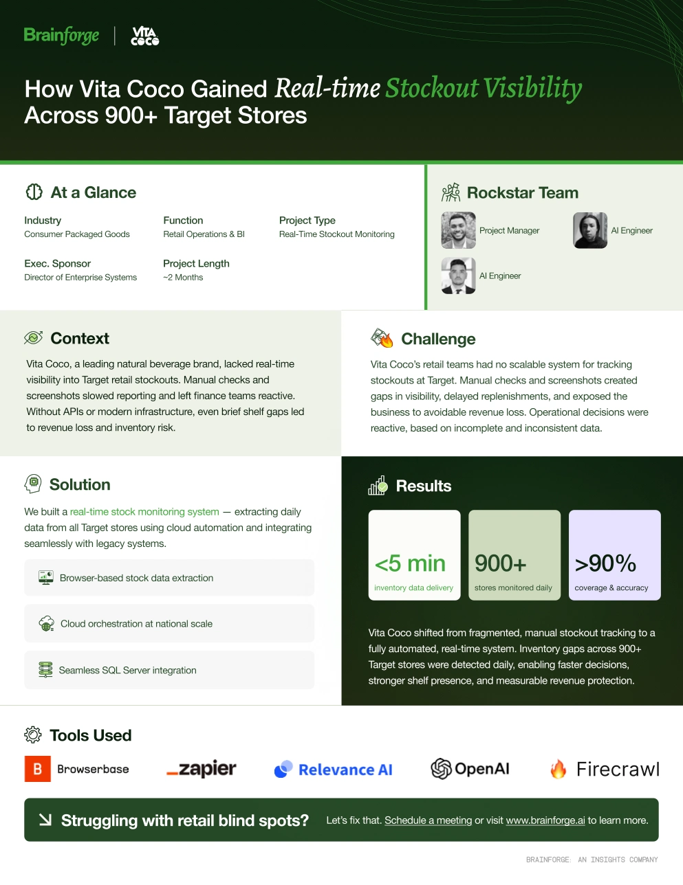 To fix slow, manual stock checks, we launched a system that tracks 900+ Target stores in real time with <5 min delivery and >90% accuracy.