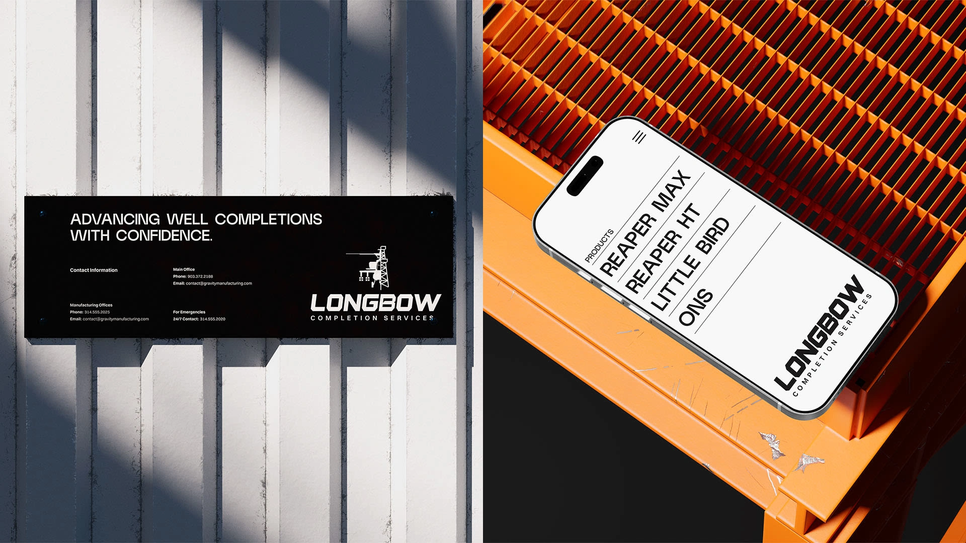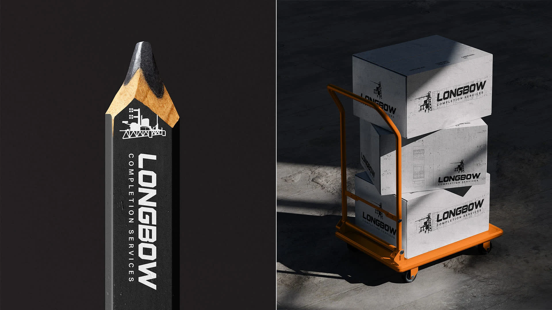 Visual brand identity for oil and gas manufacturer—Longbow Completion Services. Brand identity positioned Longbow as a professional partner in the industry.