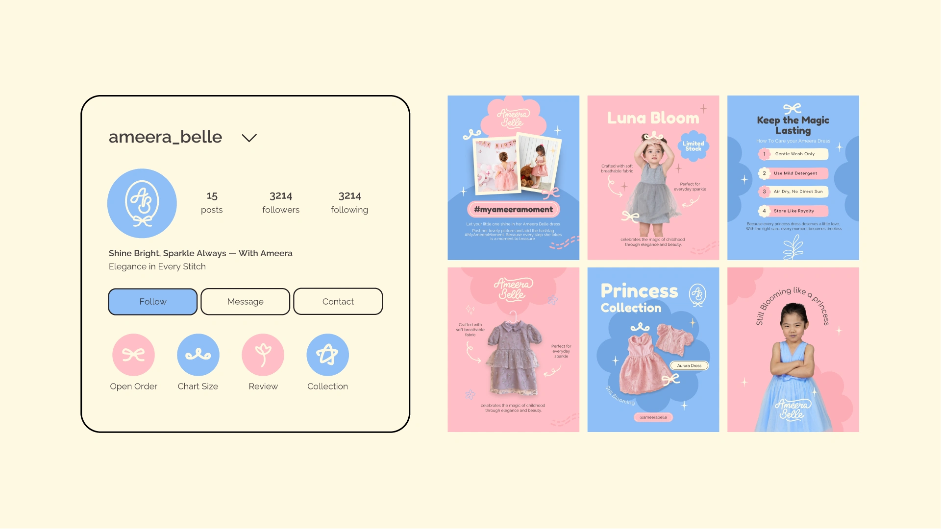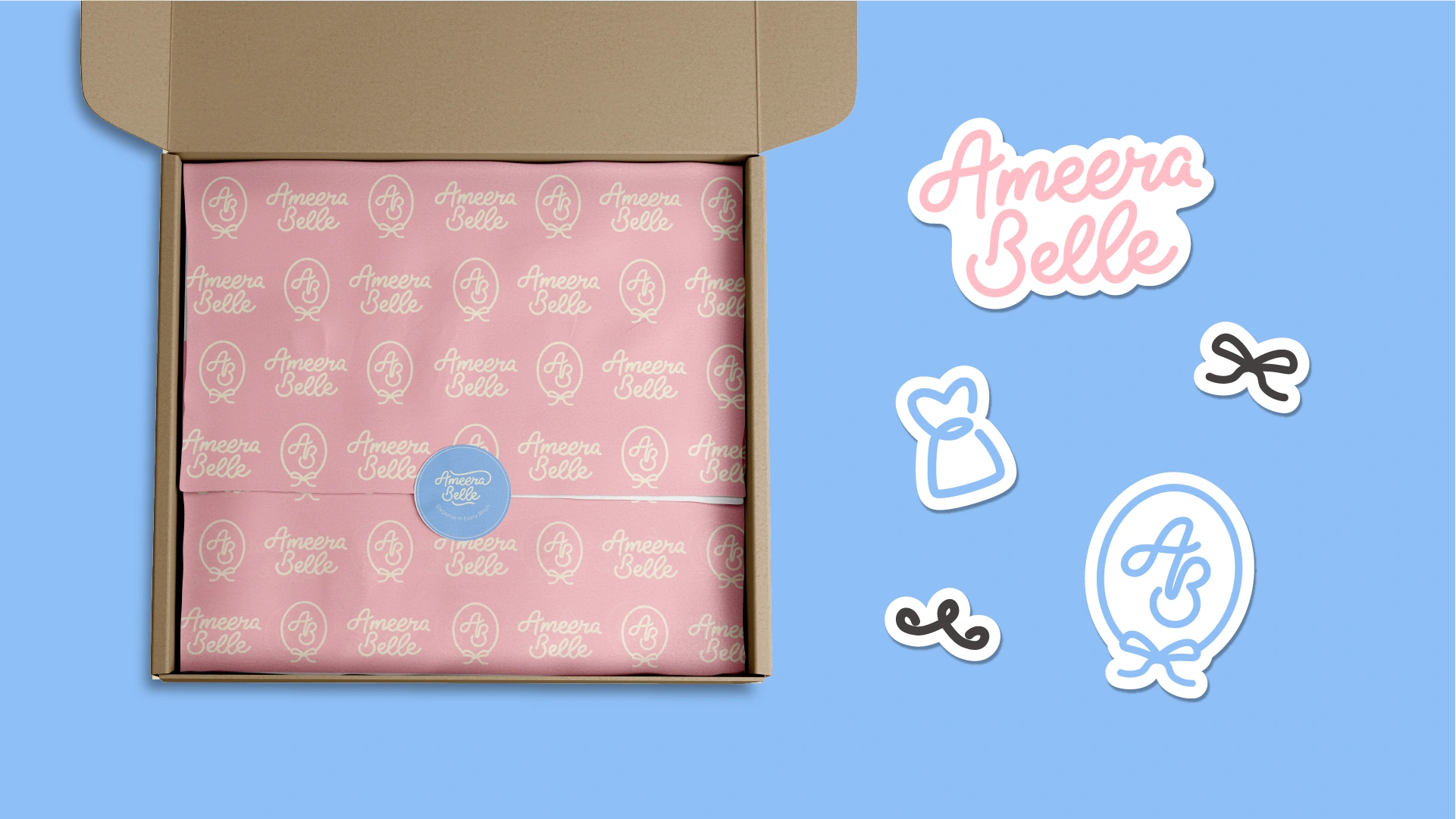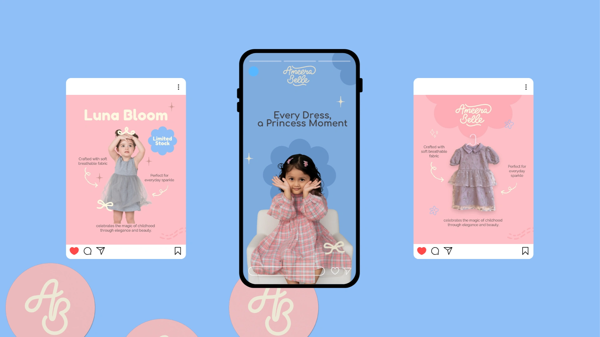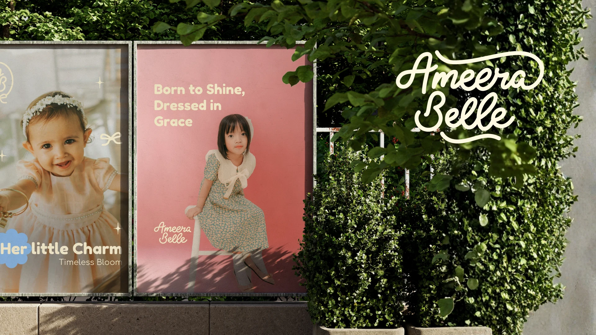 Ameera Belle is a children’s fashion brand identity designed to celebrate softness, elegance, and timeless childhood moments. The project features a cohesive visual system spanning logo design, color palette, packaging, social media, and environmental applications—crafted to create an emotional, premium brand experience for modern parents.