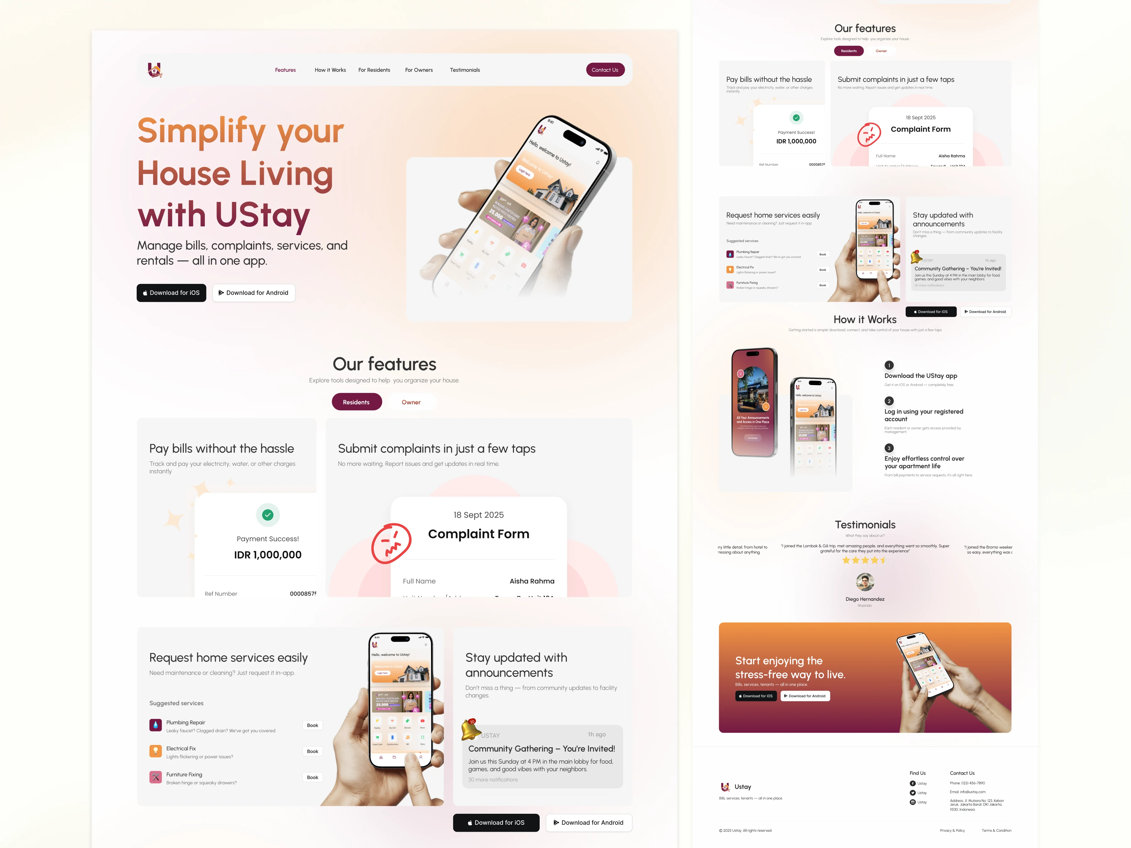Between July and October 2025, I led the UStay project from concept to a working product. My role focused on shaping the user experience and making sure the app worked seamlessly for different roles owners, residents, staff, and admins. During this period, I collaborated with the team to define key features, design the user flows, and translate them into a functional prototype in Framer. By the end of the project, we had a real, working version of UStay that could handle core tasks like rent payments, service requests, chat, and building management in one platform.