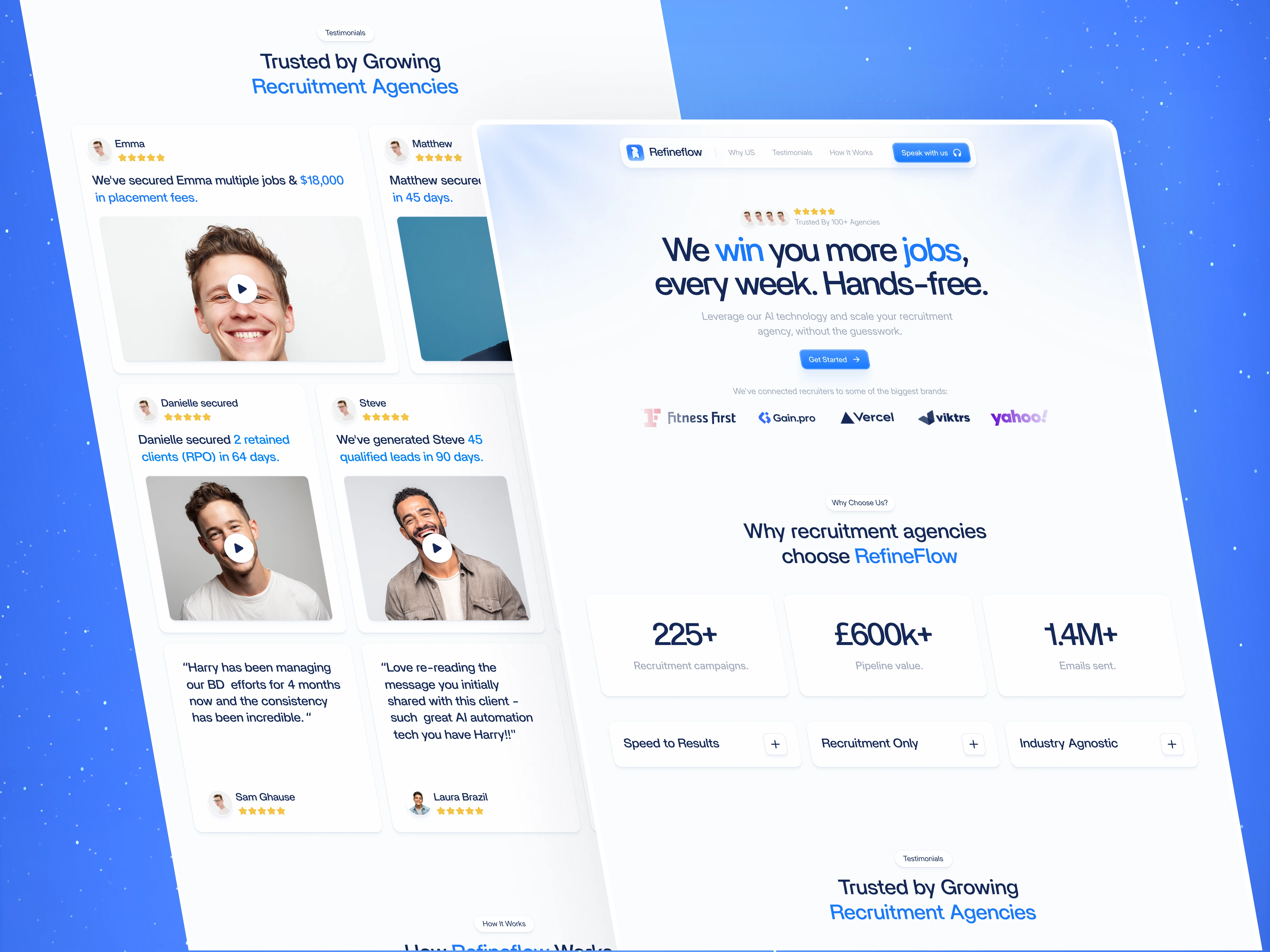 RefineFlow is an AI powered platform that helps recruitment agencies generate leads and scale without manual outreach. The landing page was designed to clearly explain the offer and drive demo bookings.