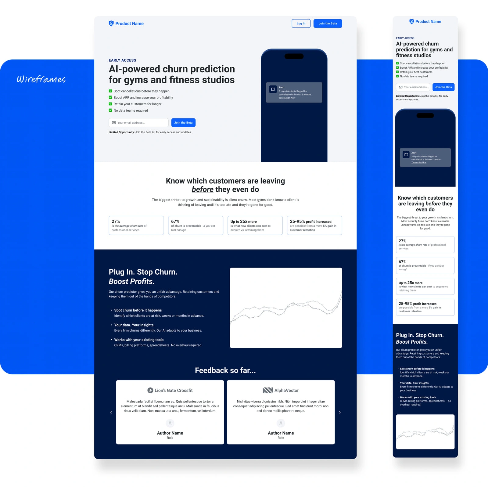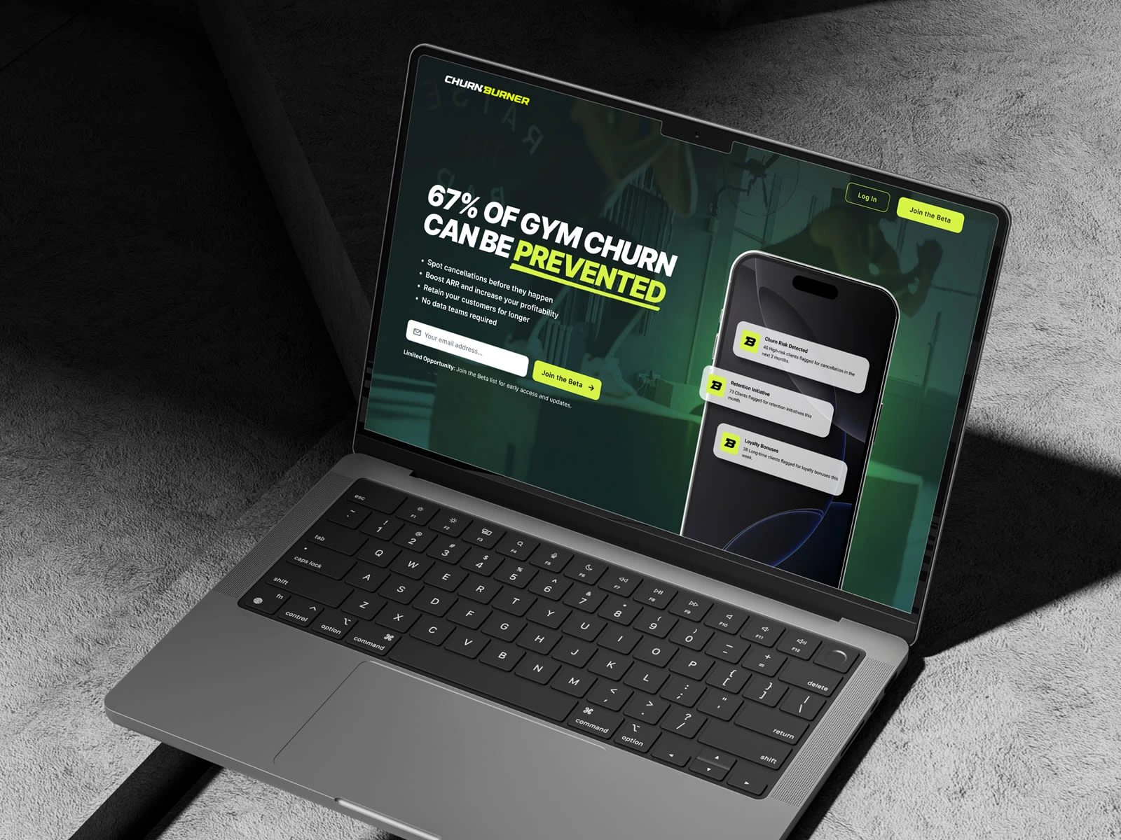 Brand and landing page for an AI-based churn prediction platform for gym owners. Helping to validate a new niche and build early interest in weeks.