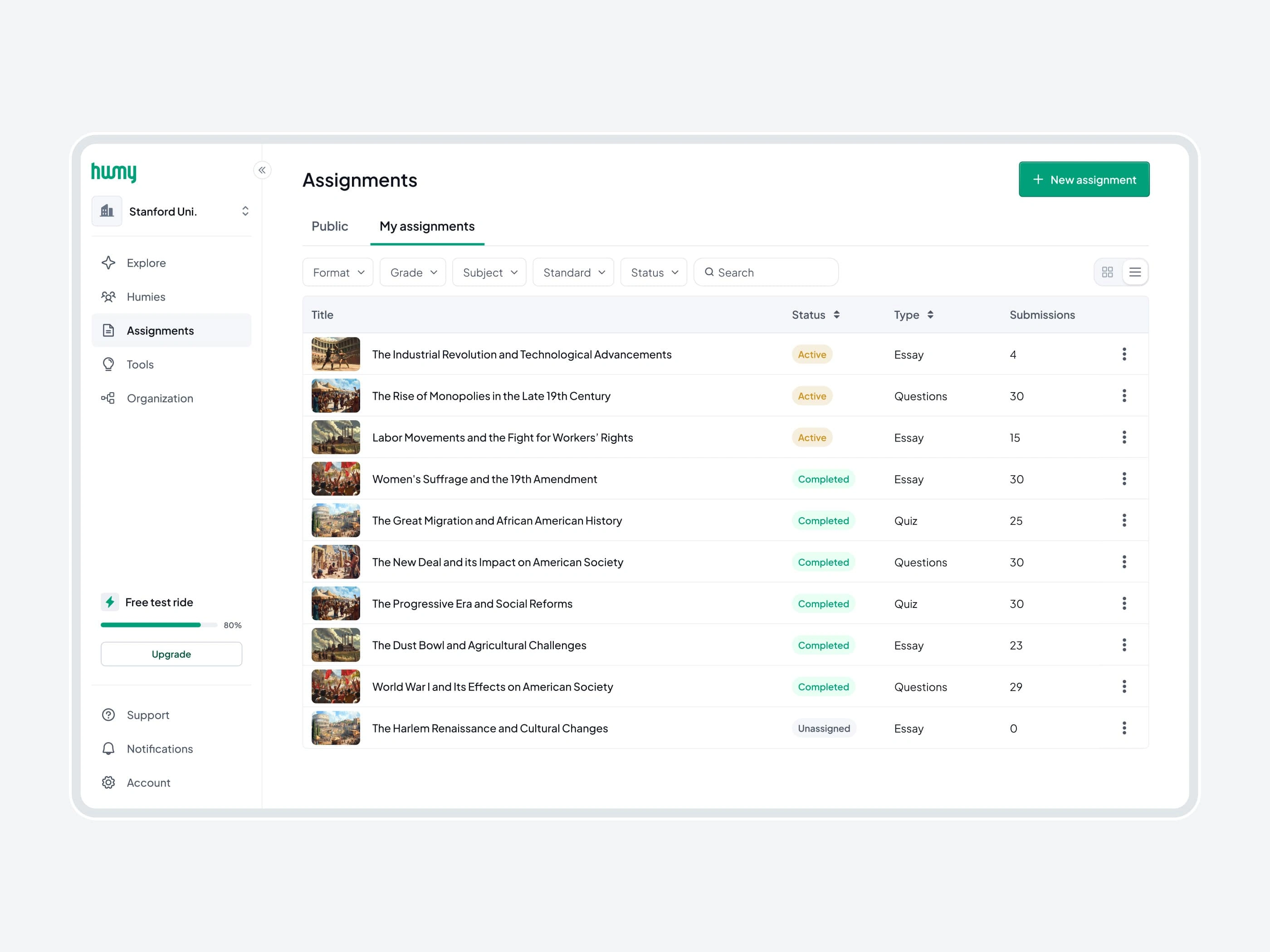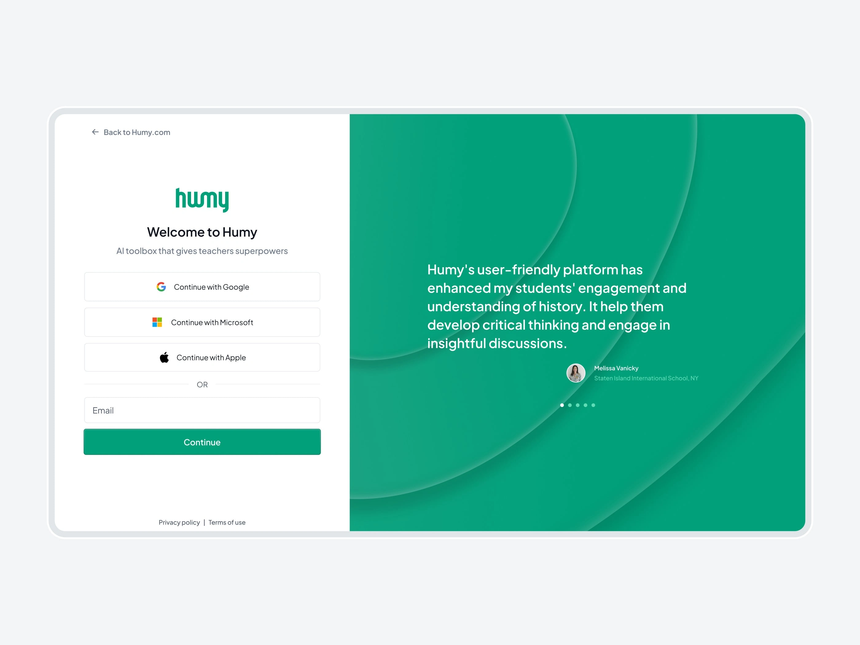 The Client: Humy.ai (Web Platform) – helps teachers save time by simplifying assignment creation and grading. It also provides students with 24/7 support through custom AI teaching assistants tailored to the teacher’s curriculum and workflow.
