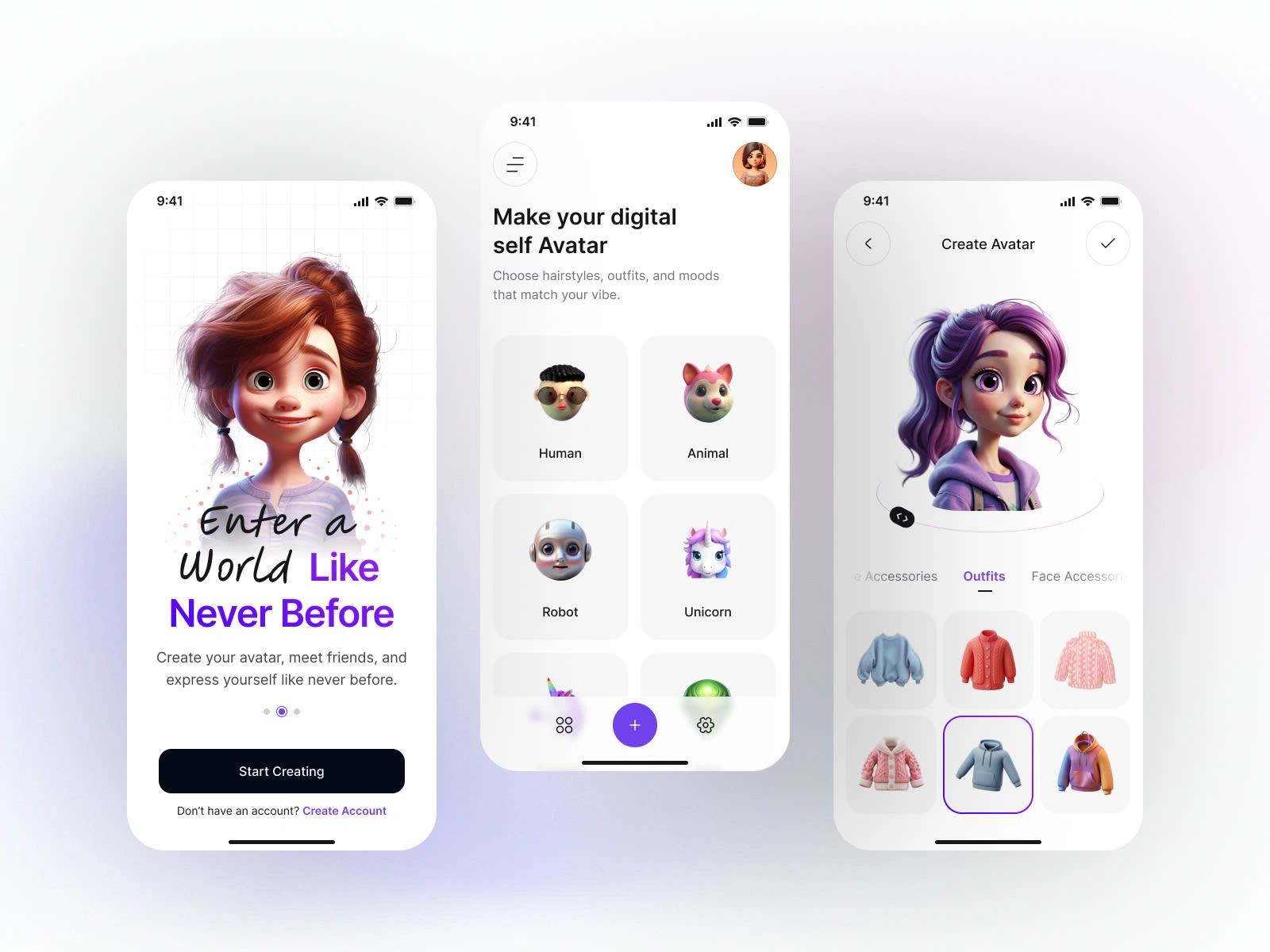 As the sole UX/UI designer, I followed the Design Thinking process to build the digital avatar making app. I started with user research and market analysis to understand how people create and personalize avatars, identifying pain points like limited customization and confusing editing tools. I created user personas and mapped user journeys to define a smooth flow from choosing a base style to customizing features like face, outfits, and accessories. Wireframes were developed to test usability and simplify navigation before moving into high-fidelity UI design. I focused on visual hierarchy, accessibility, and micro-interactions to make customization fun and engaging. Using user-centered design methods, I iterated on feedback to deliver an intuitive, playful, and creative experience for users.