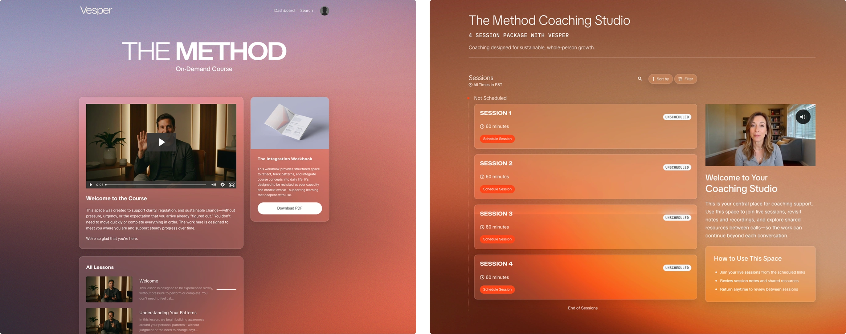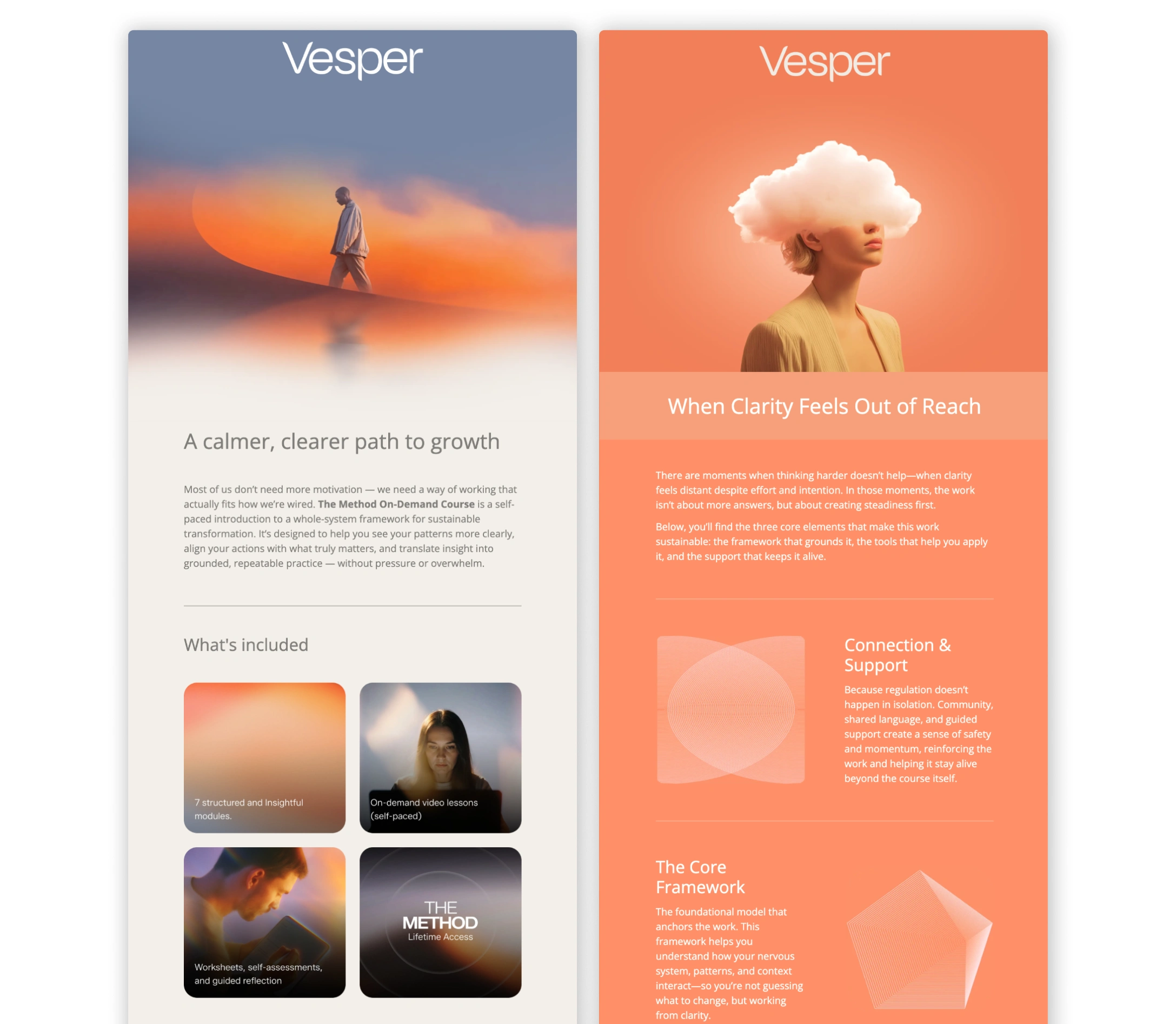 We approached Vesper as a brand world with multiple entry points. Every product—courses, community tiers, coaching offerings—needed to feel like it belonged to the same universe while maintaining its own identity.