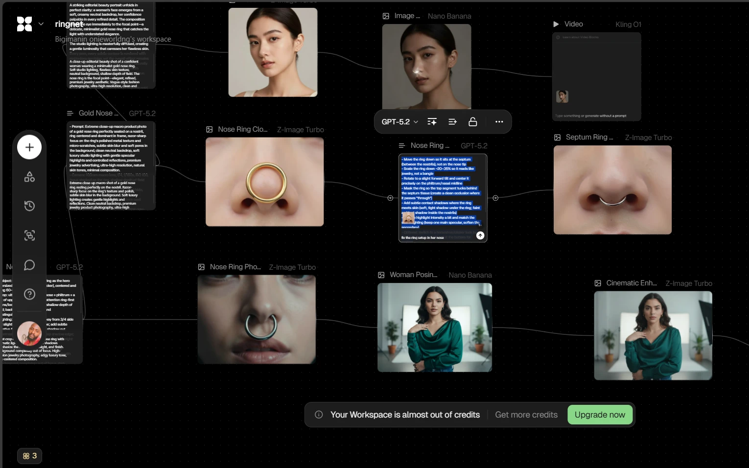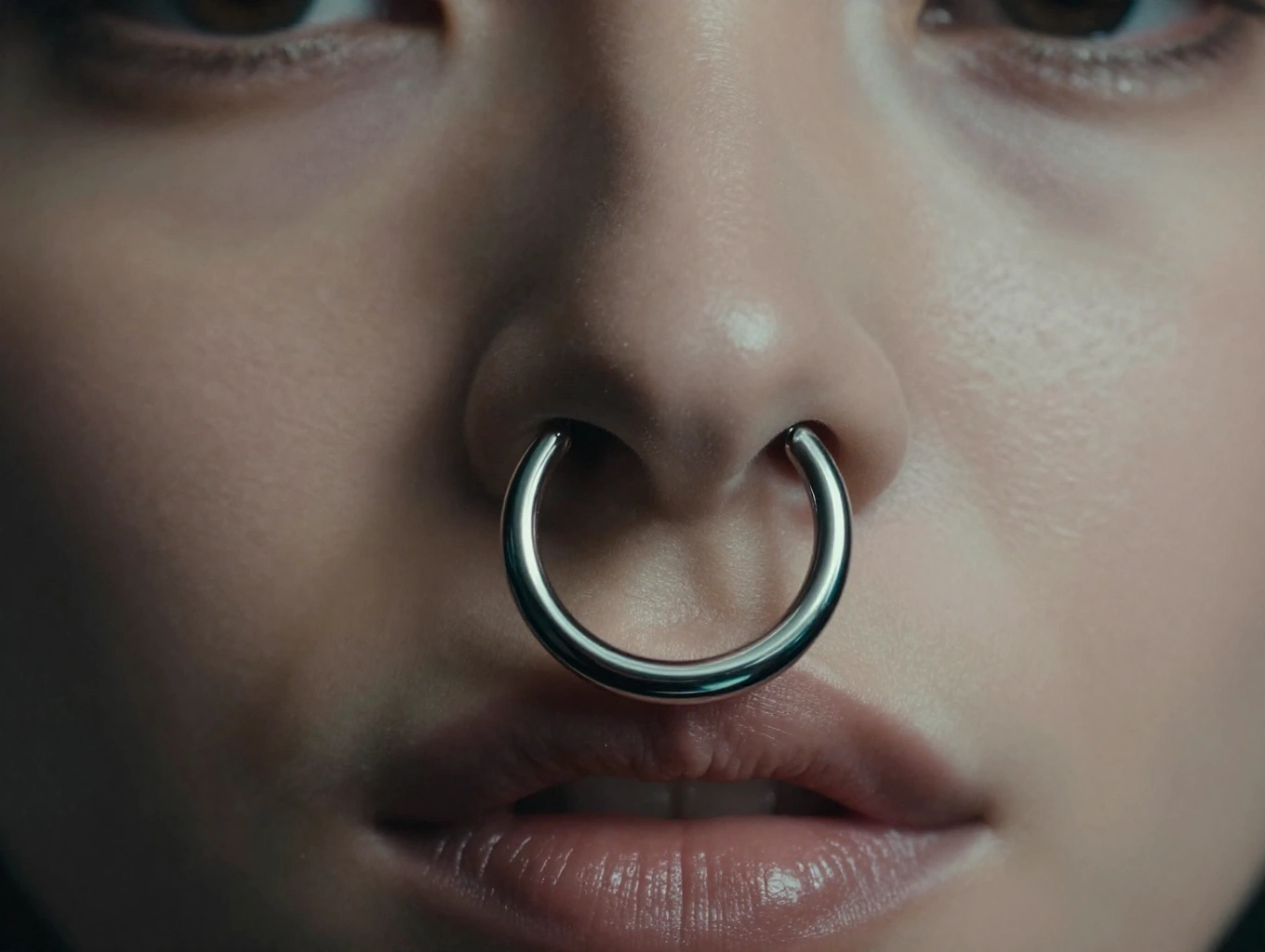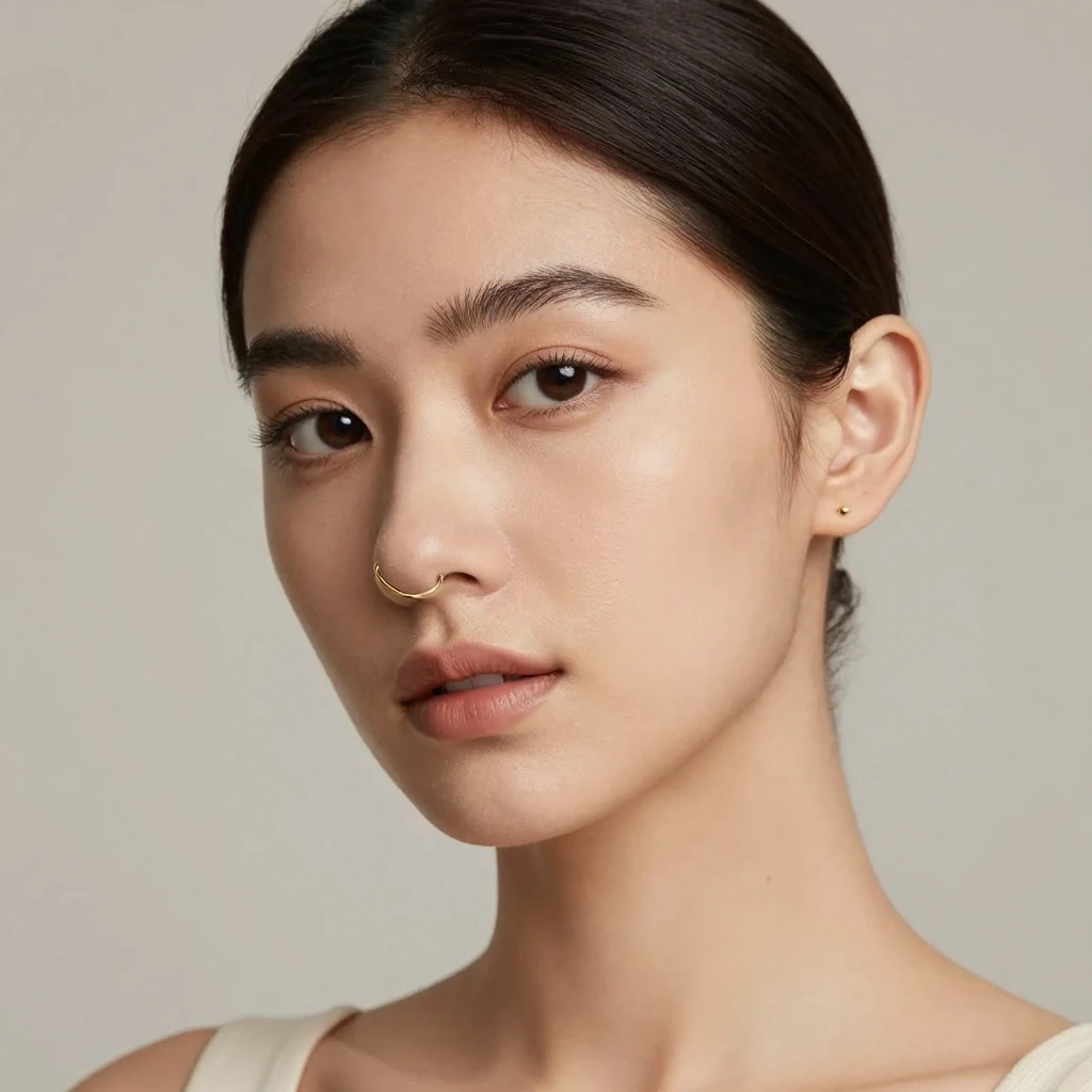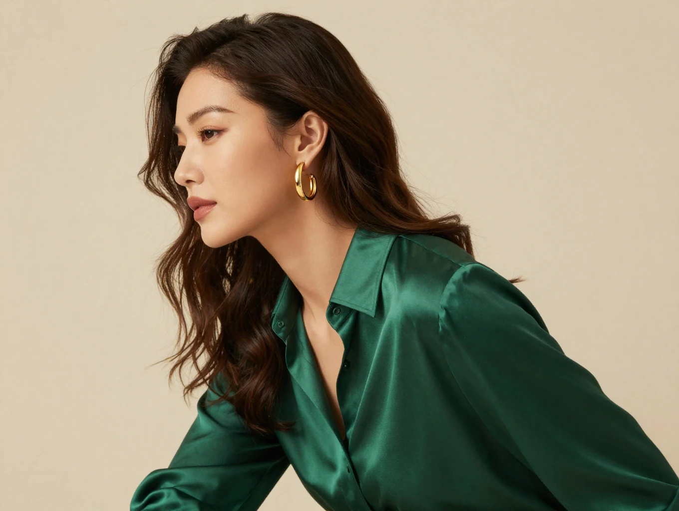 Prompt: elegant studio portrait, side view of the same woman, 90-degree profile, shoulders angled, relaxed pose, emerald satin blouse, gold hoop earrings, soft hair waves, shallow depth of field, high-end fashion editorial, clean minimal studio background