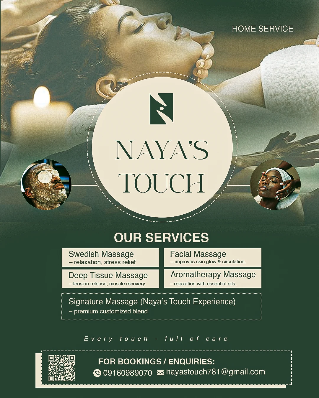 Naya’s Touch Spa & Massage is a luxury wellness brand focused on providing holistic spa experiences through touch, aroma, and tranquility. The project’s goal was to elevate the brand’s online and offline presence with a serene, elegant, and visually cohesive design direction that communicates relaxation and premium care.