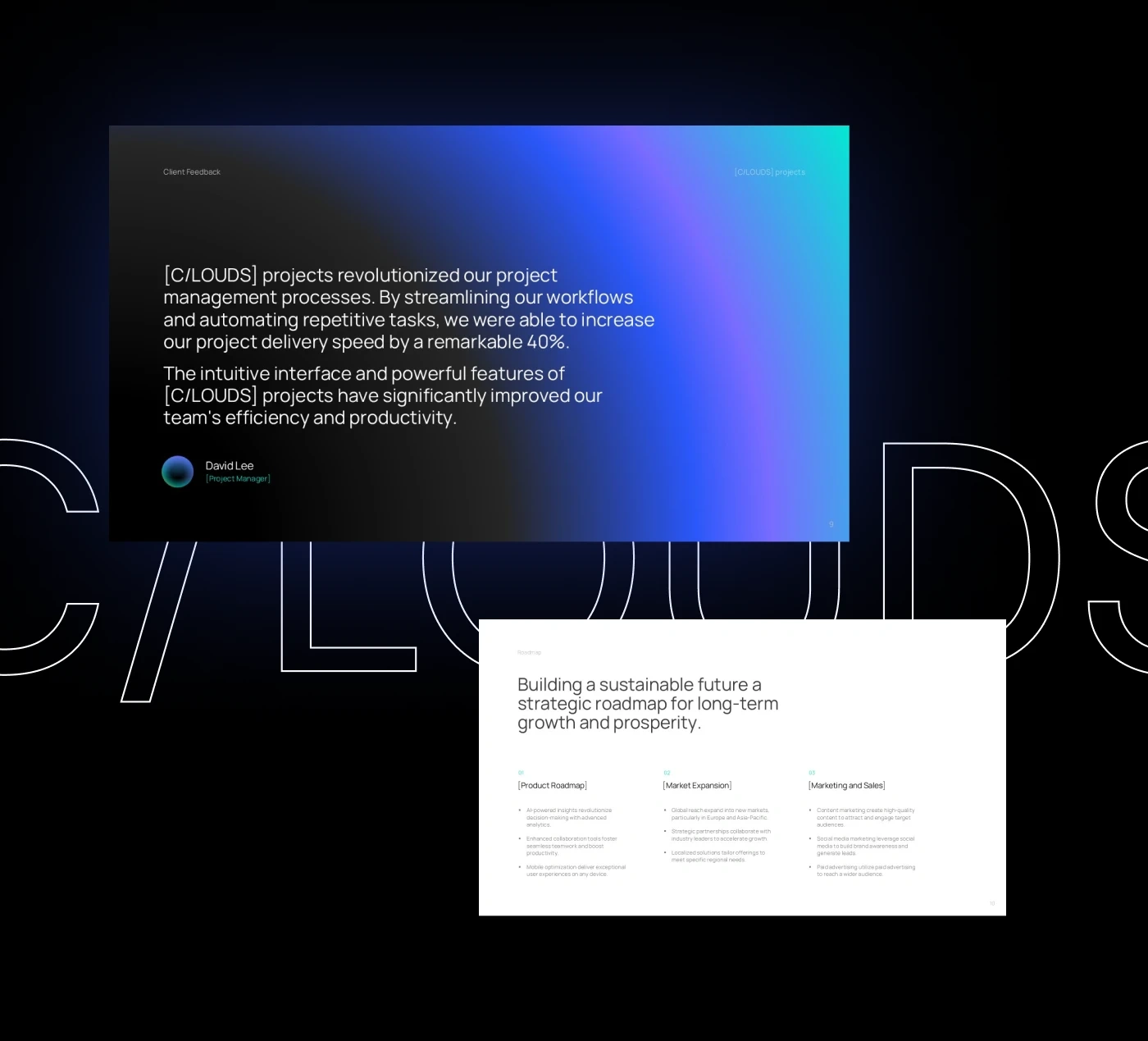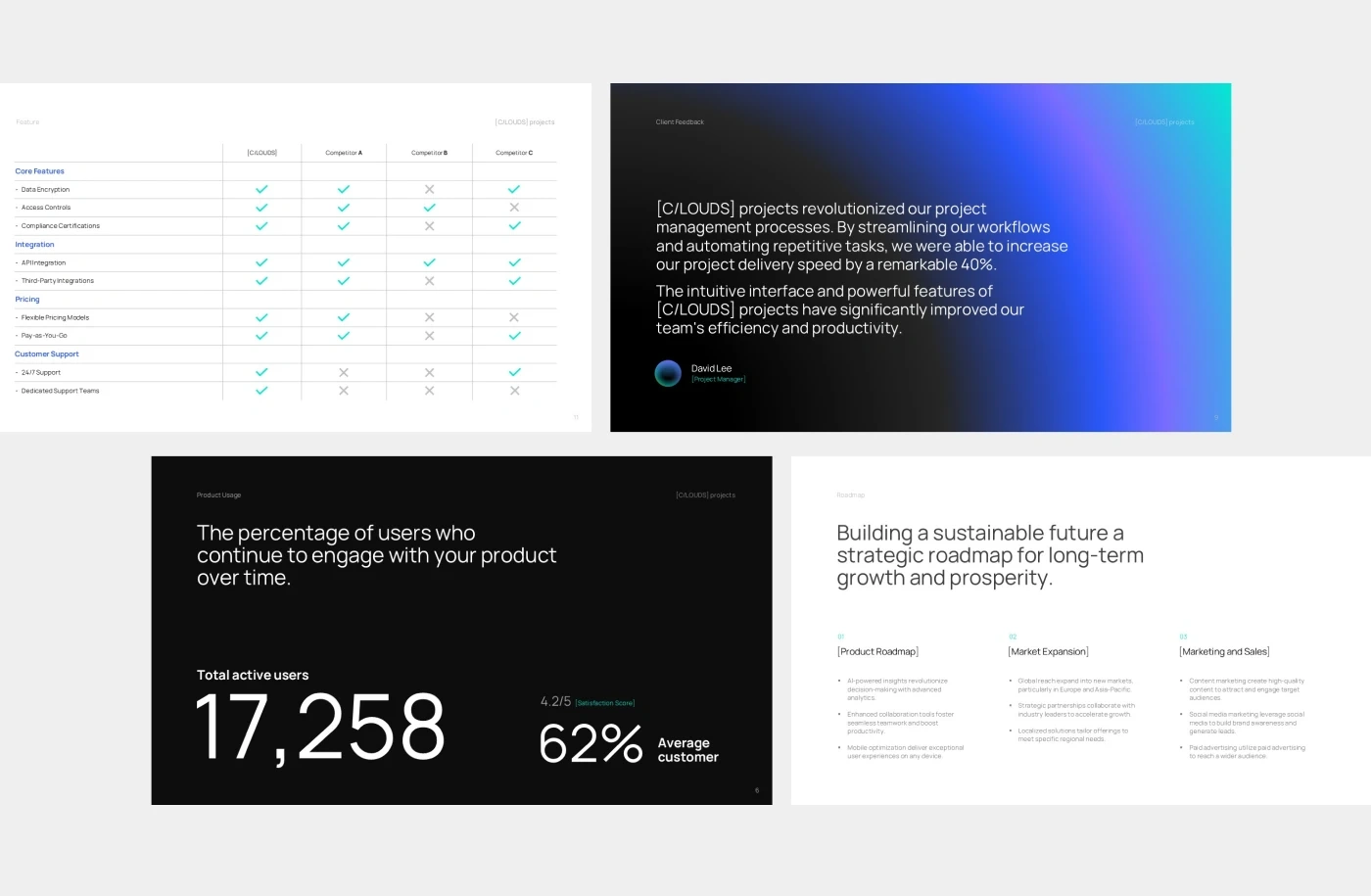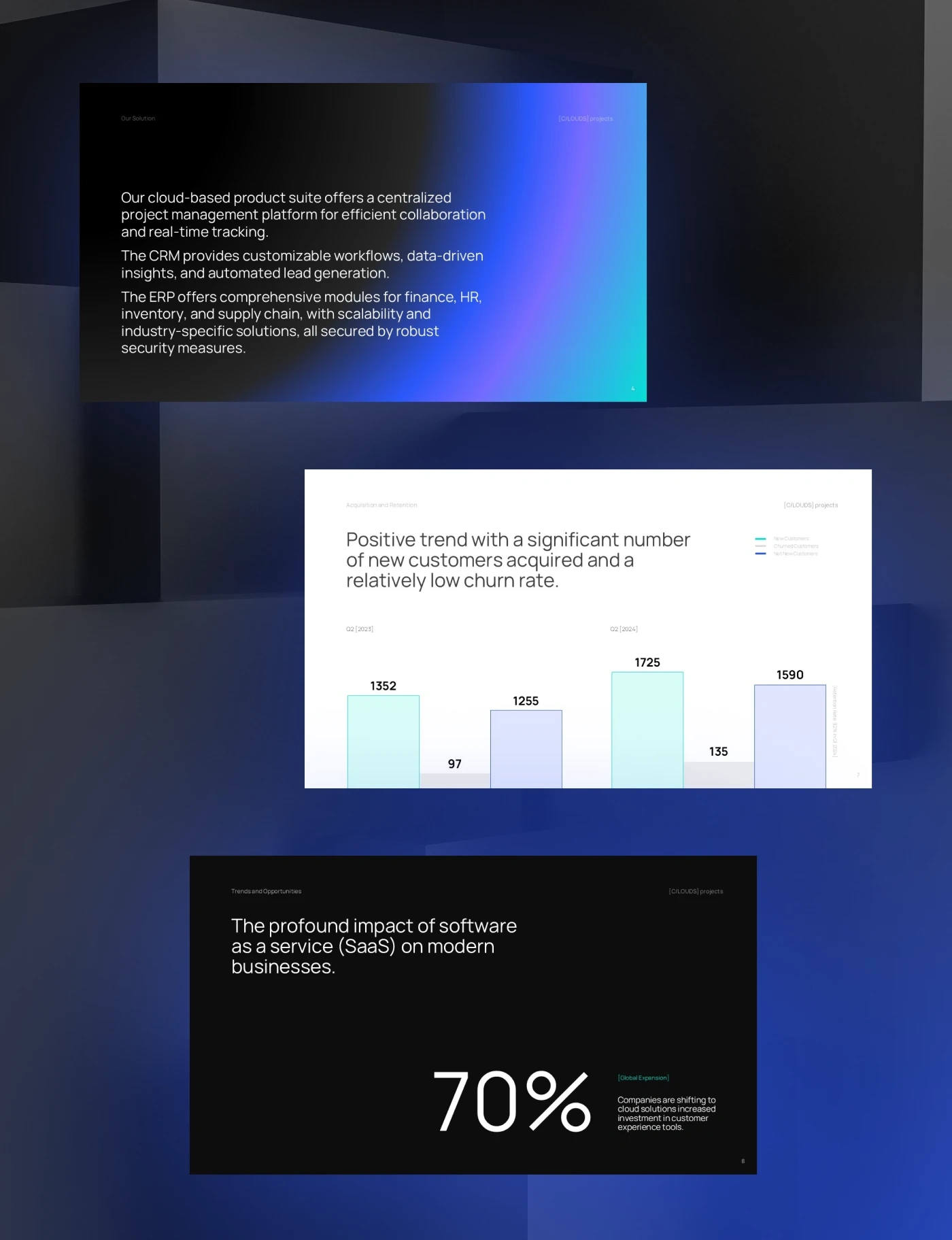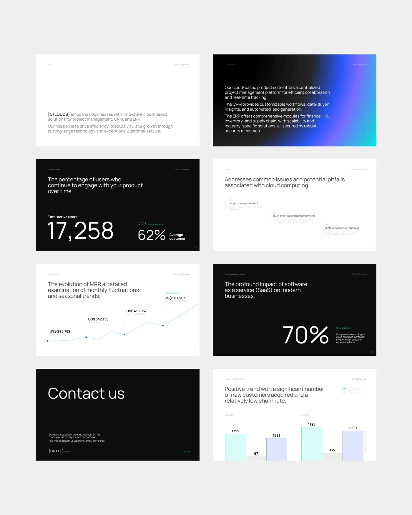 [C/LOUDS] offers a comprehensive suite of cloud-based applications designed to improve business efficiency and collaboration. Our primary products include project management, customer relationship management (CRM), and enterprise resource planning (ERP) tools. Over the past year, we have experienced significant growth and are poised to expand our market reach further.