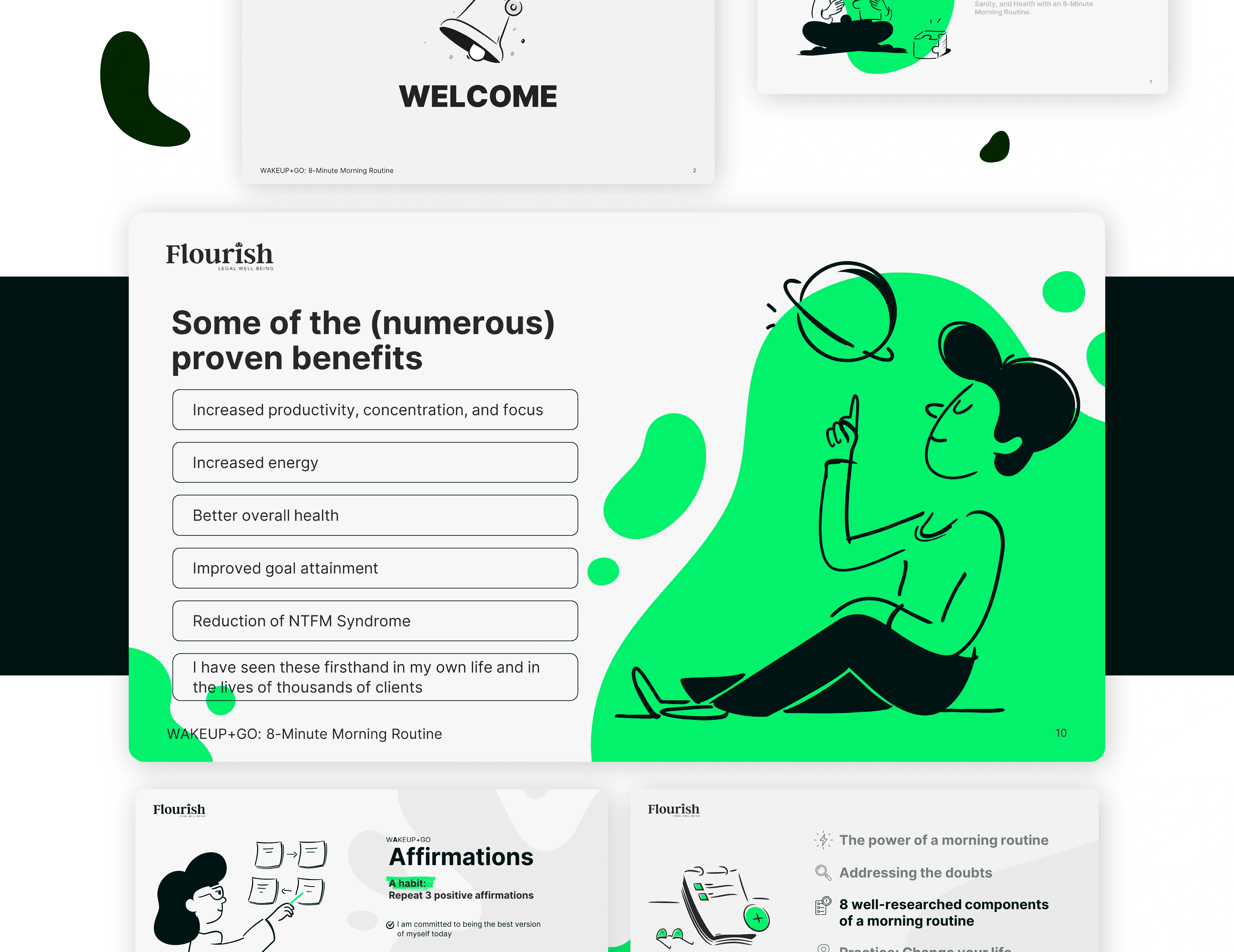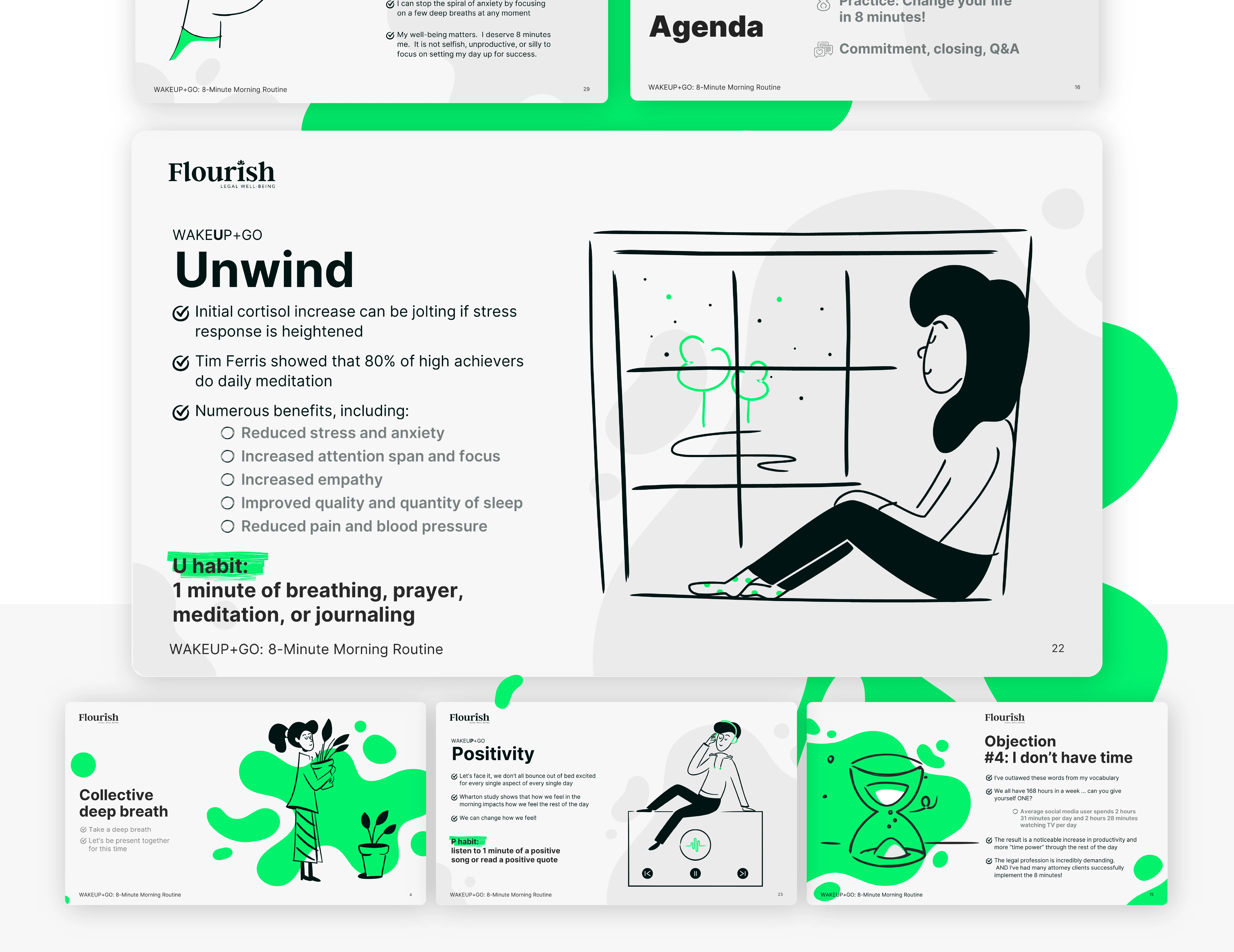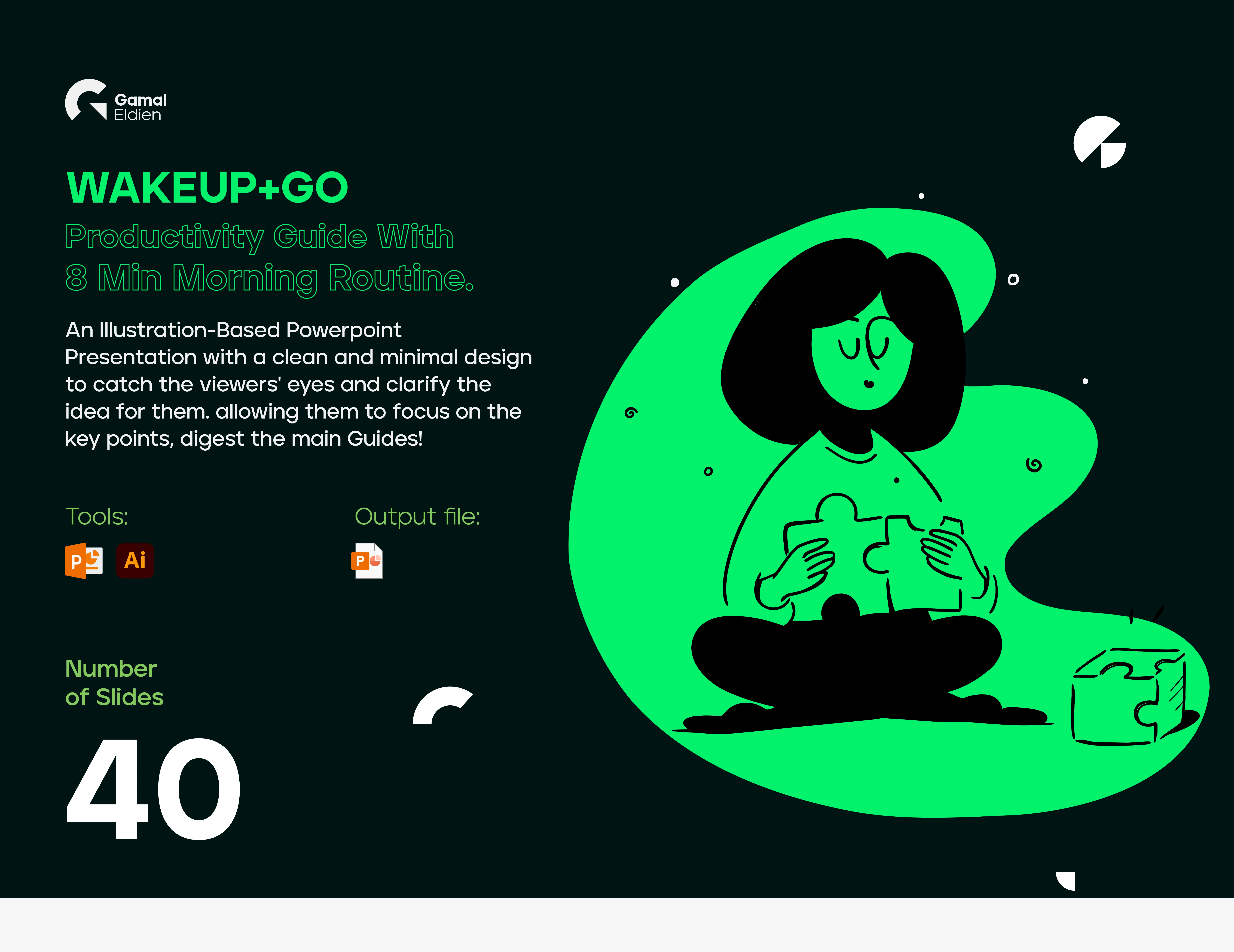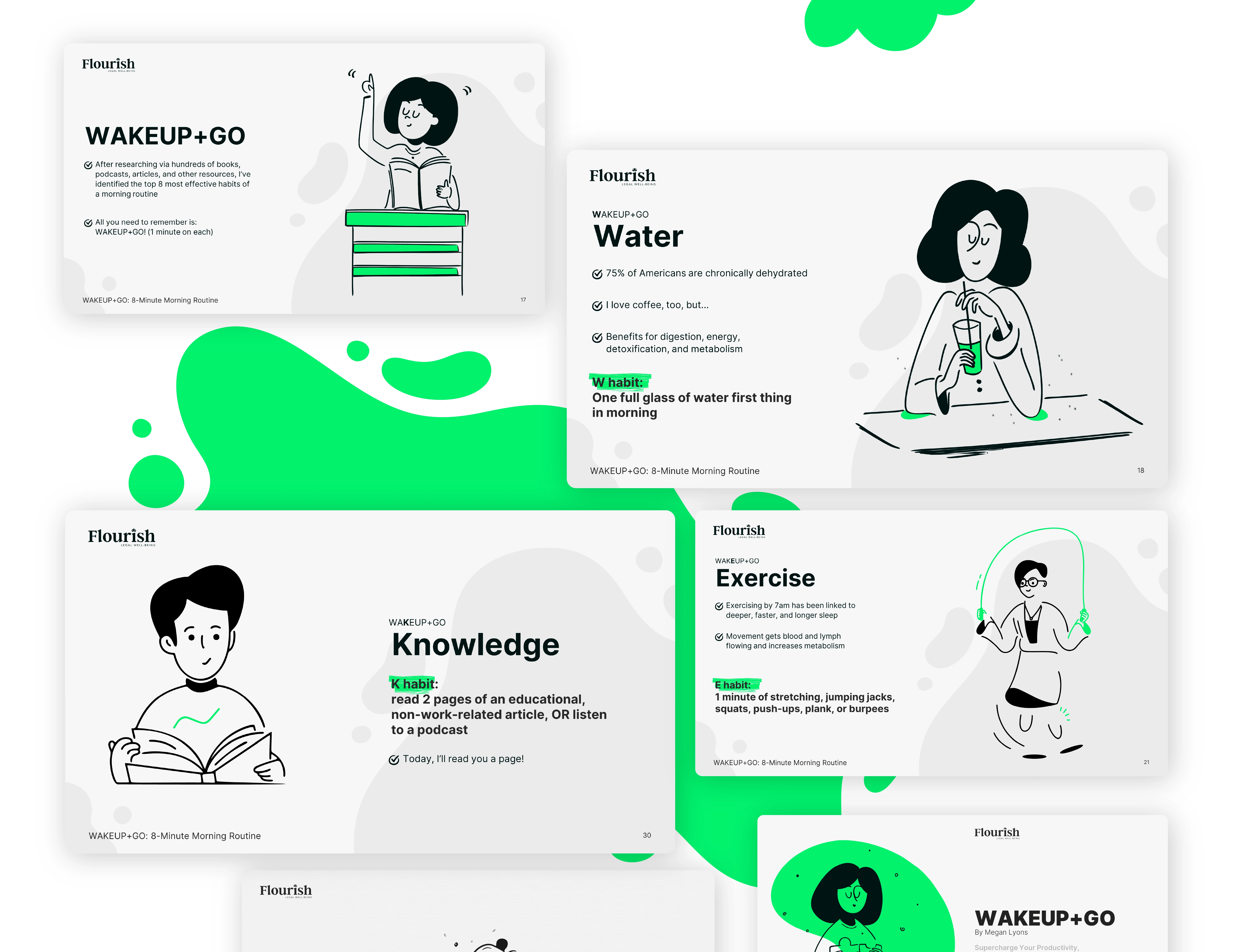 WAKEUP+GO: 8-minute morning routine productivity guide. Clean, minimal PowerPoint with illustrations that clarify key points for maximum focus and impact.