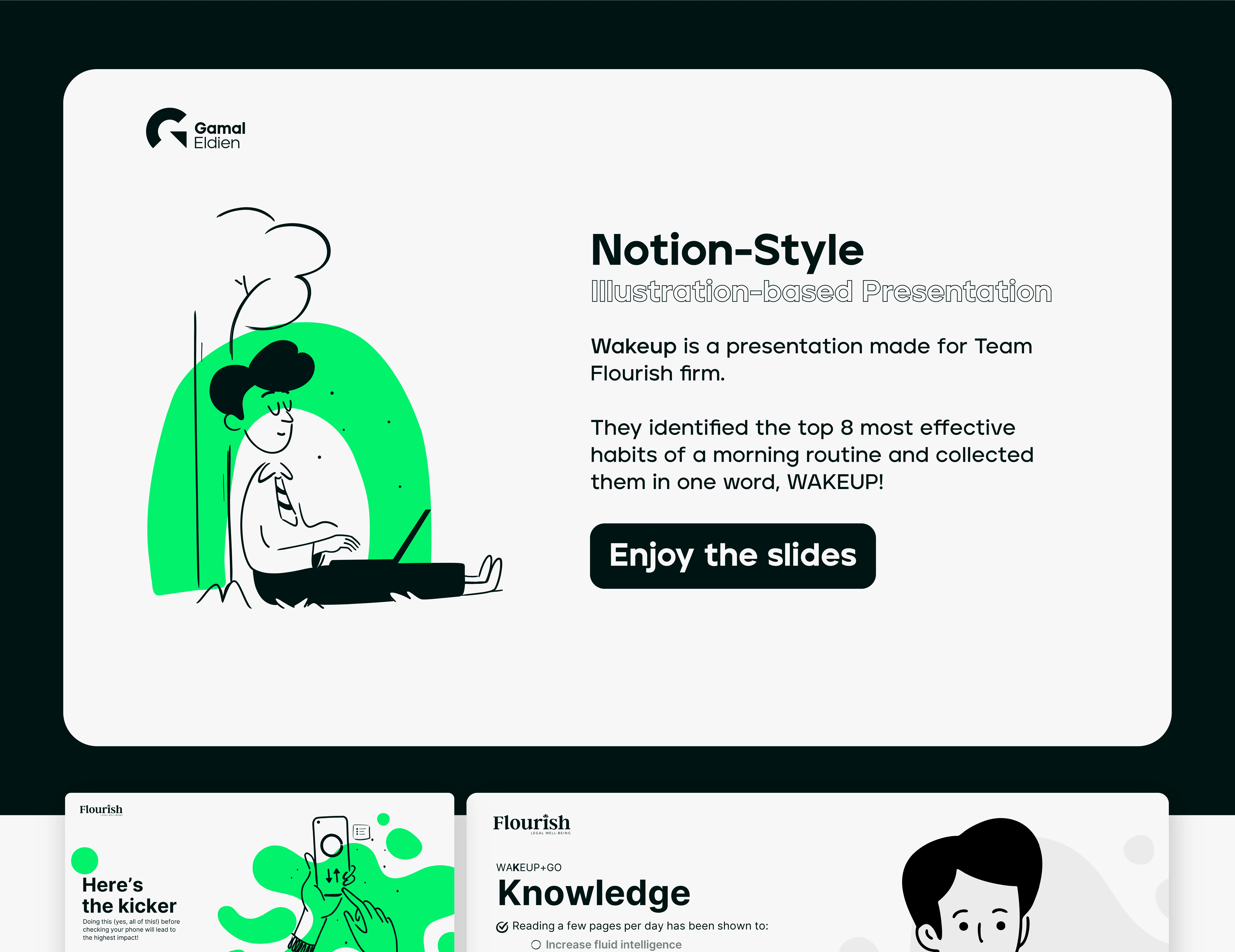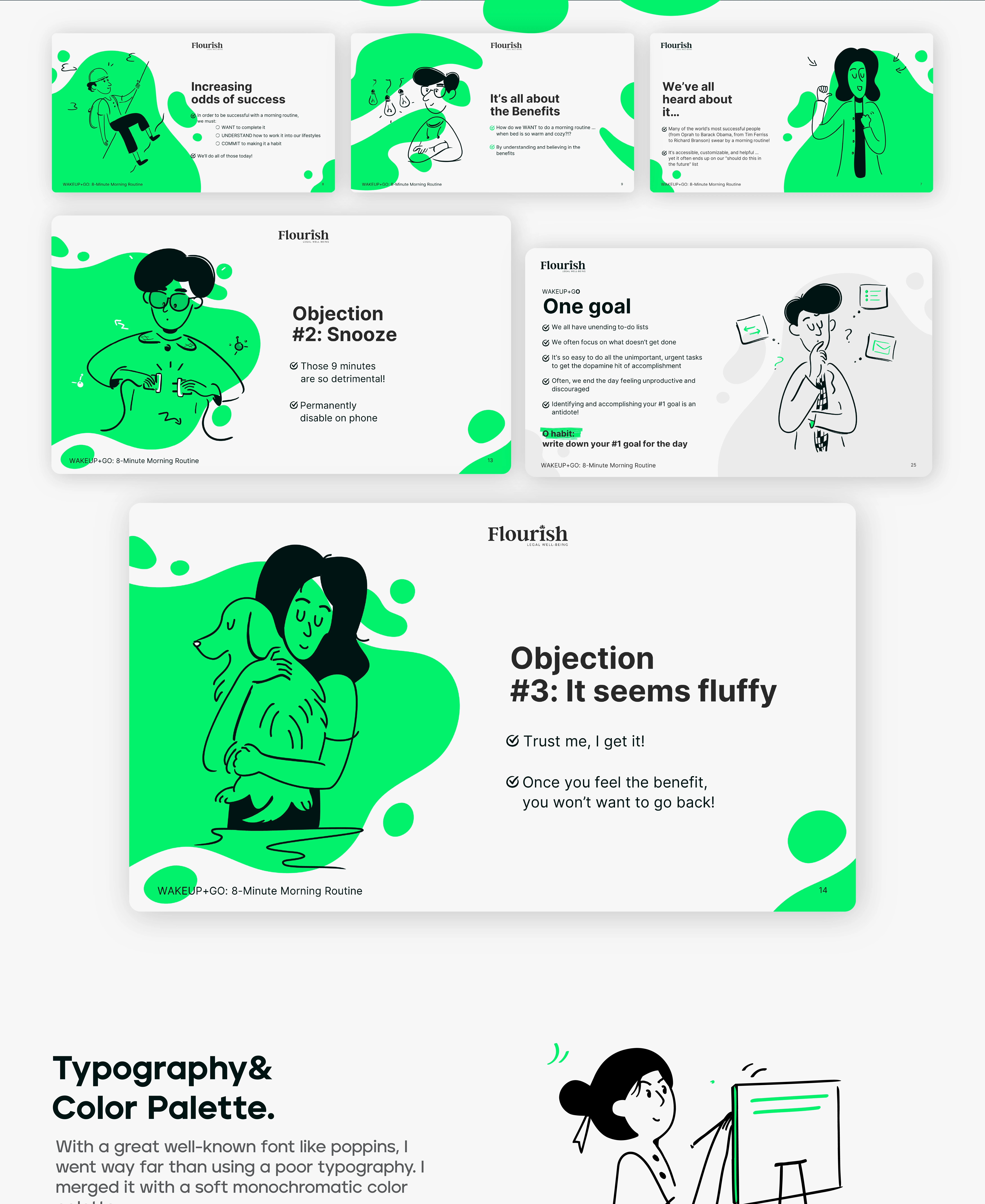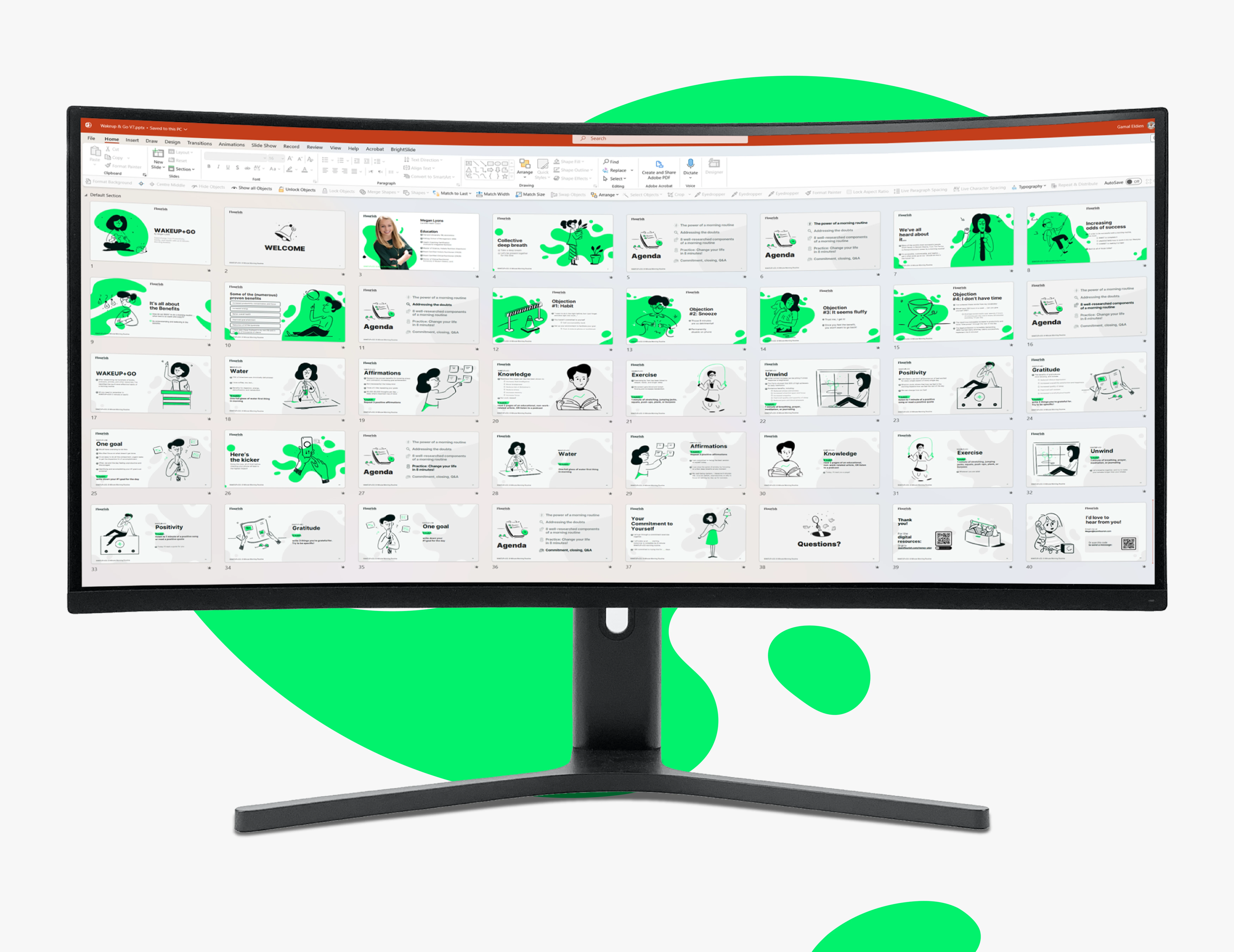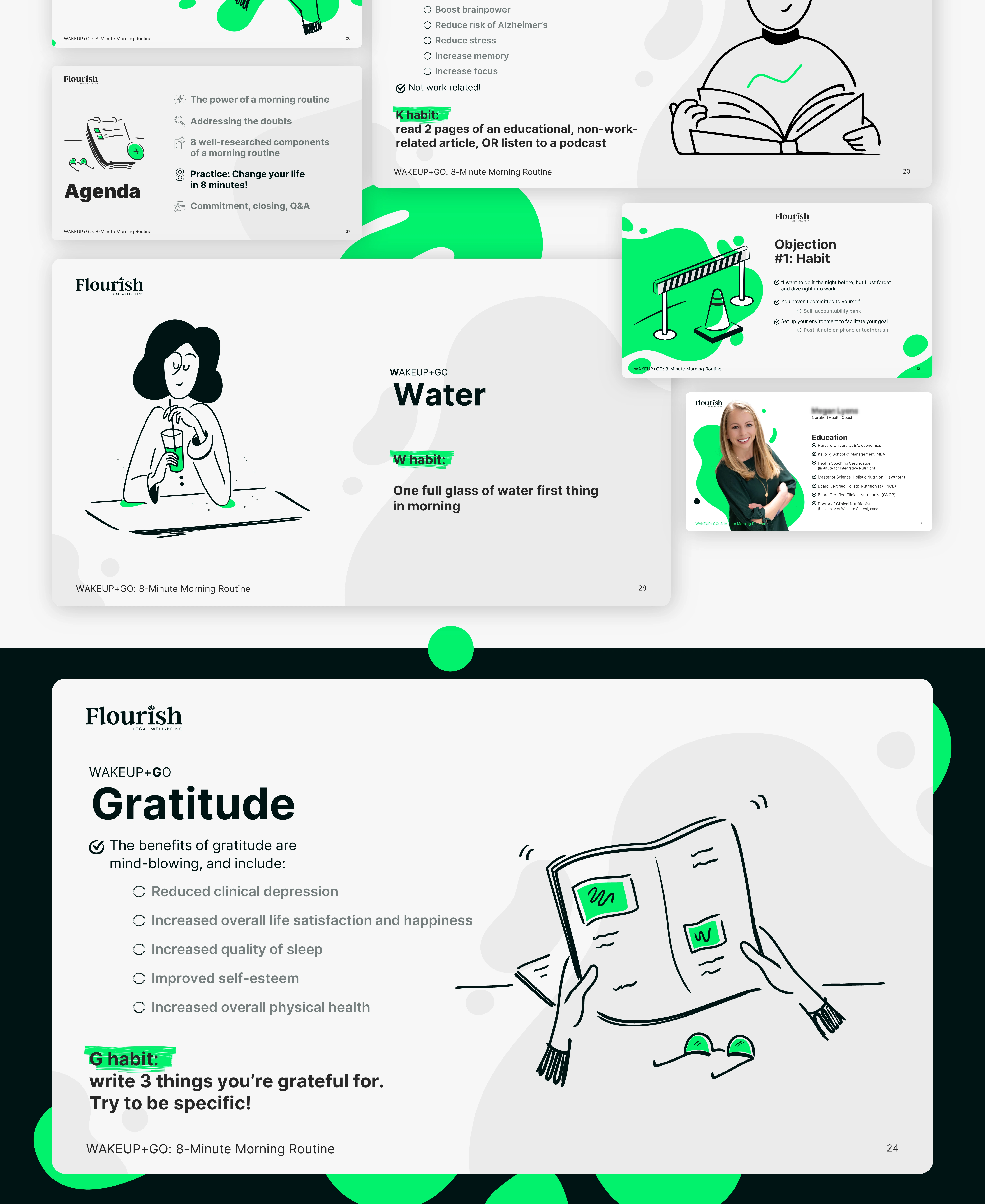 WAKEUP+GO: 8-minute morning routine productivity guide. Clean, minimal PowerPoint with illustrations that clarify key points for maximum focus and impact.