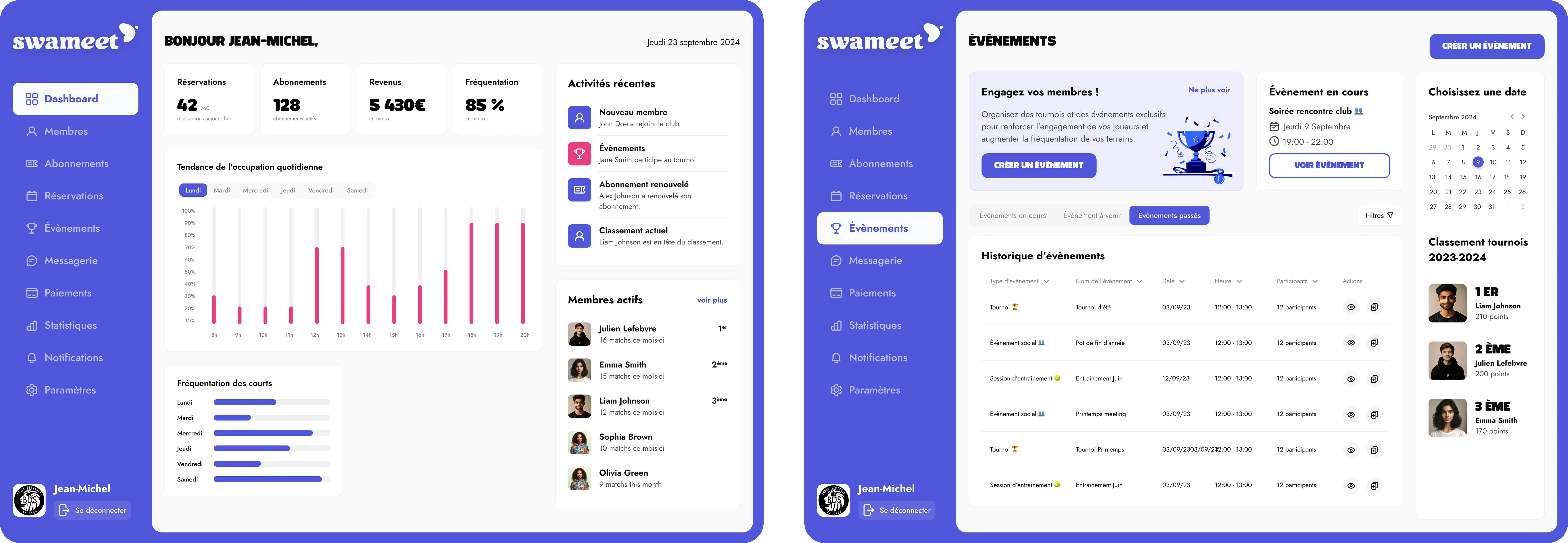 Swameet is a web dashboard built to help communities and organizations manage their padel members more efficiently. It is connected to the Swameet mobile app.