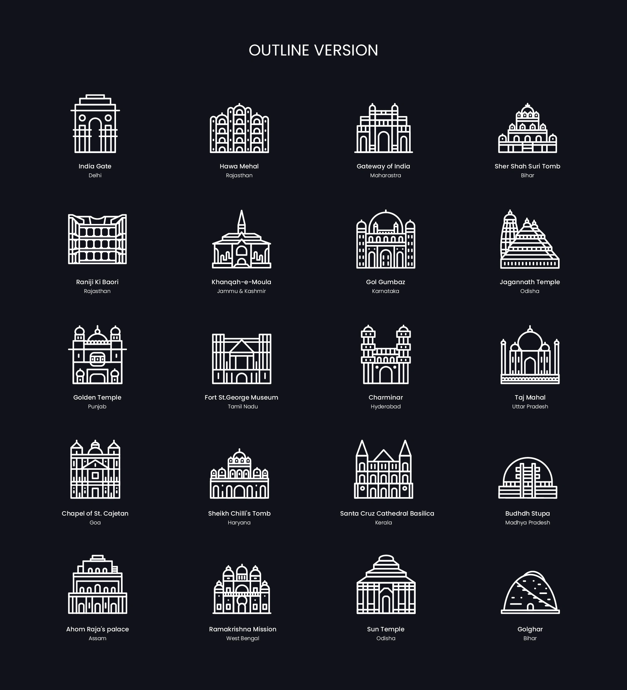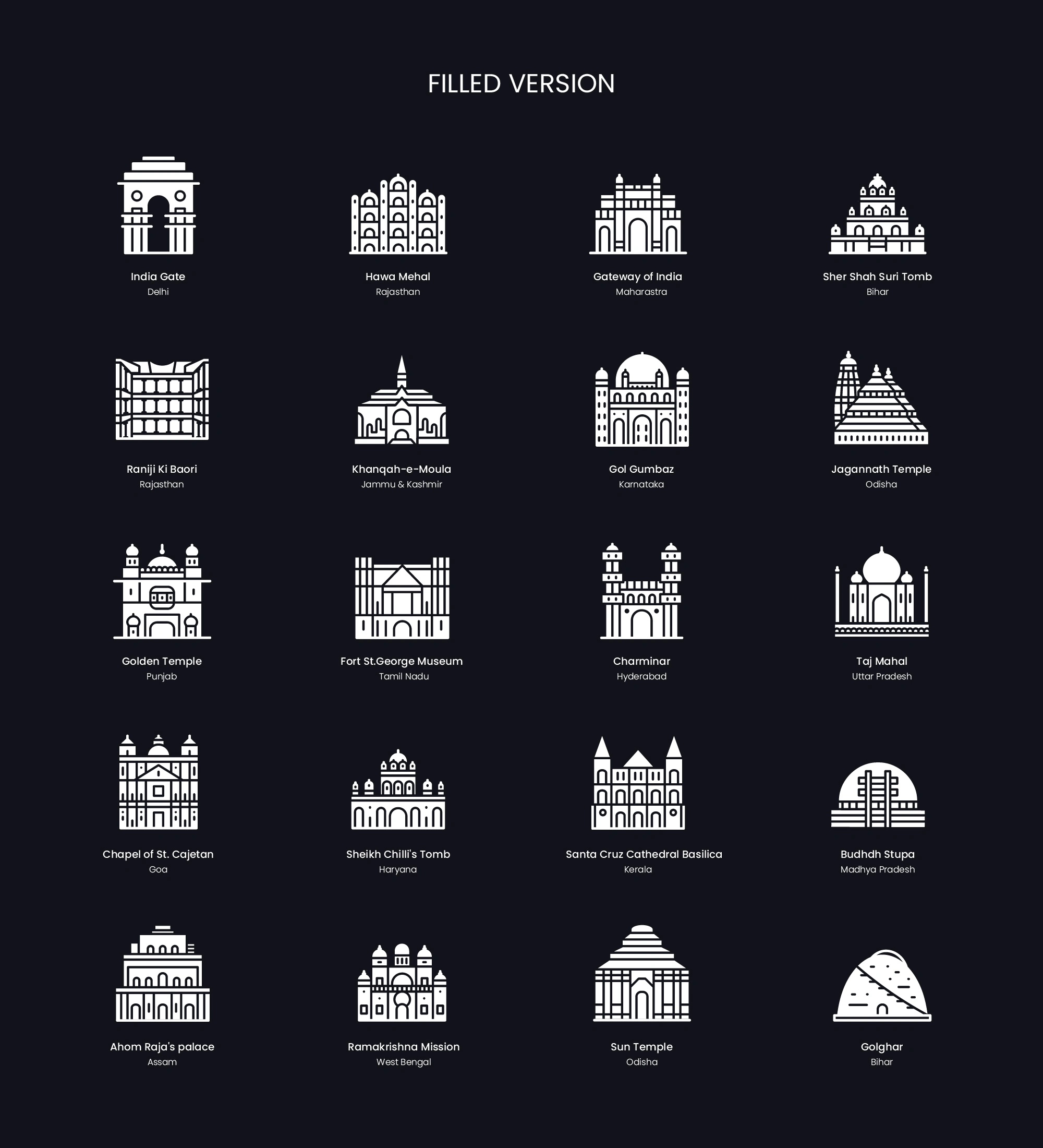 These icons serve as visual tributes to India's rich cultural heritage, characterized by intricate detailing and precision in their artistic rendering. Each icon encapsulates the historical and cultural significance of its respective monument.