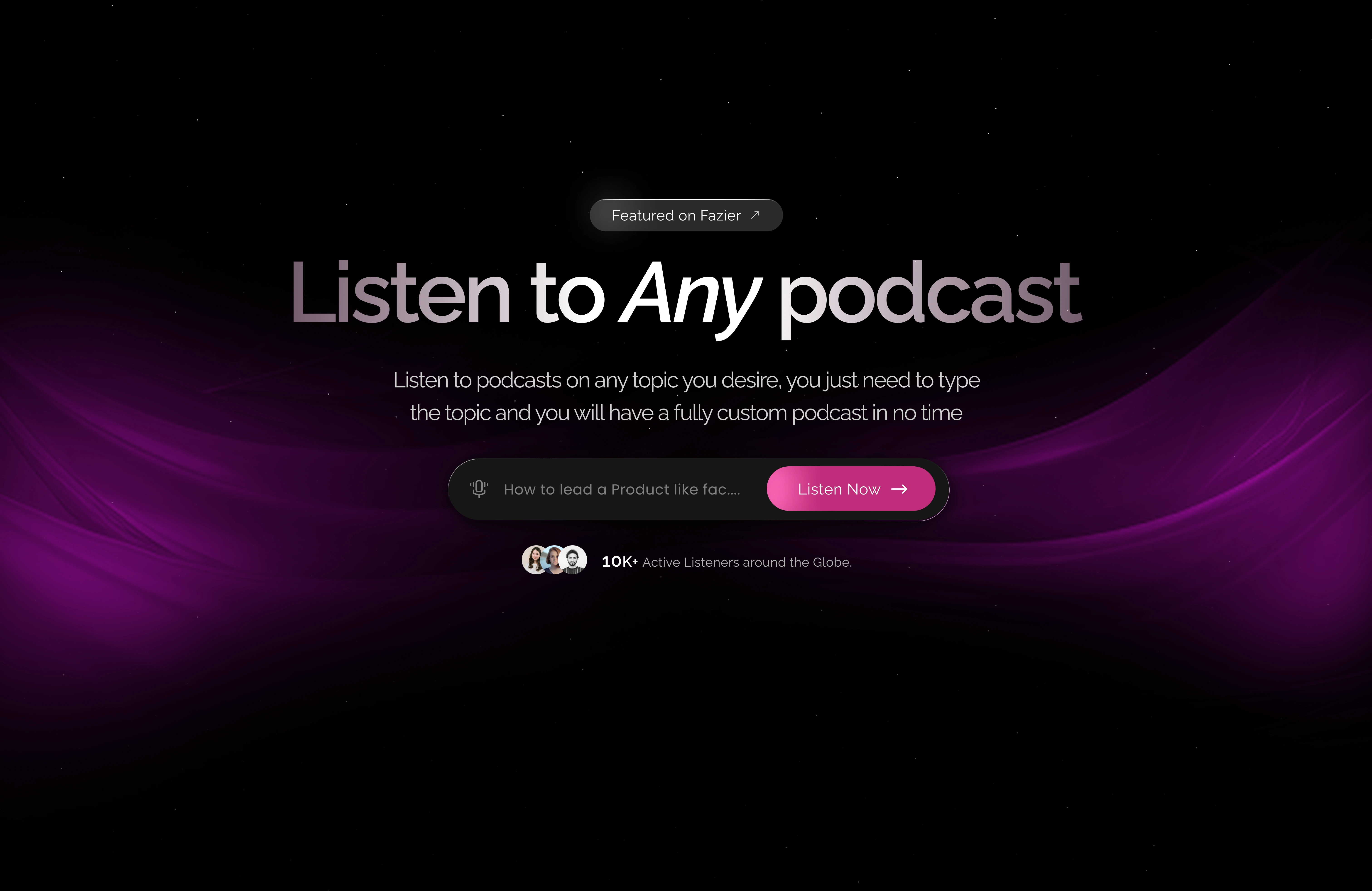 For Lokutr's mock Redesign, I designed an immersive, cosmic-themed landing page that puts user curiosity at the center. With a sleek dark interface, vibrant gradients, and smooth UX, users are encouraged to simply type a topic and instantly generate a custom podcast 🌌. The clean layout, bold typography, and interactive “Listen Now” CTA make the journey from curiosity to content seamless and exciting ✨. With over 10K+ active listeners shown as social proof, the design subtly builds trust while keeping the experience fun and futuristic 🚀.