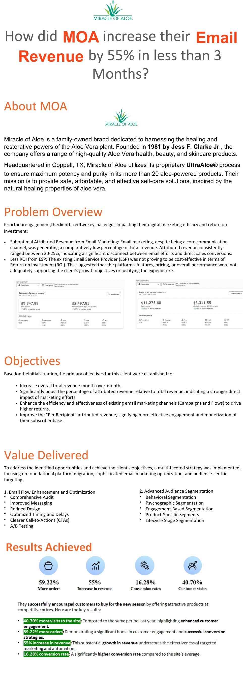 Boosted client email revenue contribution from 25% to 58% of total sales by overhauling their ESP, implementing advanced segmentation, automation & A/B testing.