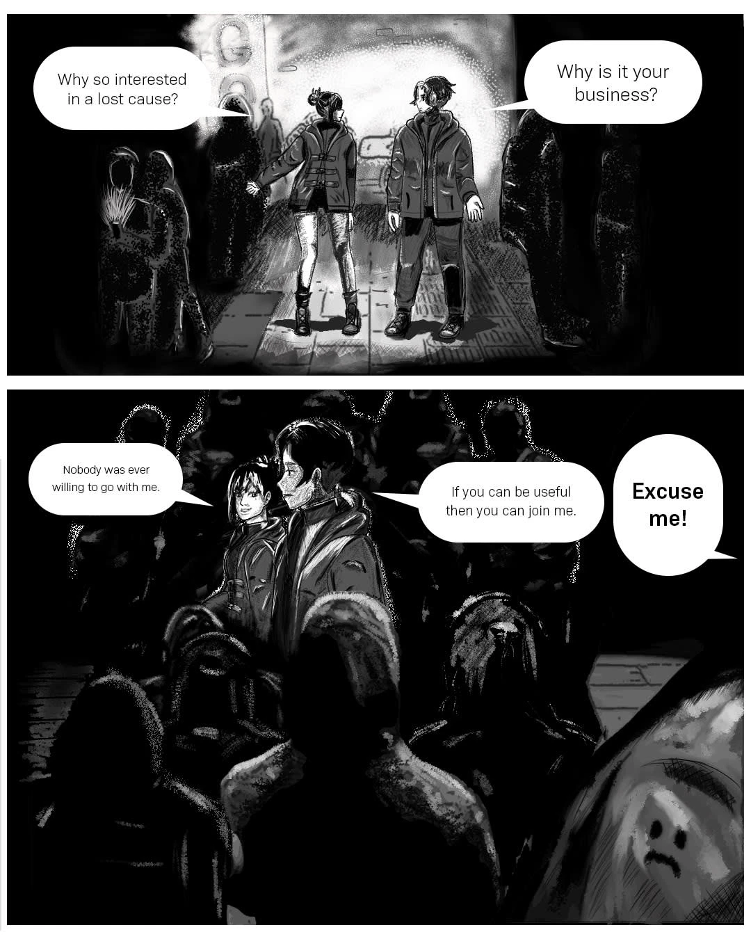 Short-form comic written and illustrated by me, presenting the story of the first encounter with the deity and the forming of an organization called the Urbex Rescue Unit. That organization's jacket would be the apparel connected to this lore.